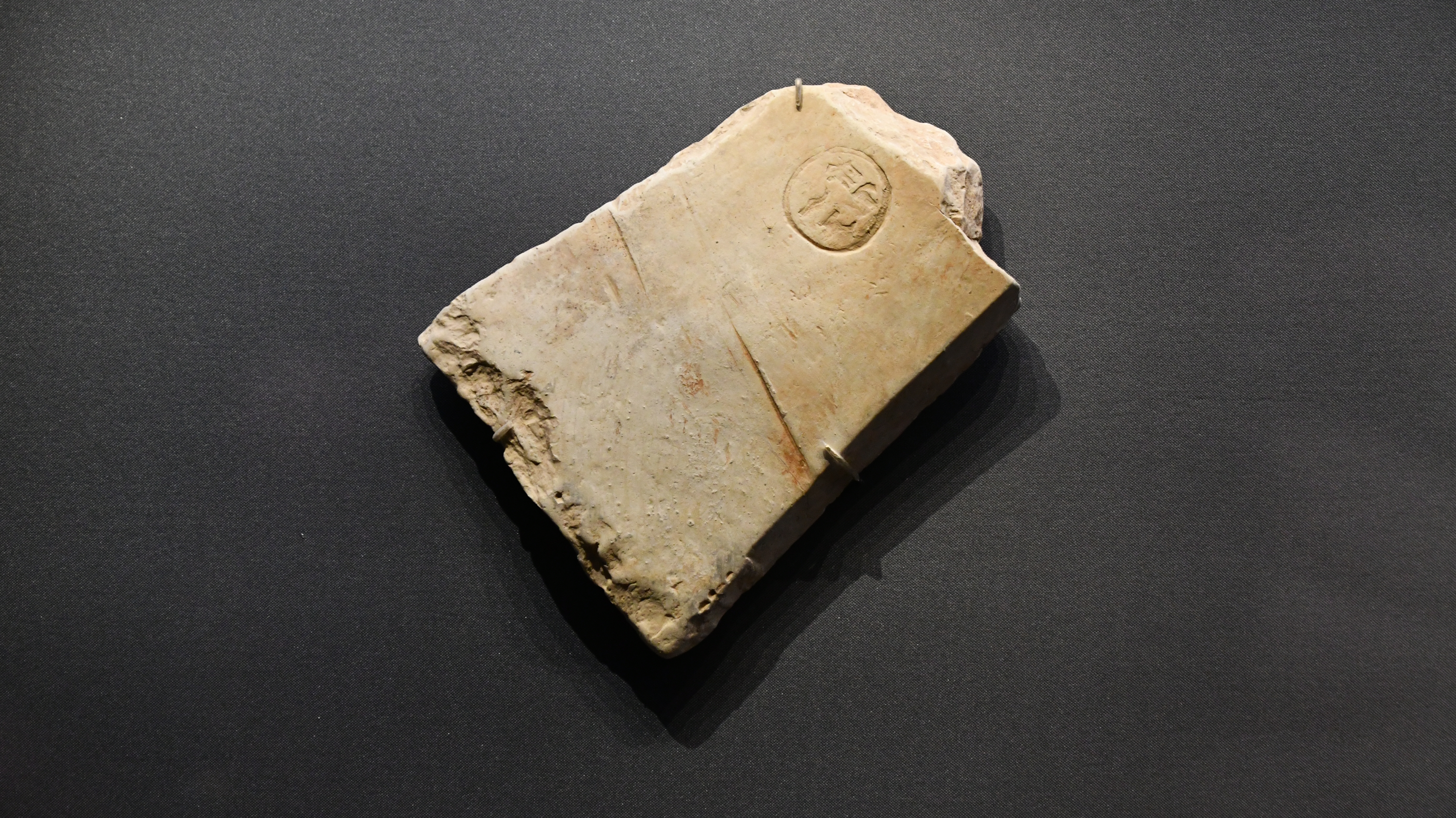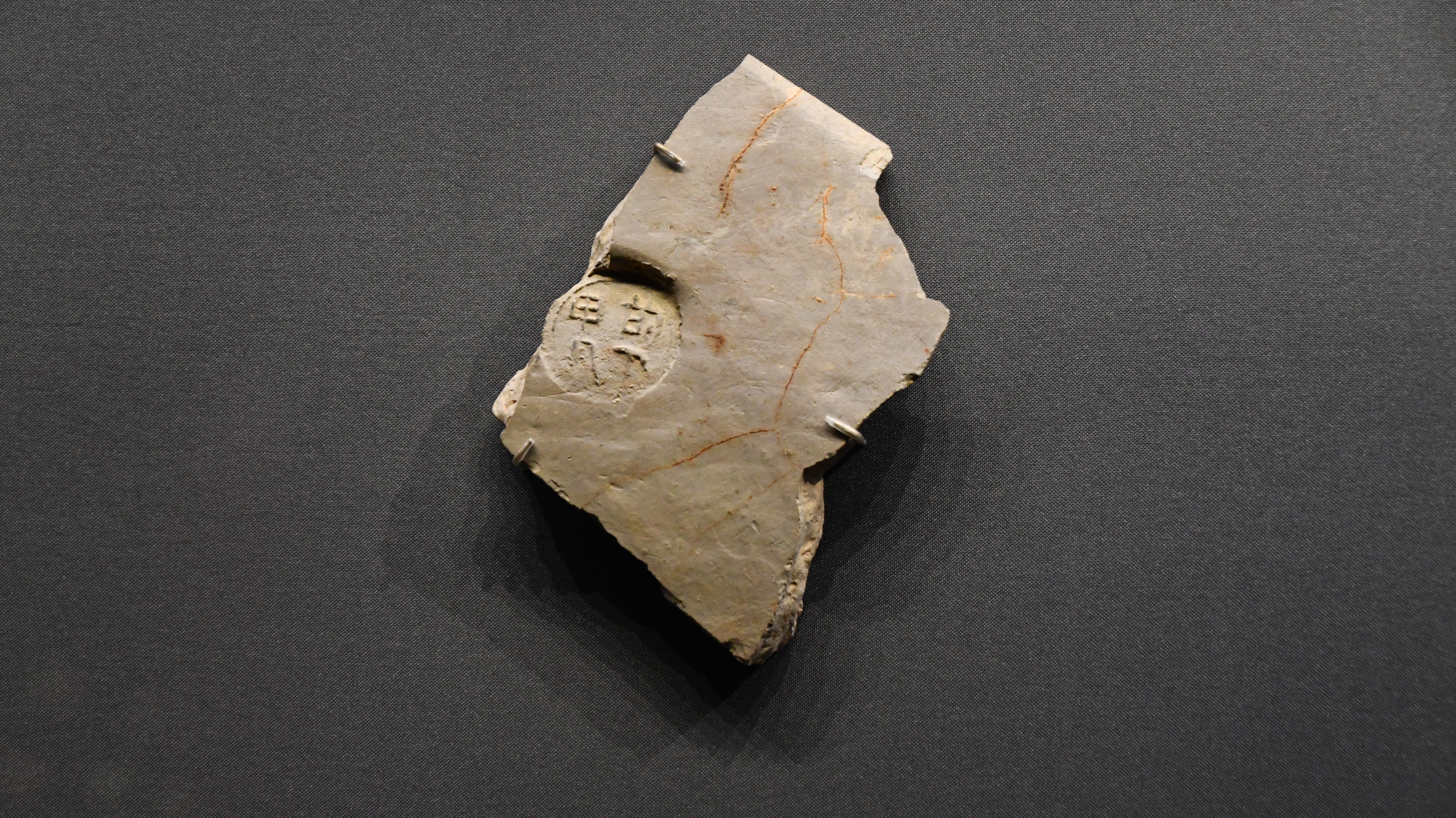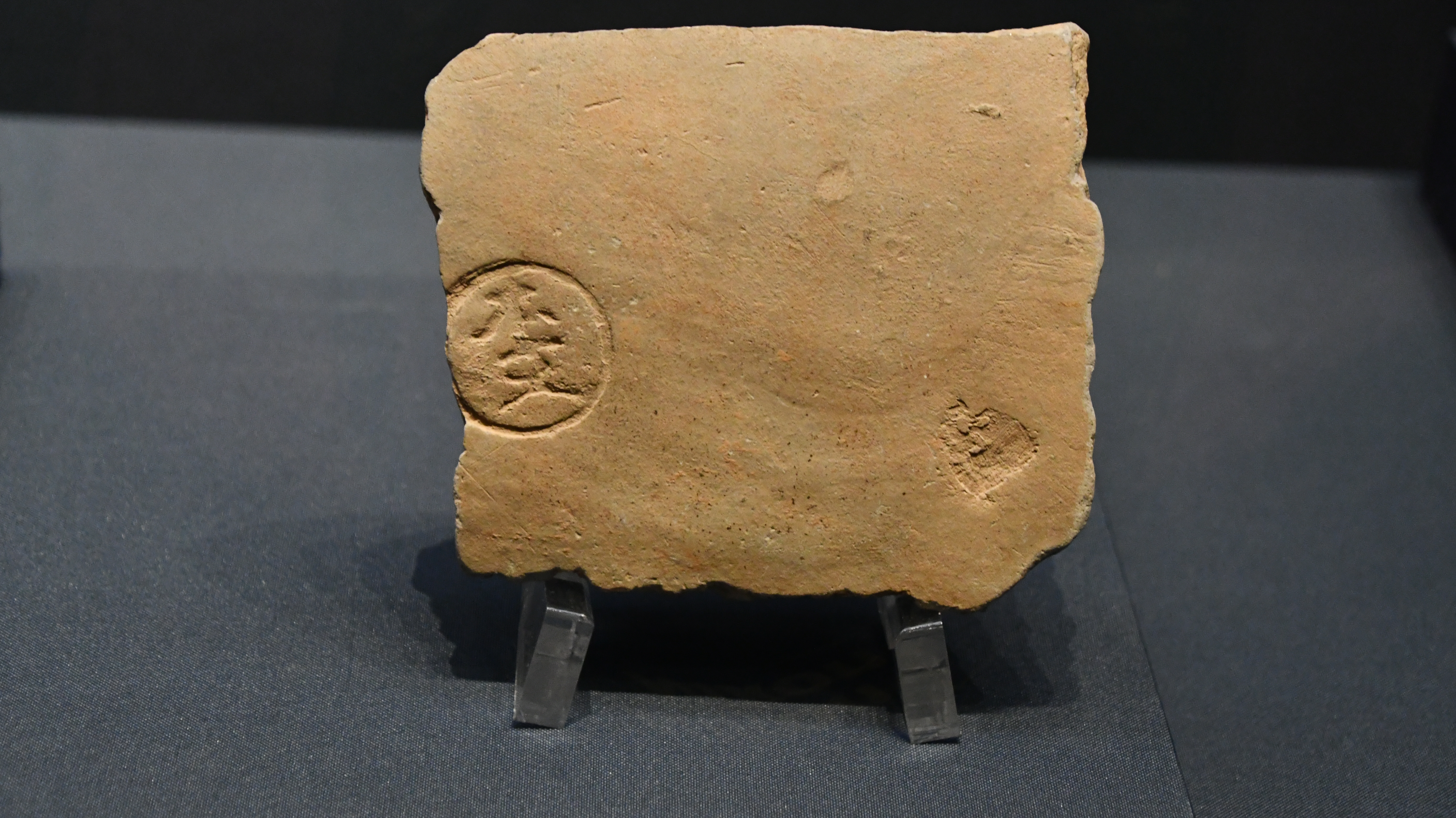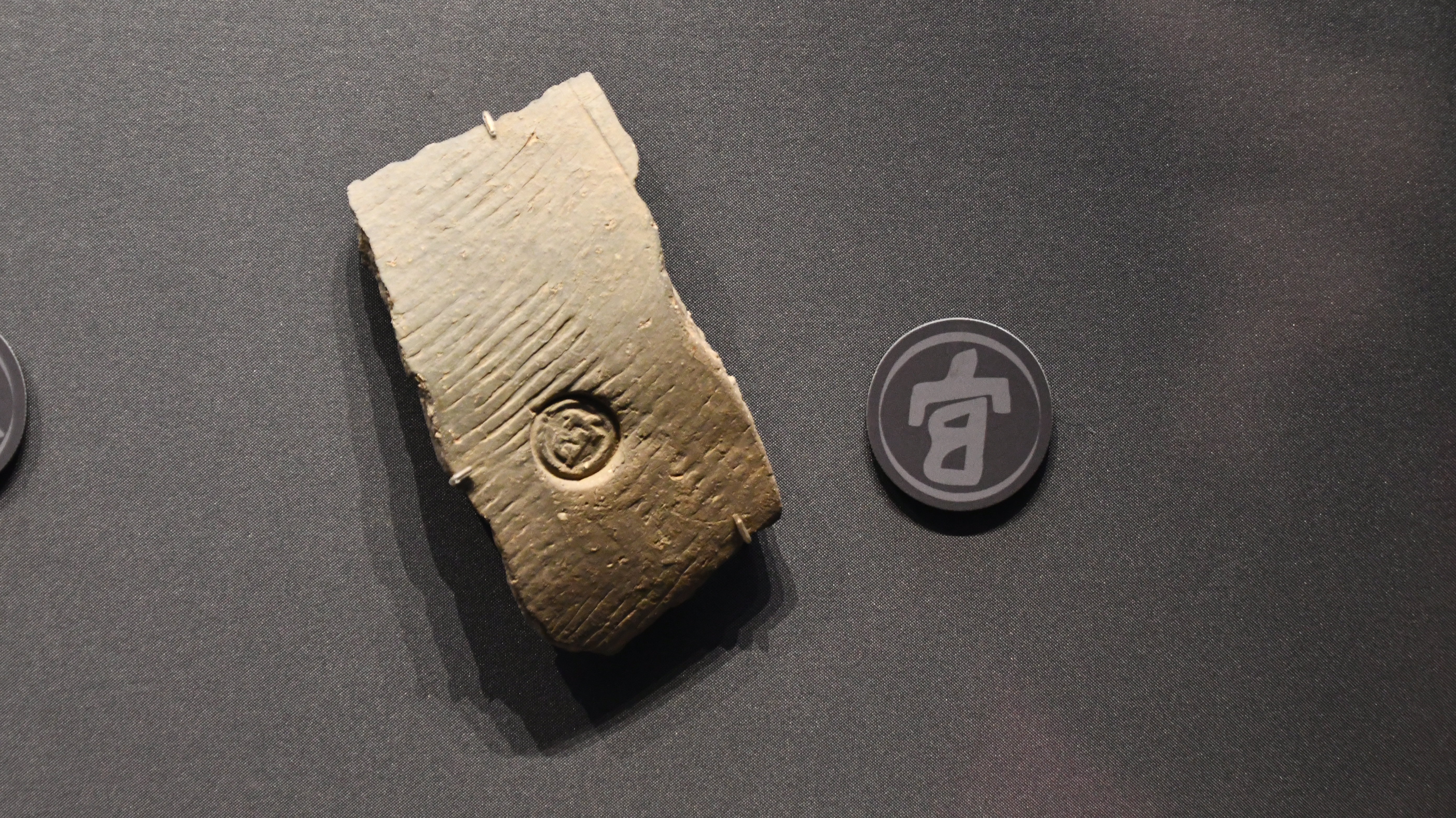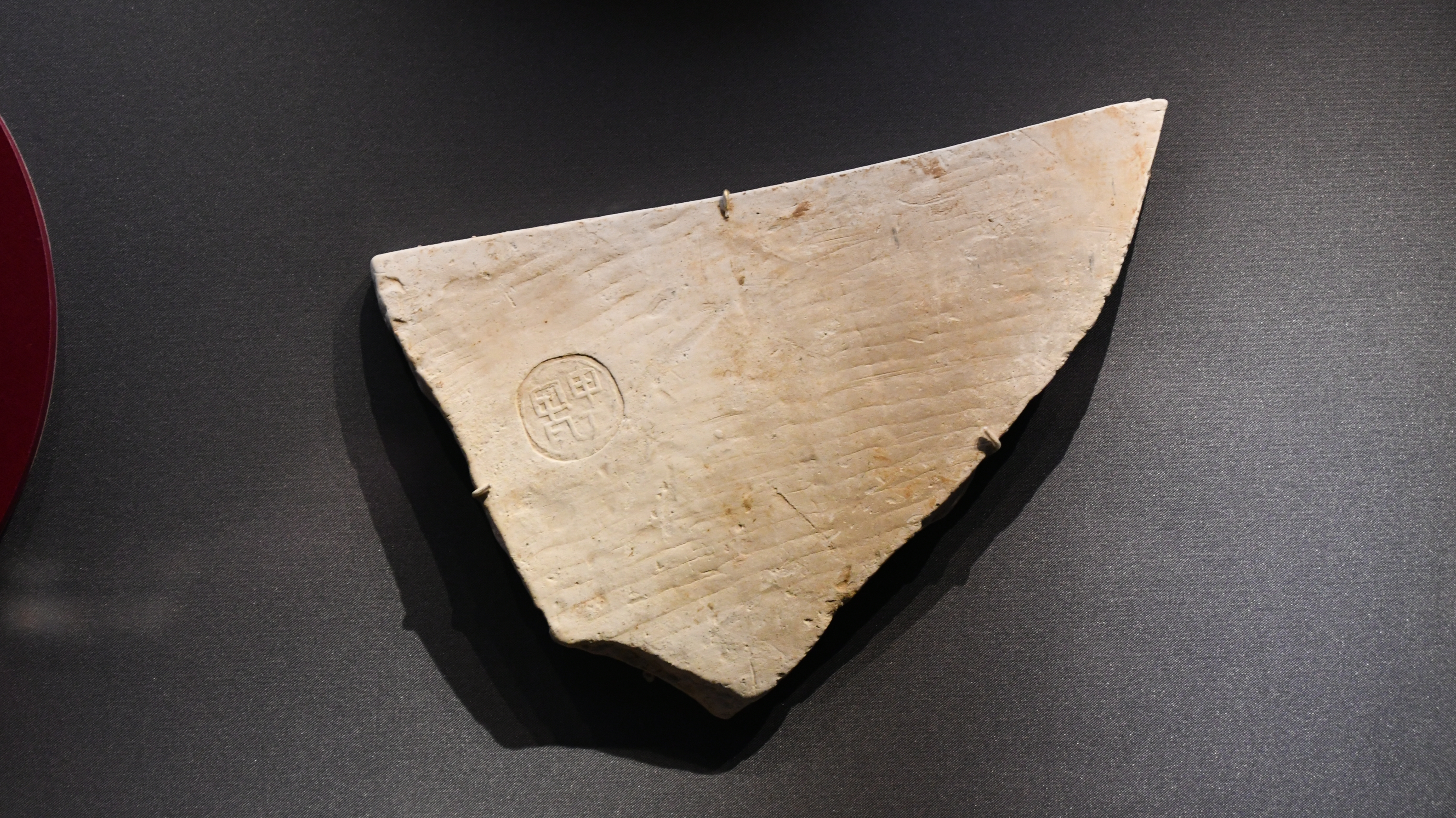 ◆ 좌: "병(丙)"이 찍힌 기와 / 백제 왕궁리유적 / 국립익산박물관