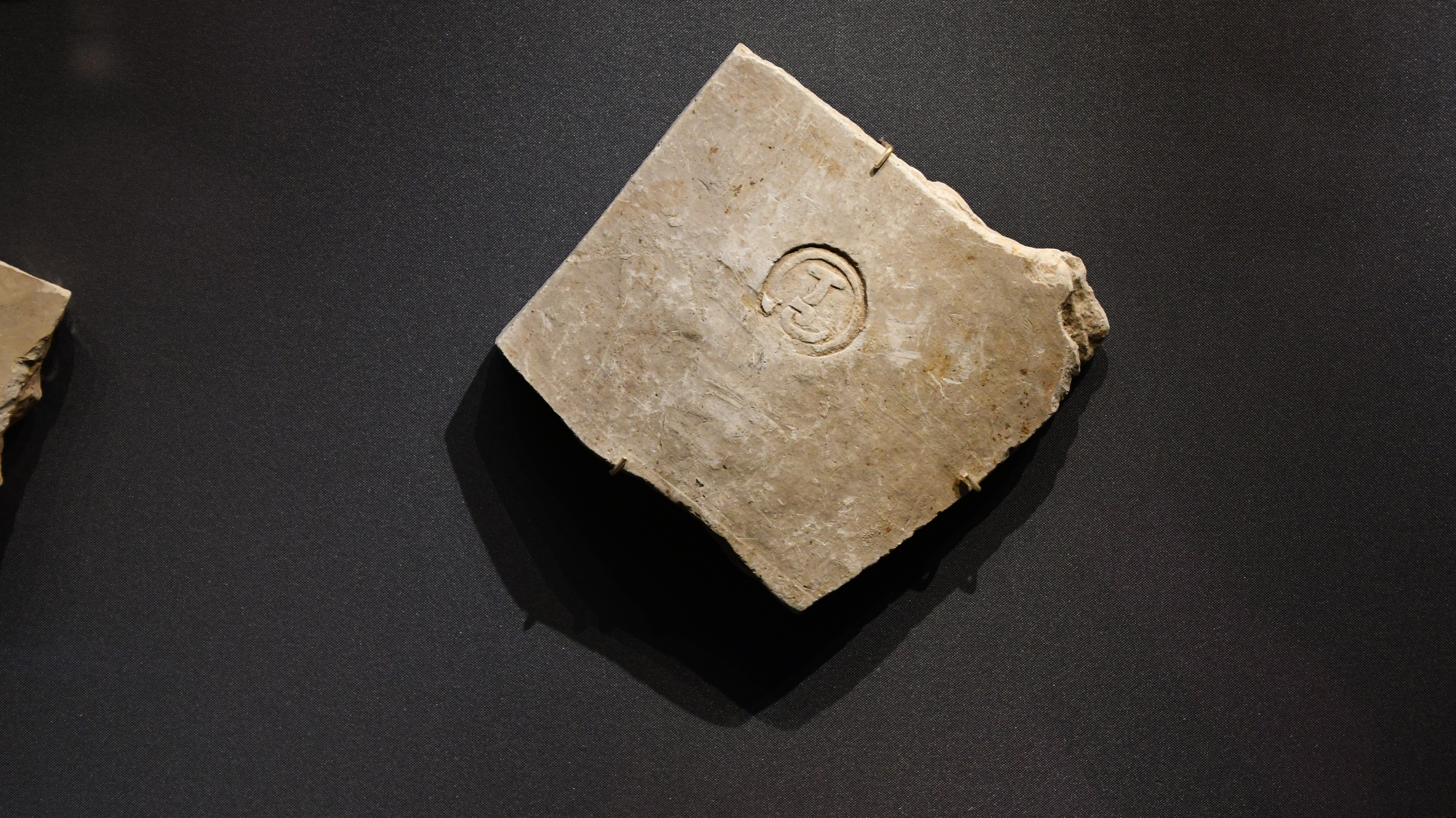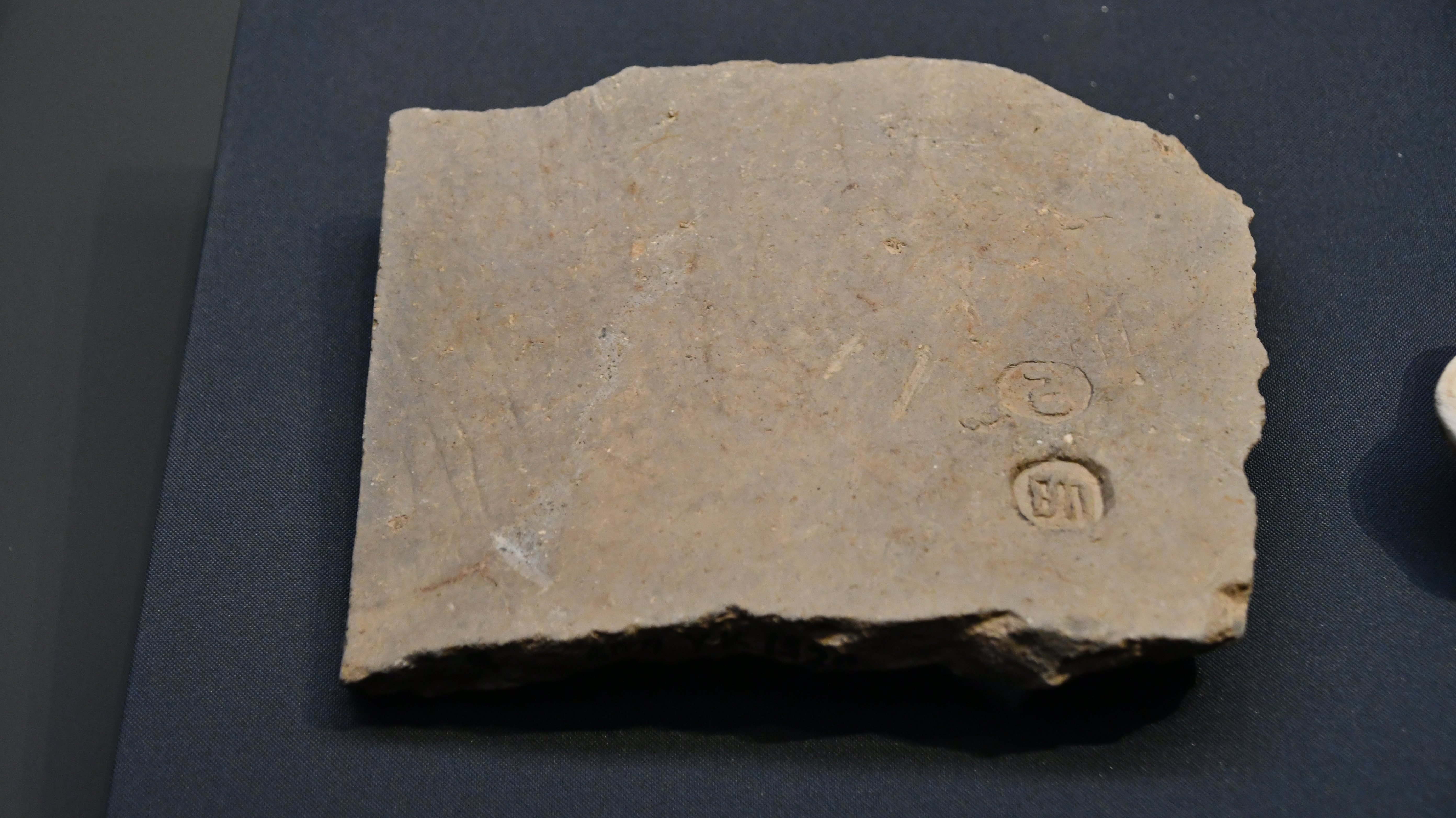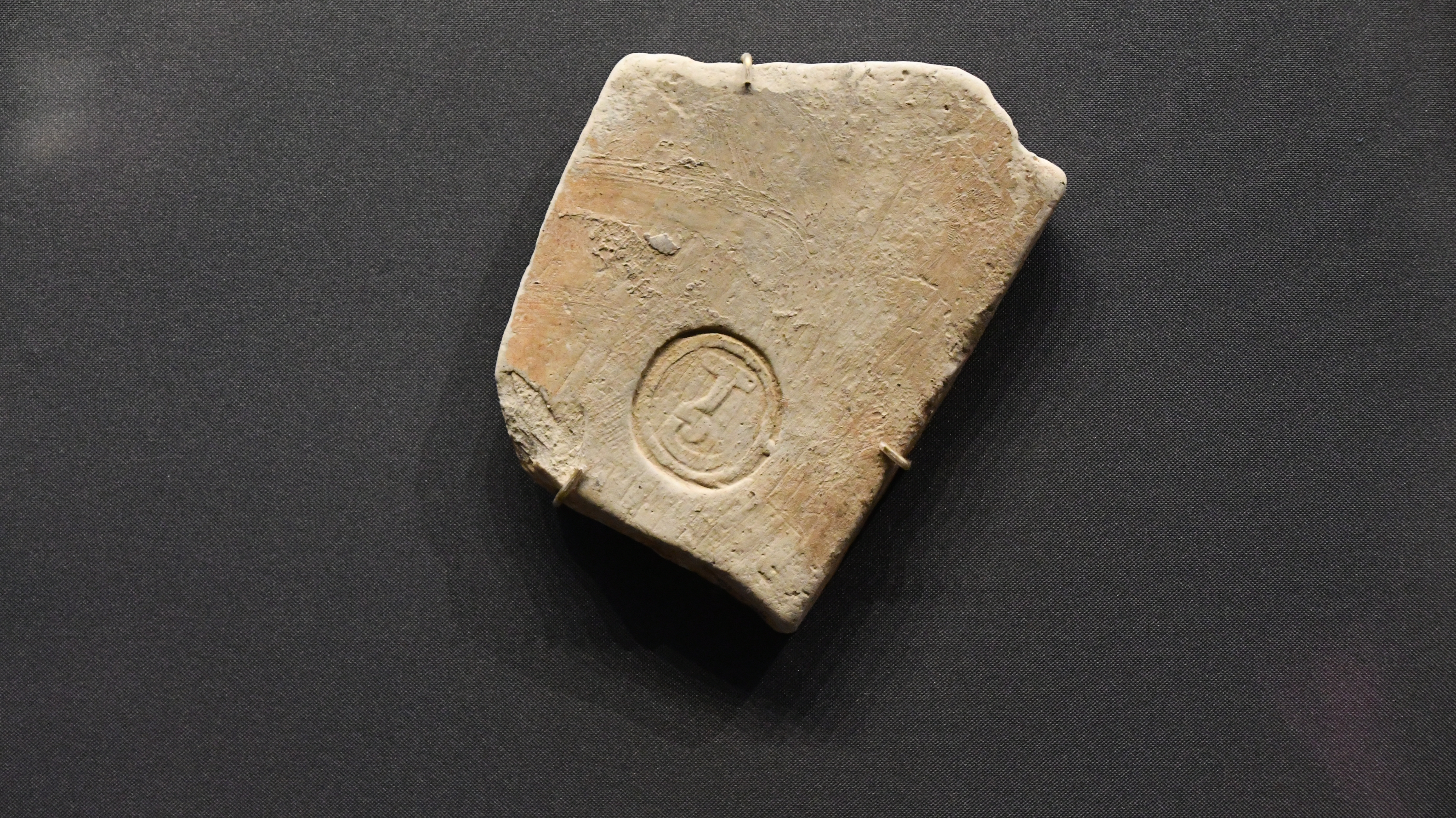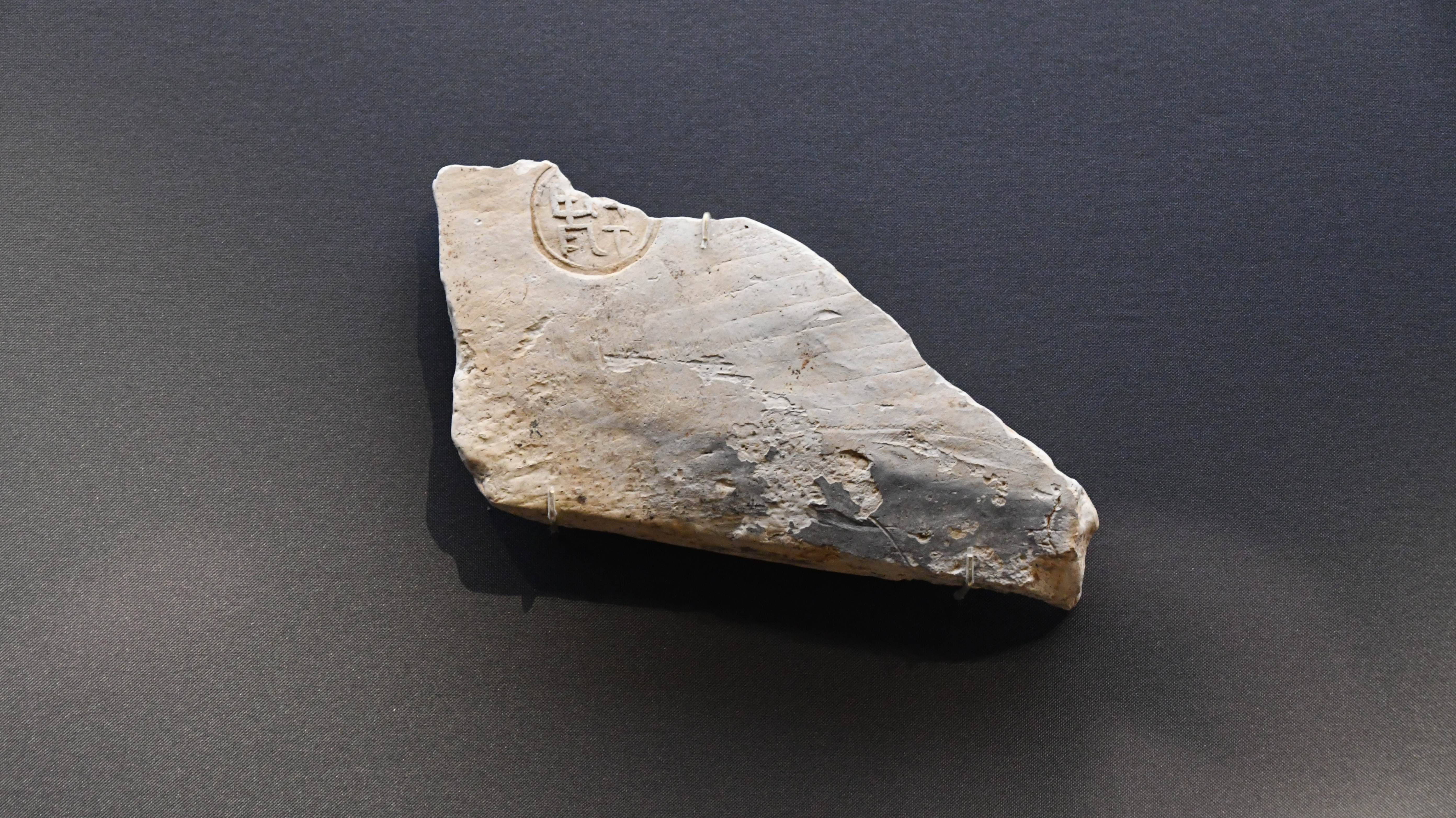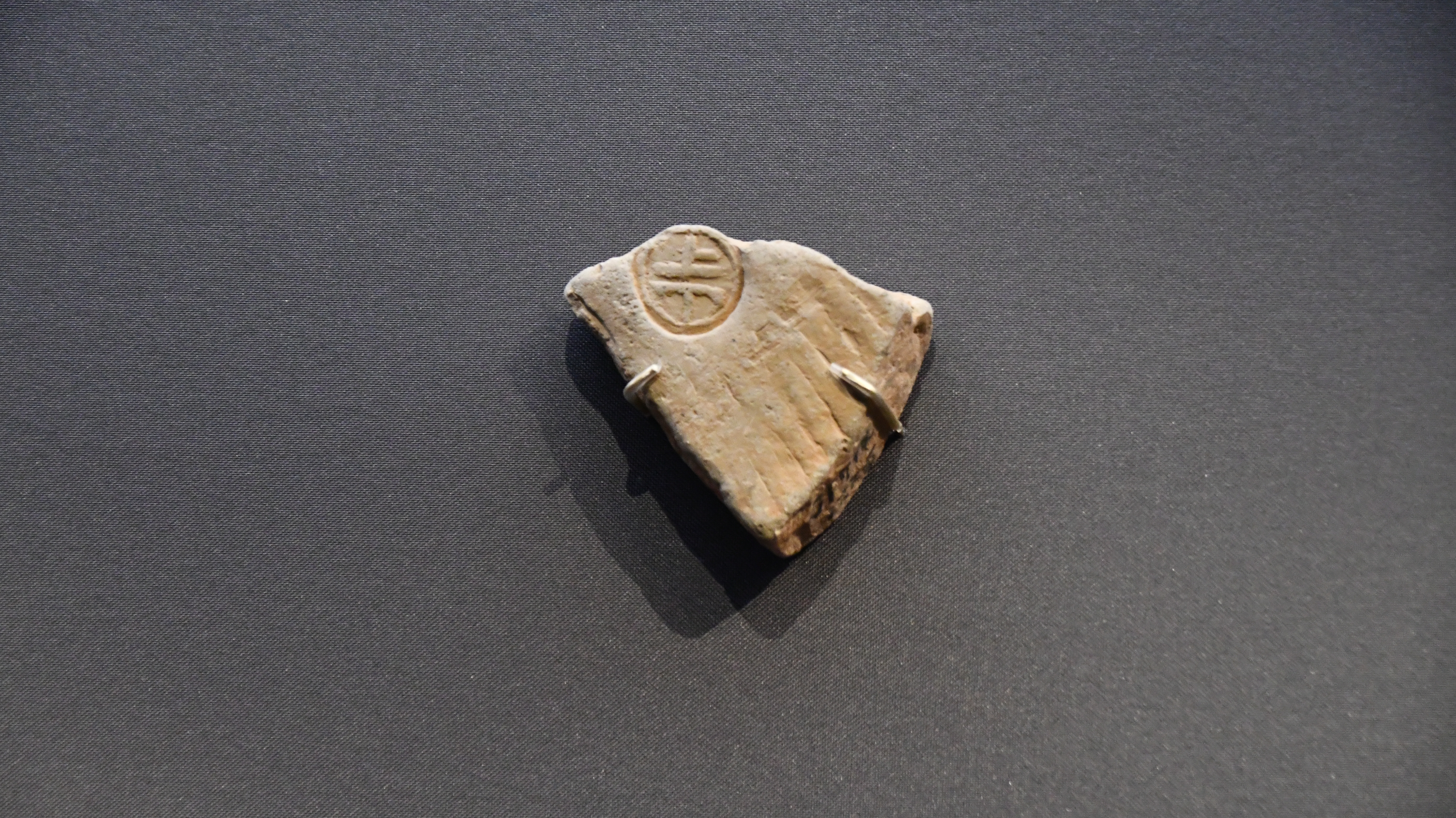◆ 좌: "병(丙)"이 찍힌 기와 / 백제 왕궁리유적 / 국립익산박물관