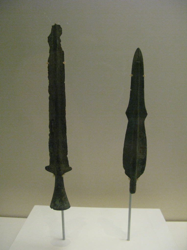 - 검(劍)은 몸에 차고 다니는 몸 근처에서 보호하는 병기로 참살(斬殺:베어 죽임)과 자살(刺殺: 찔러 죽임)에 사용되었다. 청동검은 서주 초기에 출현하기 시작하여 춘추 말기부터 전국 시기에 성행하였으며, 한 대(漢代) 이후 청동검이 차츰 철검(鐵劍)으로 대체되었다.