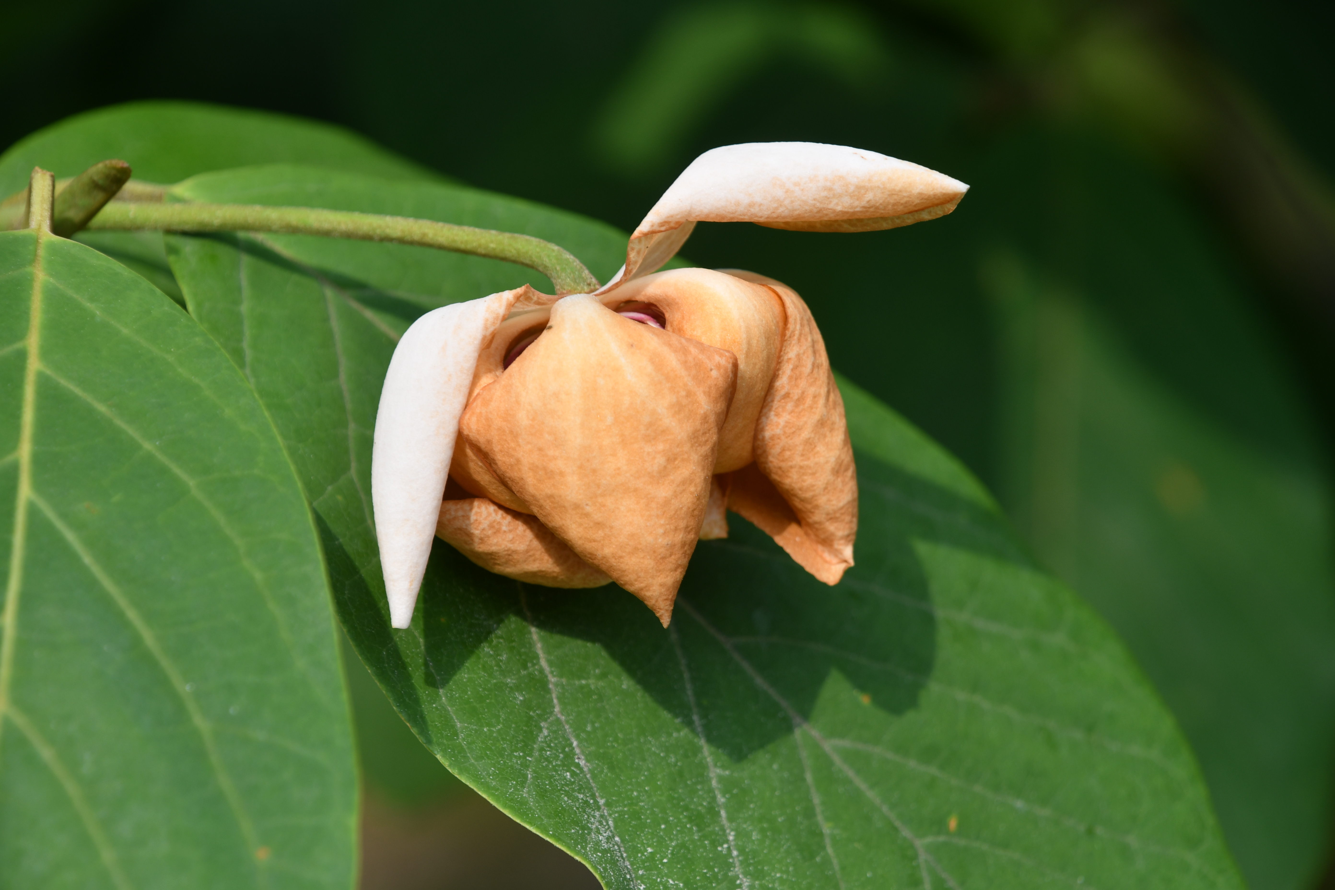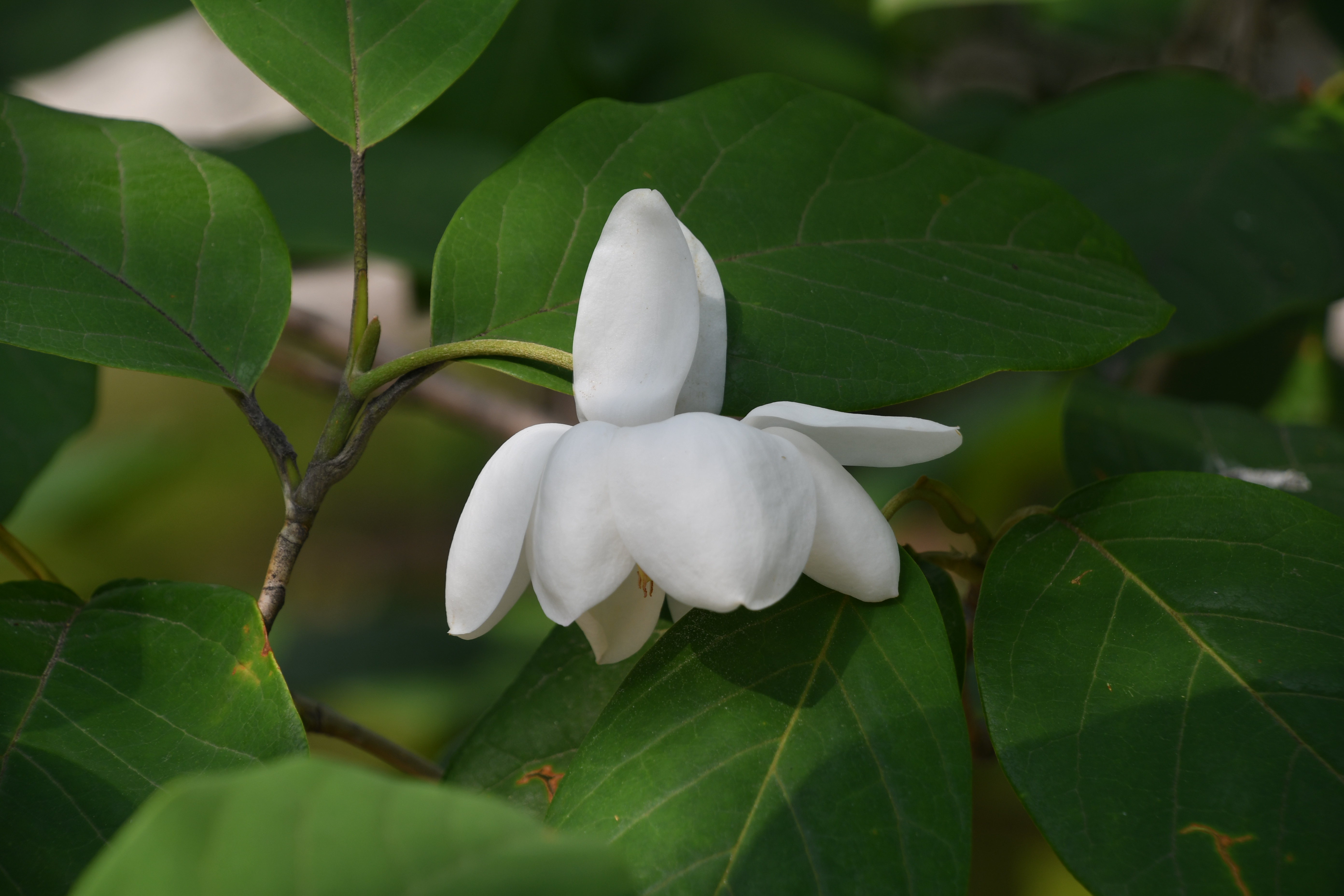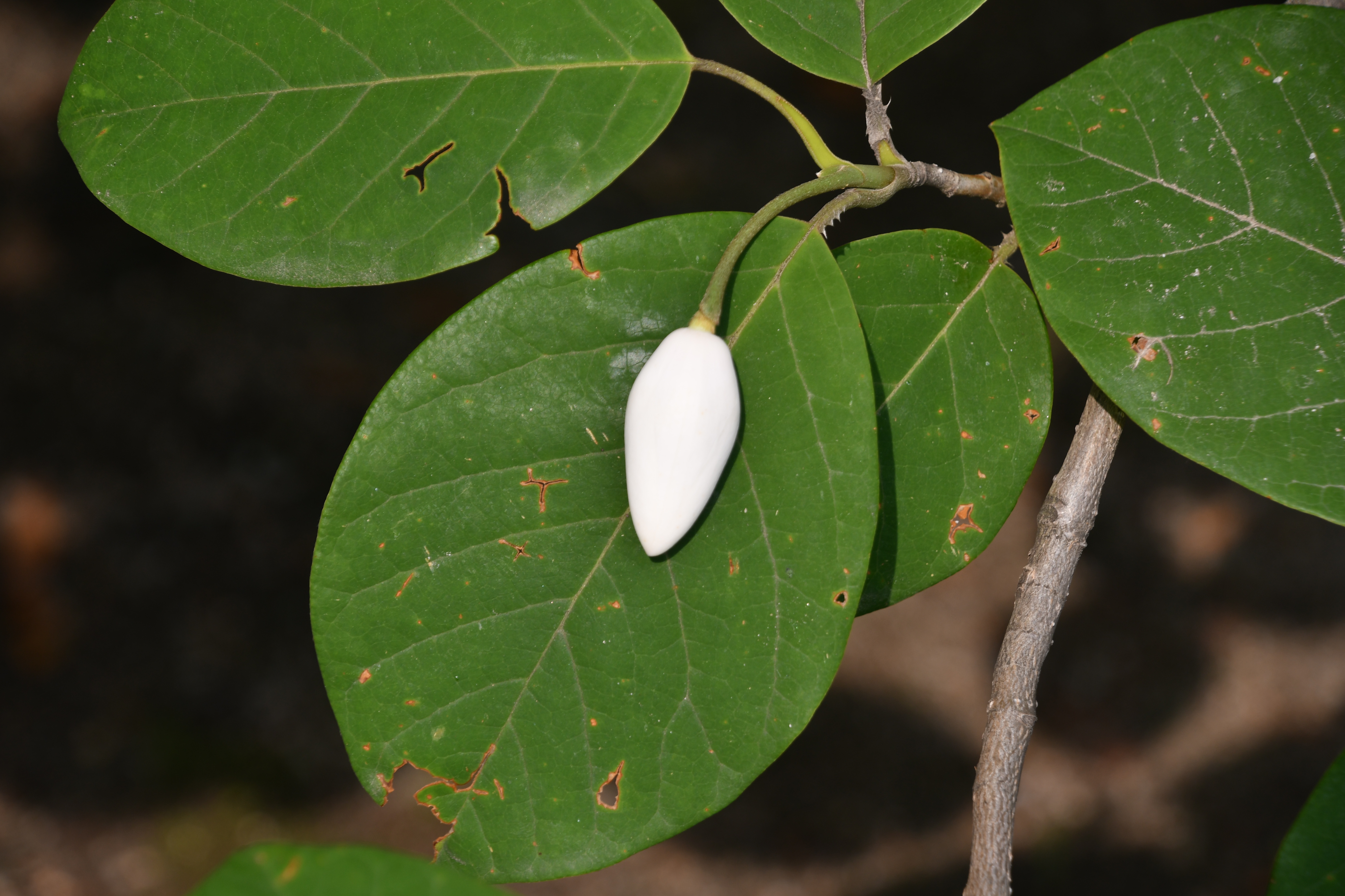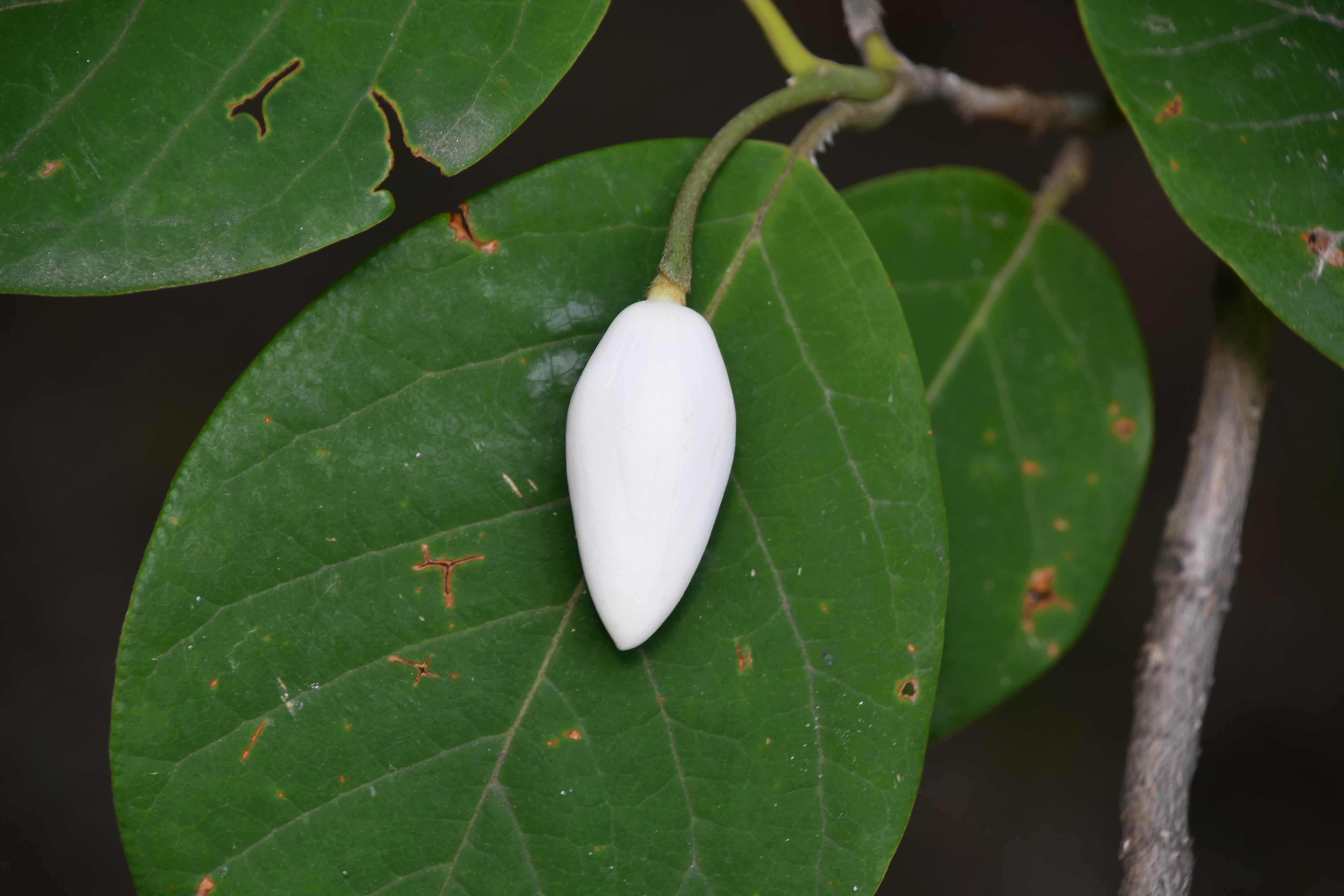 - 아직 피기 전에 모습이 목련이나 일본목련과 다르게 겉에 껍질이 없고 순백색이다. 꽃은 가지에서 길게 자란 꽃대가 1개씩 나온다.