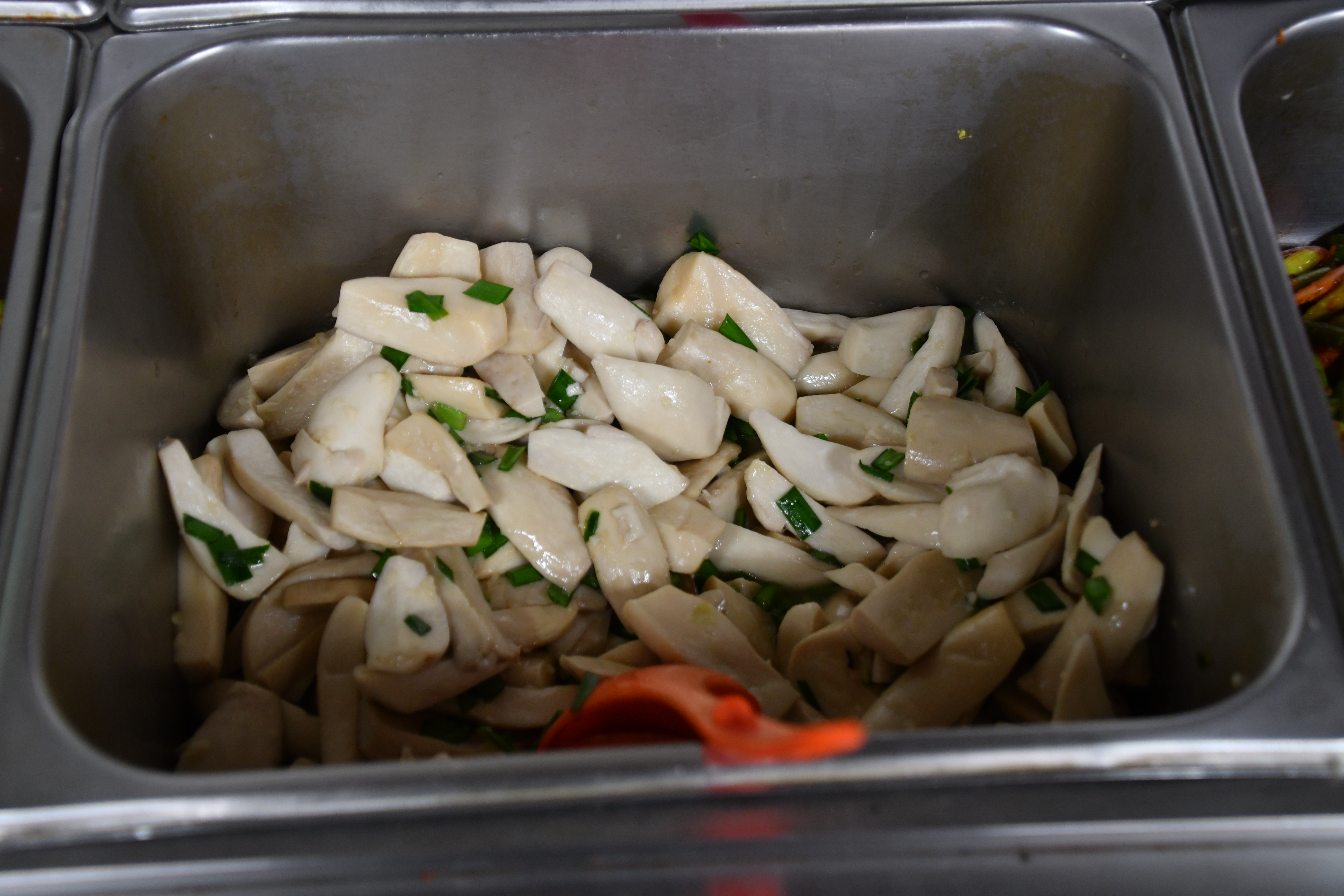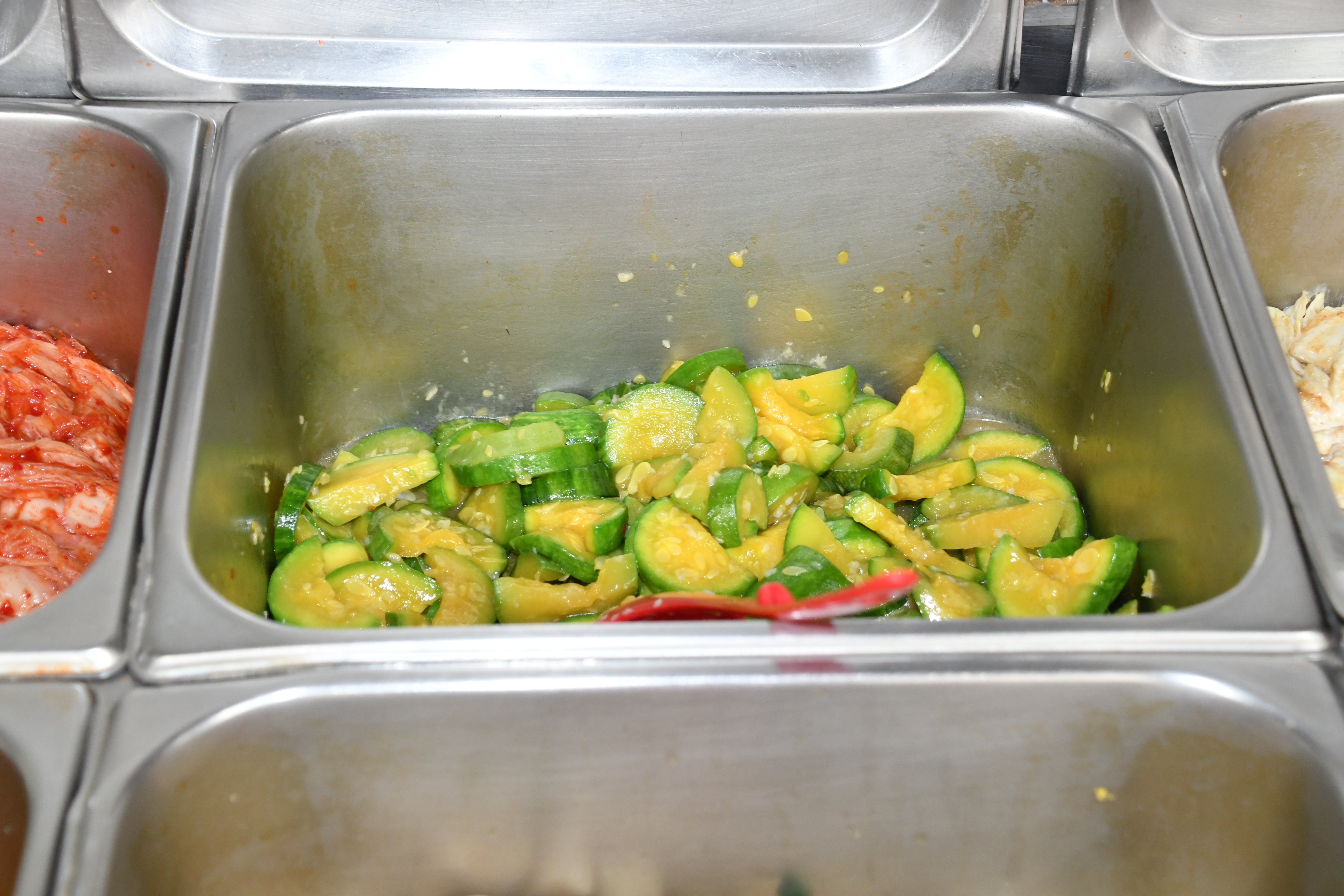 # 앞줄: 다다기오이 무침, 새송이버섯볶음, 마늘쫑새우볶음.