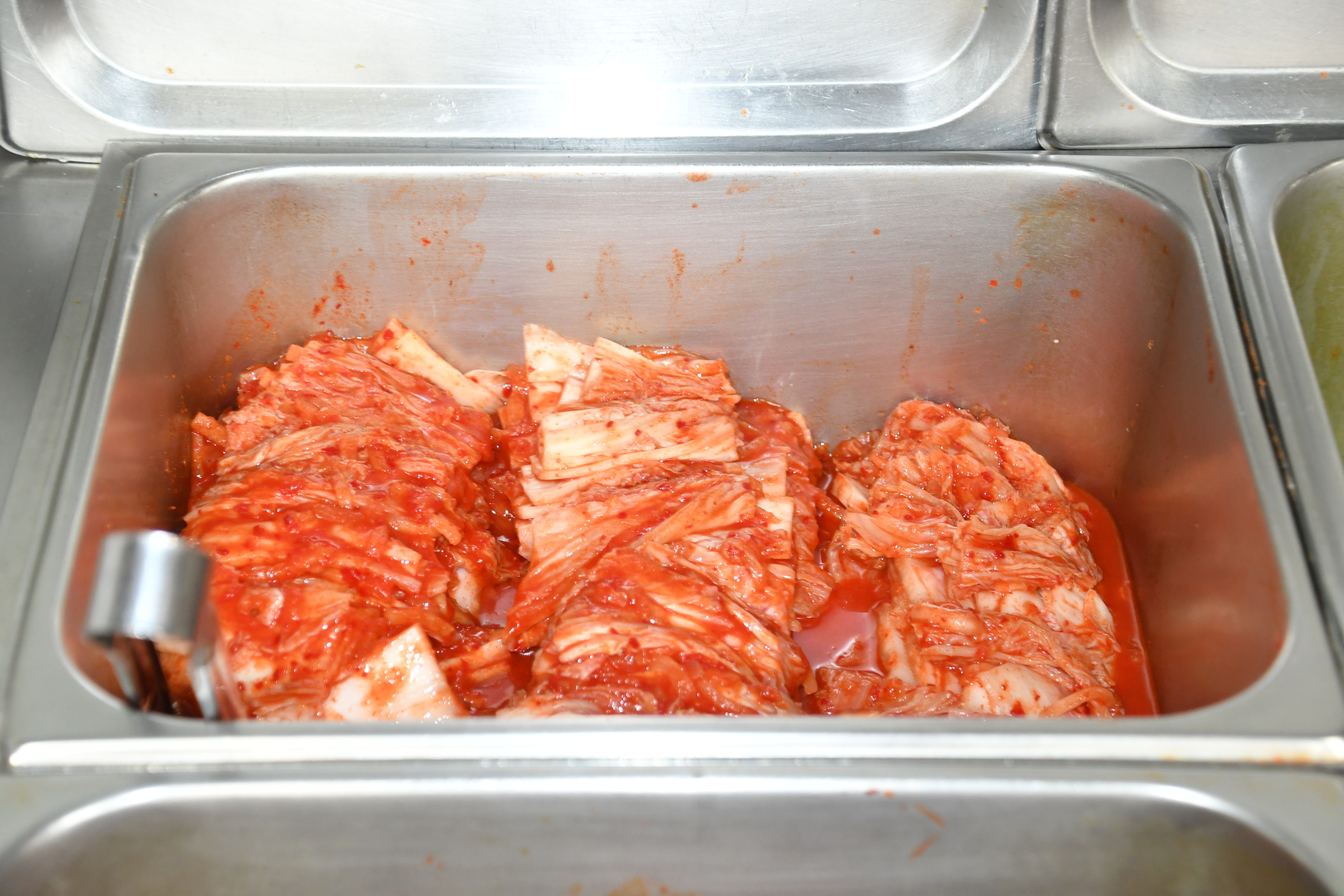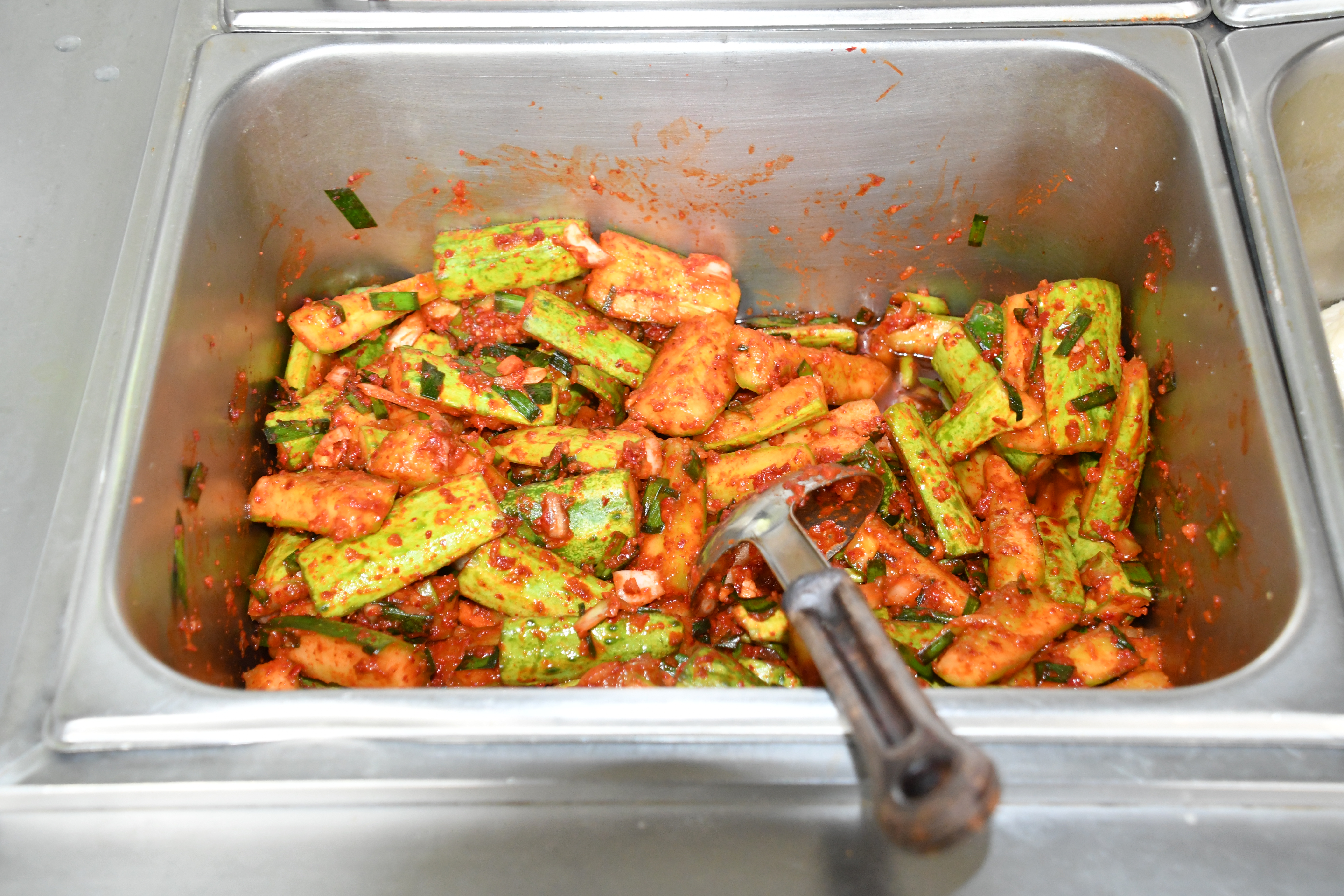 # 뒷줄: 고정반찬 배추김치, 애호박볶음, 마요네즈 사라다