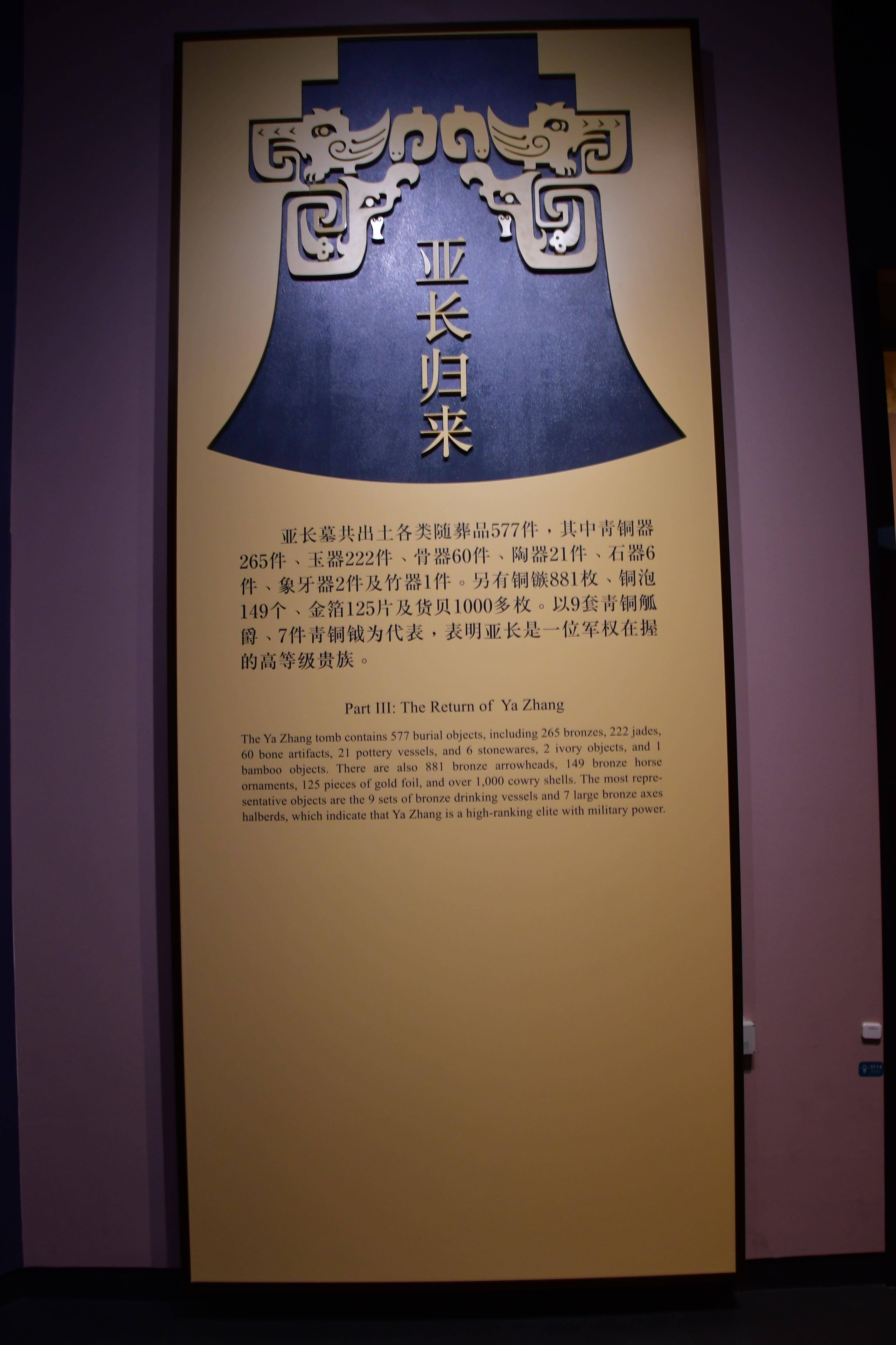 - 아창(亞長)의 무덤에서는 모두 577점의 각종 수장품이 출토되었다. 그중에 청동기 265점, 옥기 222점, 골기(骨器) 60점, 도기(陶器) 21점, 석기 6점, 상아기 2점 및 죽기(竹器) 1점이다. 이외에도 청동 화살촉 881점, 청동포(靑銅泡)* 149점, 금박 125점 및. 화패(貨貝) 1,000여 점이 출토되었다. 9세트의 청동 고(觚)와 작(爵), 7건의 청동전(靑銅錢)으로 대표적이다. <이들 유물은> 아장이 1명의 군권의 장악력이 있는 높은 등급의 귀족임을 밝혀주고 있다.