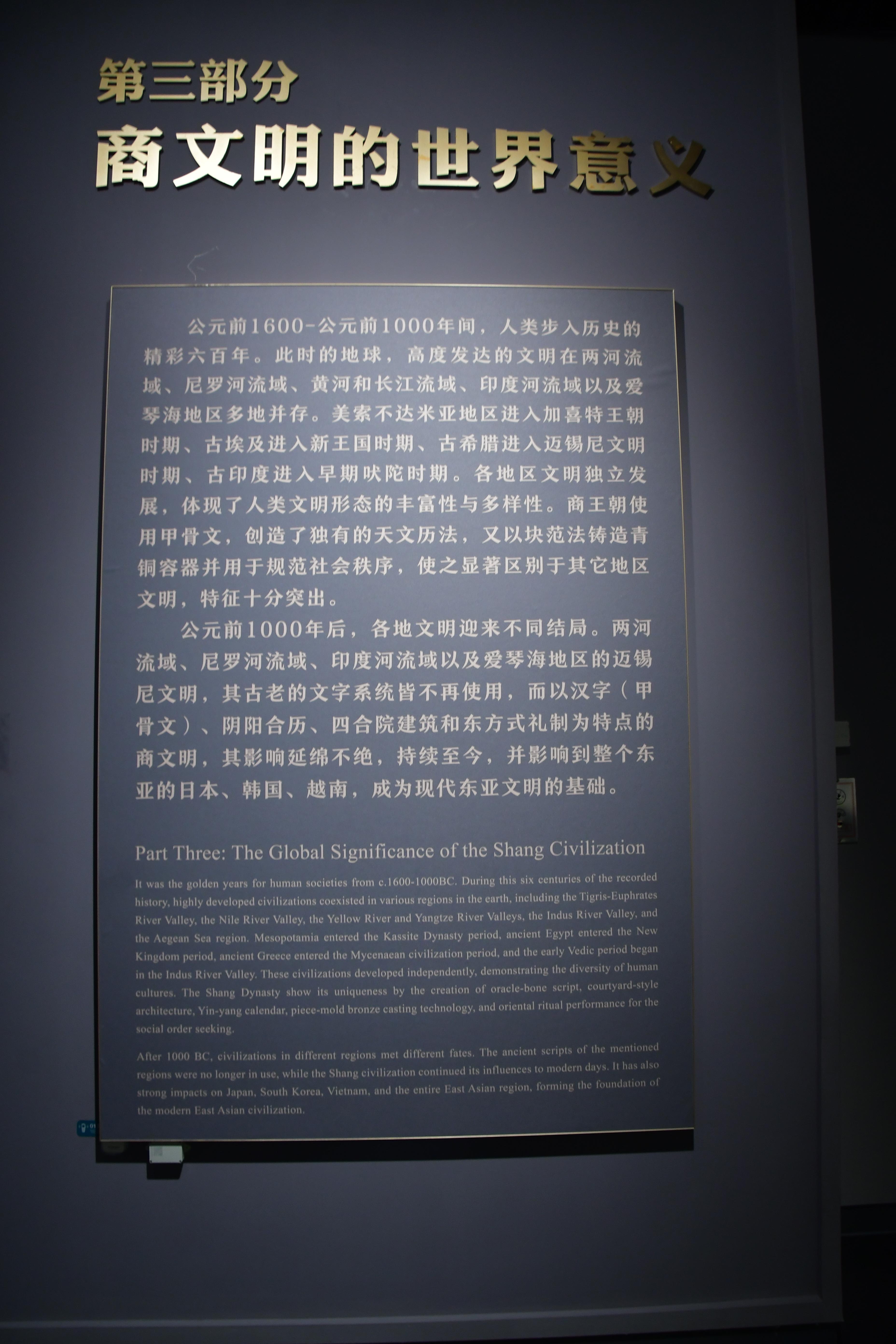 메소포타미아문명, 나일문명, 인더스문명, 미케네 문명과의 비교와 상호 학습을 통해 상(商) 문명은 뚜렷한 동양적 특징을 보여준다. 수천 년에 걸친 변천과 그 심오한 포용성, 그리고 혁신은 중화민족의 단결과 결속의 원천이 되었다. 상(商) 문명은 현대 동아시아 문명의 토대이자 인류문명의 다양성을 보여주는 증거이다.