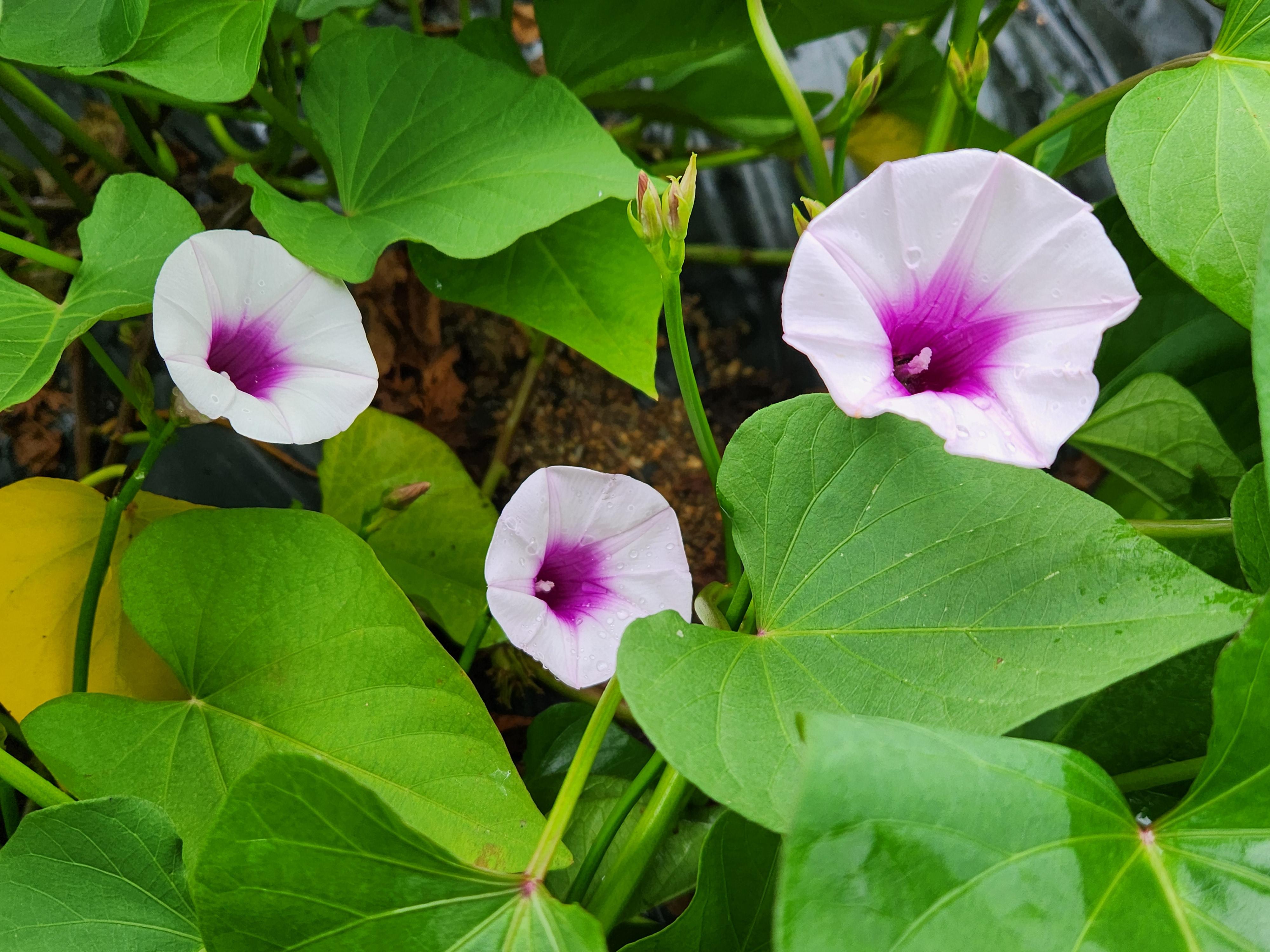 - 이제는 서울에서도 고구마꽃이 핀다. 참고로 고구마는 나팔꽃과이다. 비에 젖은 모습이 청초하고 영롱해 보인다.