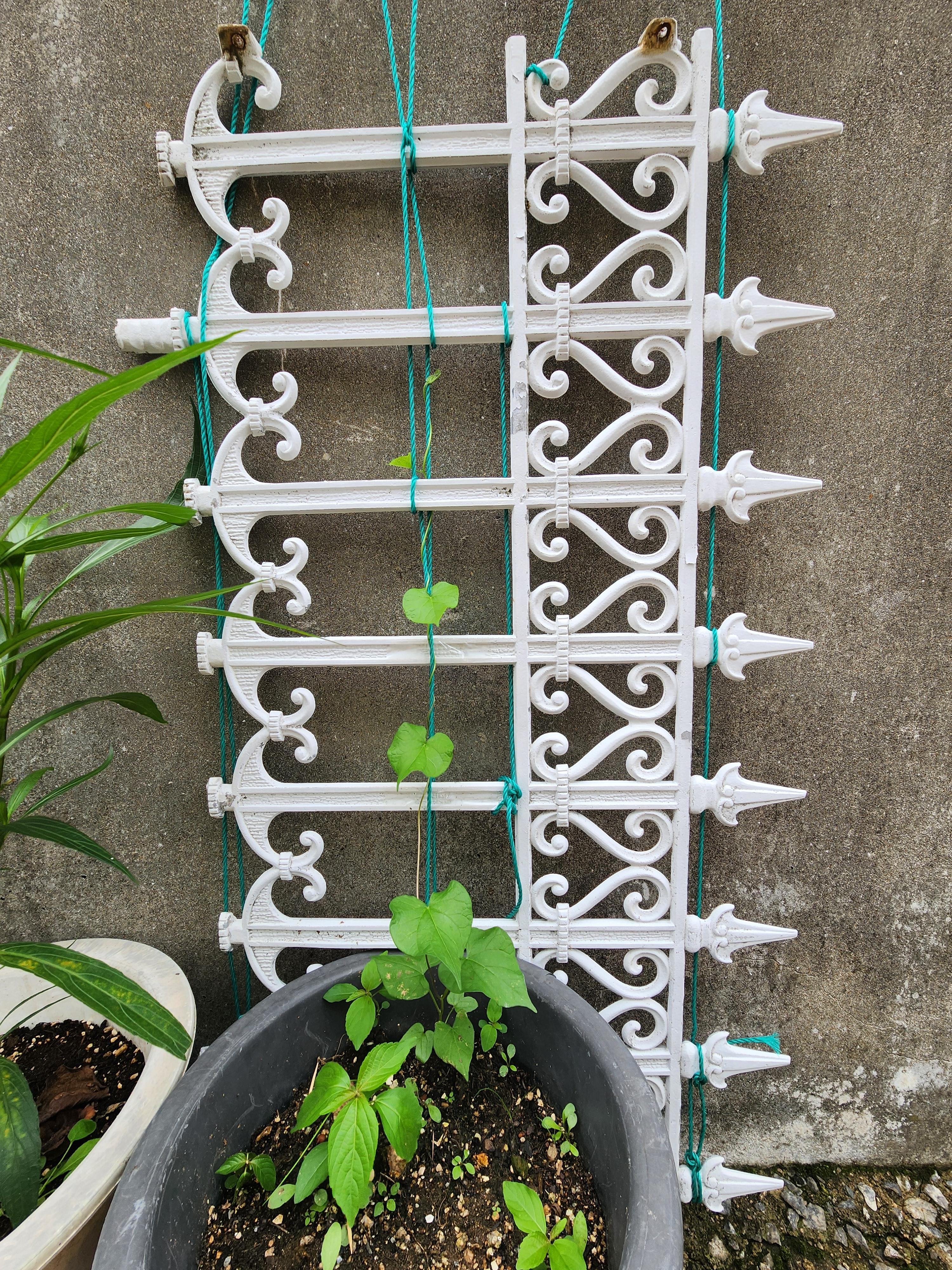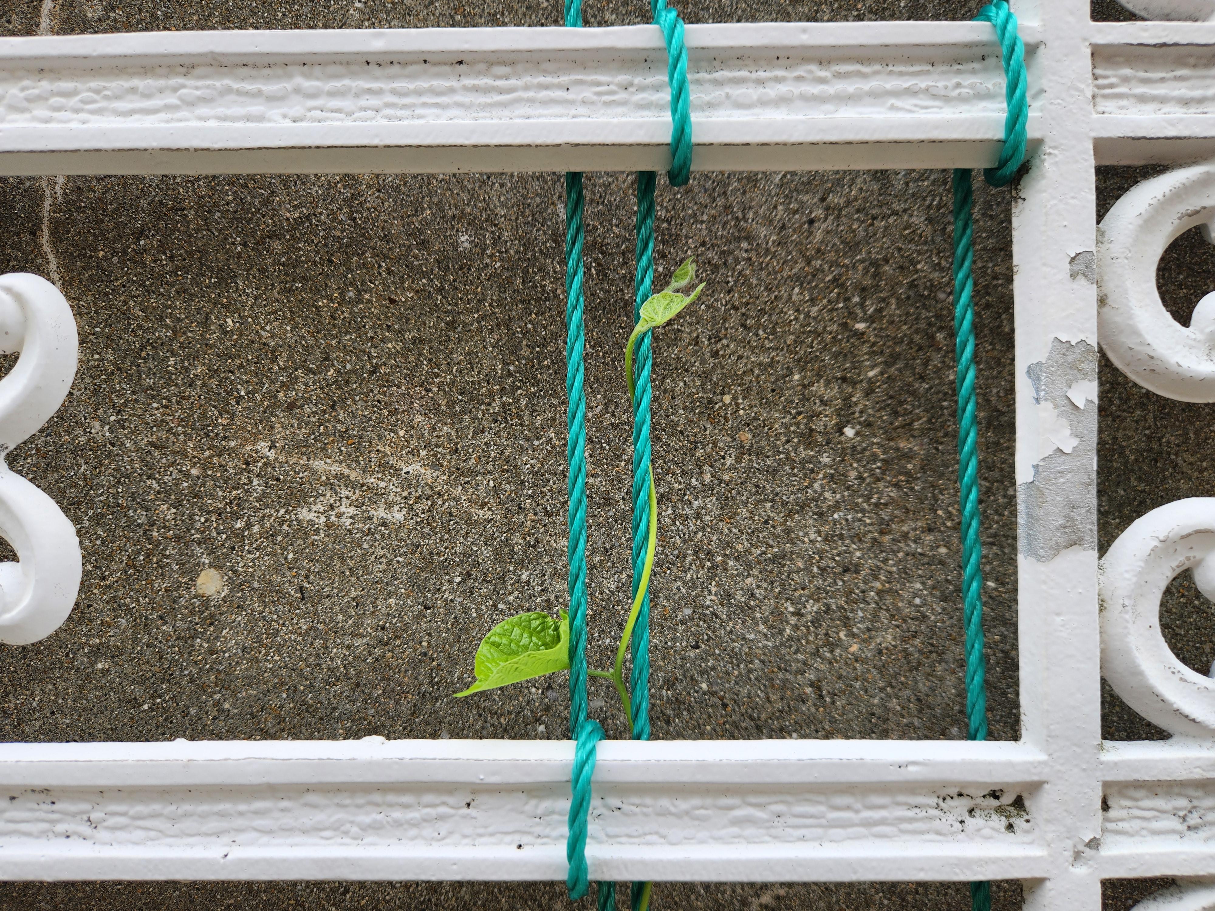 - 비가 오고 해가 쨍쨍하니 나팔꽃 덩굴이 무럭무럭 자랐다. 첫날은 위에서 4번재 사다리에 있던 덩굴이 두 번째 사다리를 향해 올라가고 있었다.