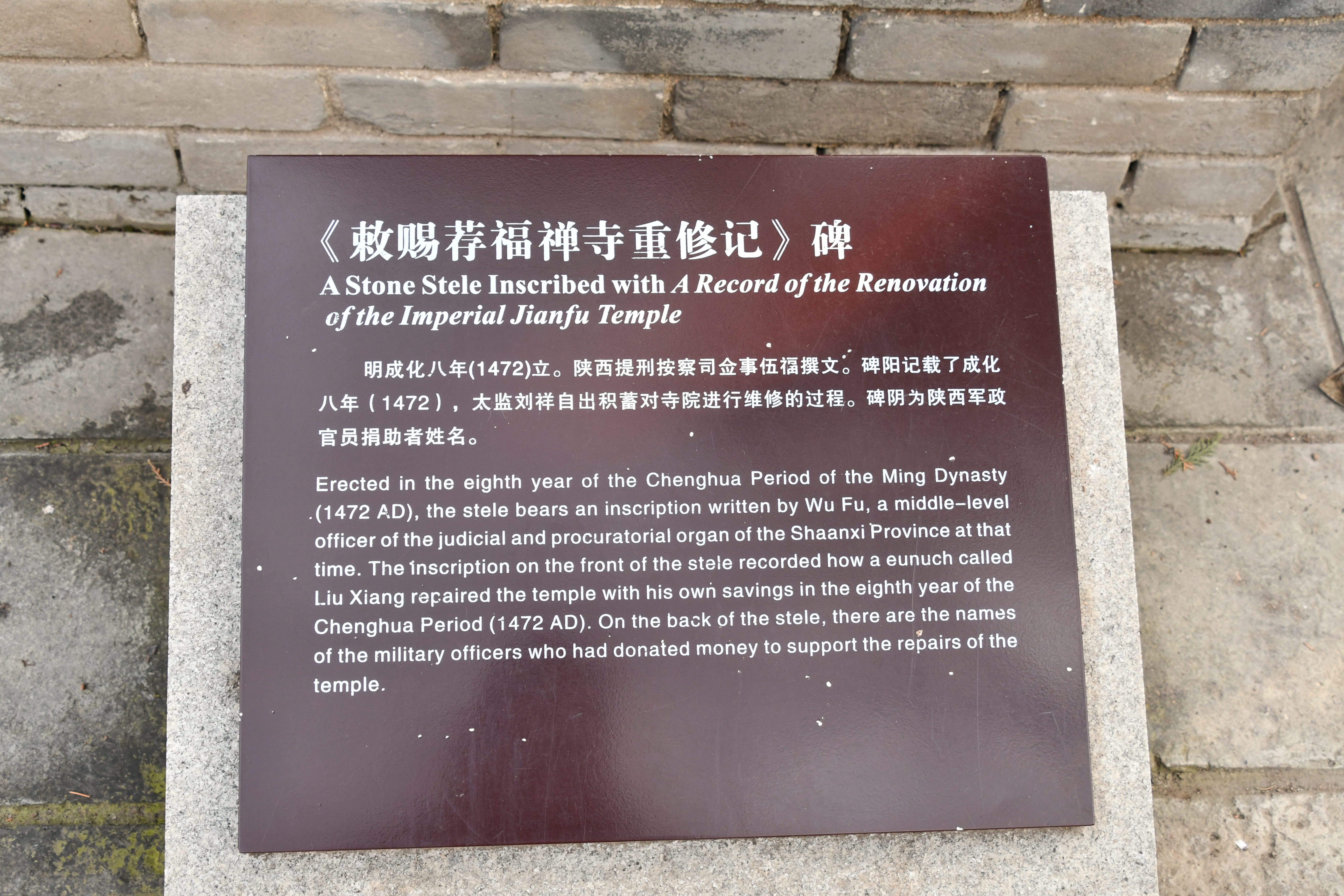 明成化八年(1472)立。陕西提刑按察司佥事伍福撰文。碑阳记载了成化八年(1472), 太监刘祥自出积蓄对寺院进行维修的过程。碑阴为陕西军政官员捐助者姓名。