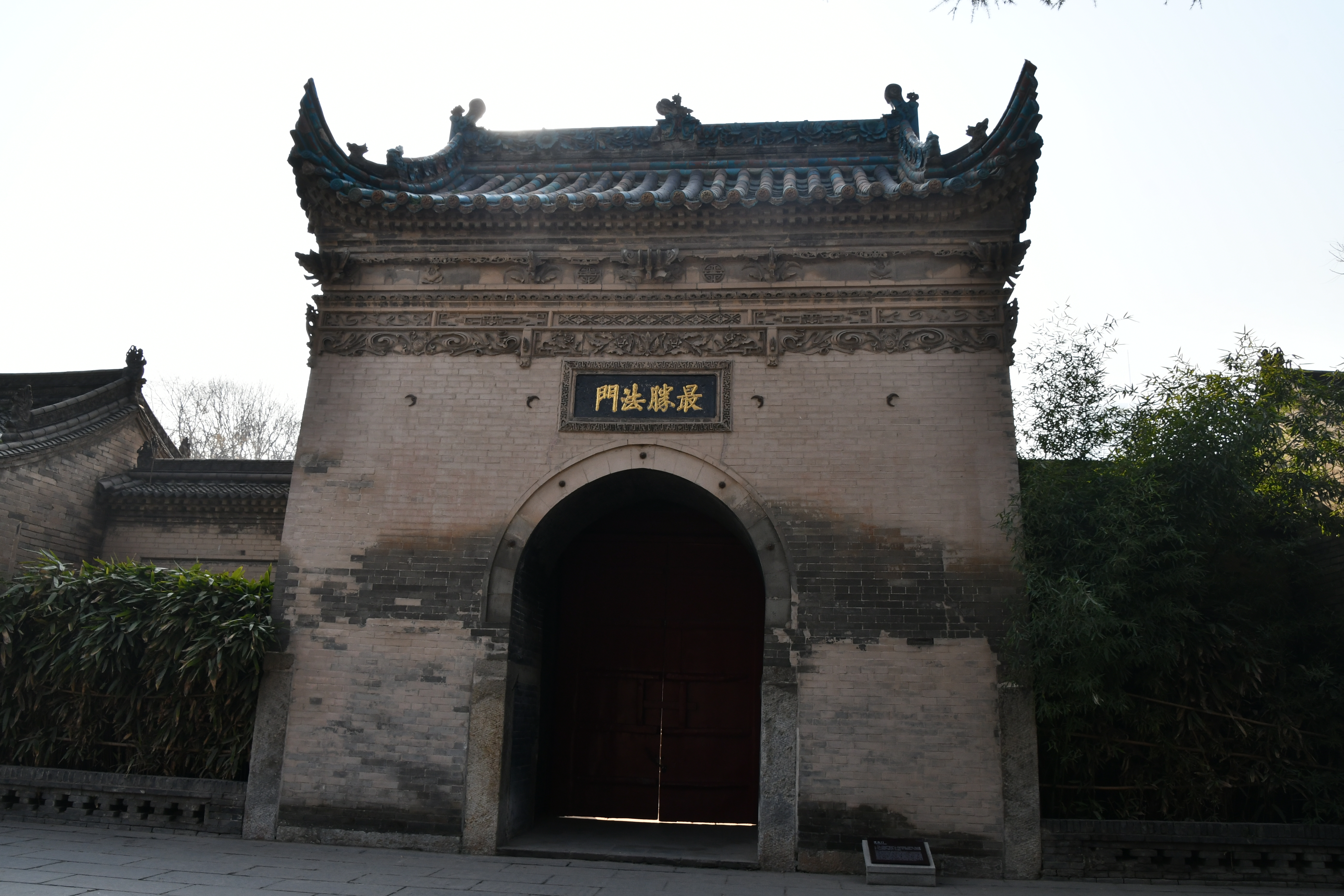 明代。明清时期荐福寺的正门。砖木结构建筑。单檐翘角、歇山式屋顶,上铺蓝色琉璃瓦,有脊兽, 檐下砖雕斗拱及精美花纹, 正中为青砖砌券门洞。门额南面嵌有明正德六年(1514)制“敕赐荐福寺”石刻寺名匾额, 北面嵌有明代“最胜法门”石刻匾额。