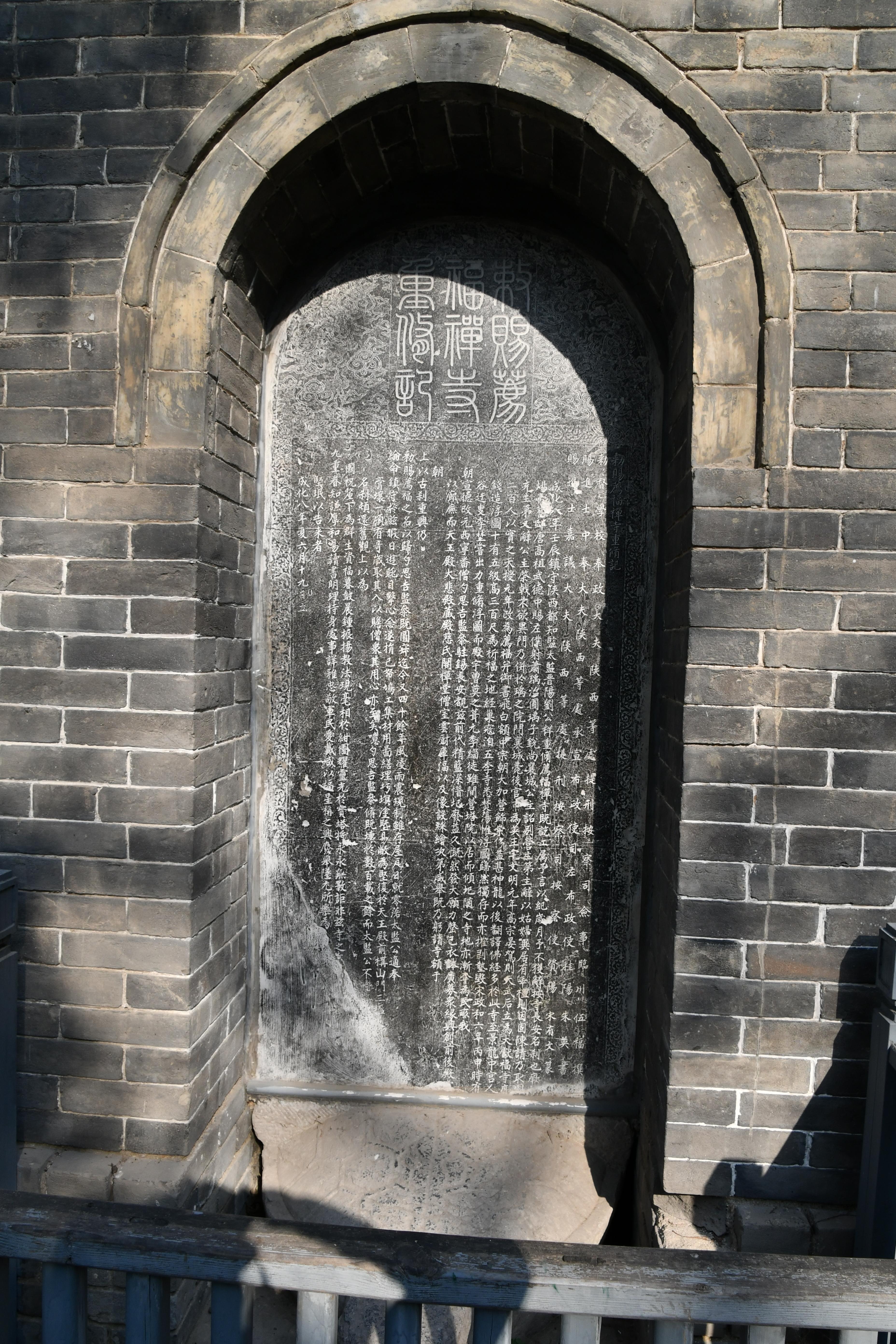 명나라 성화 8년(1472)에 건립되었다. <이 비는> 섬서 제형안찰사첨사 오복(伍福)이 글을 지었다. 비의 앞면에는 성화 8년(1472)에 태감(太監:환관) 유향(劉祥)이 사비를 들여 사찰을 중수했다는 내용이 기록되어 있다. 비의 뒷면에는 자금을 기증한 섬서 군관 및 관원의 성명이 있다.