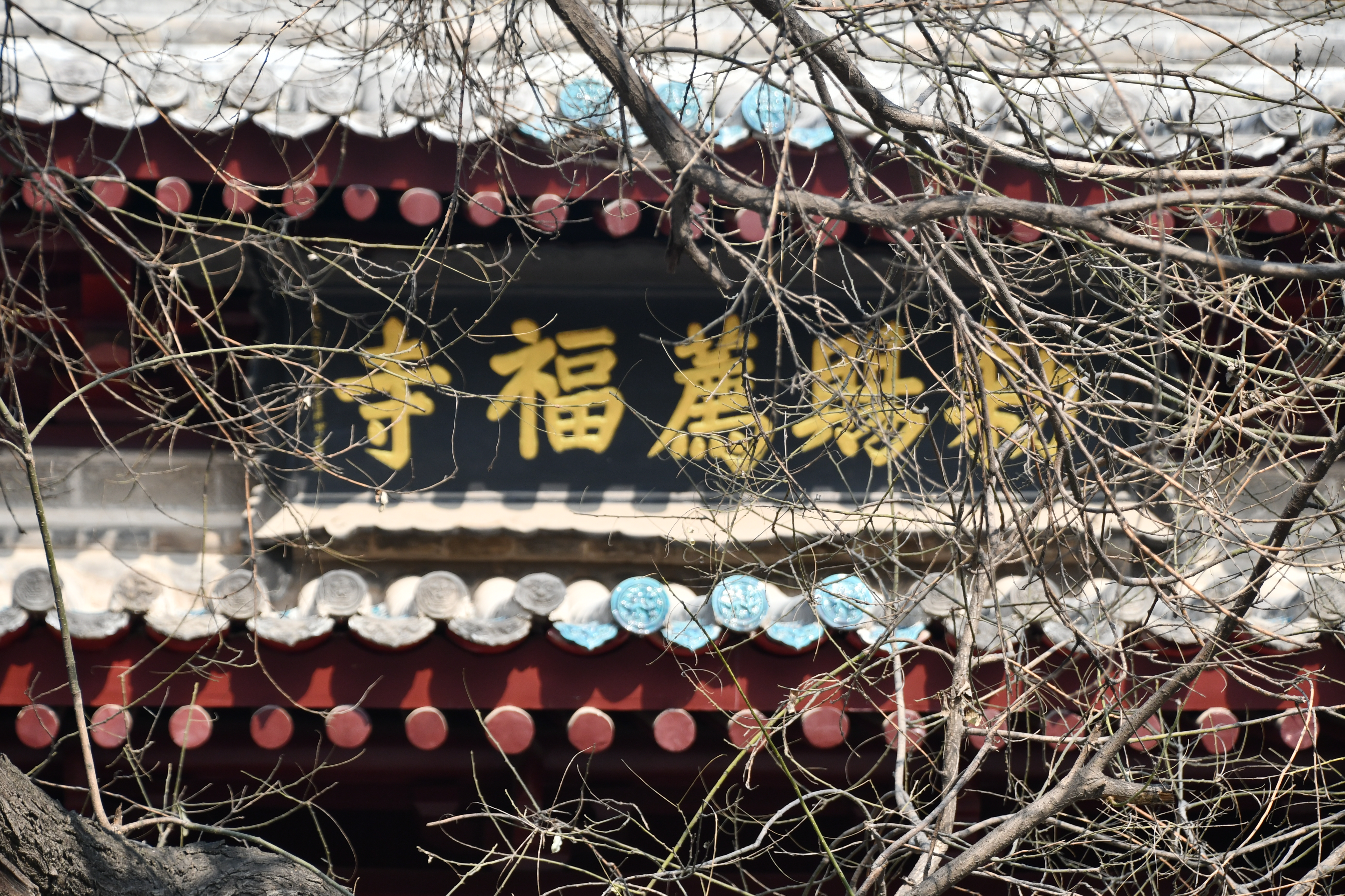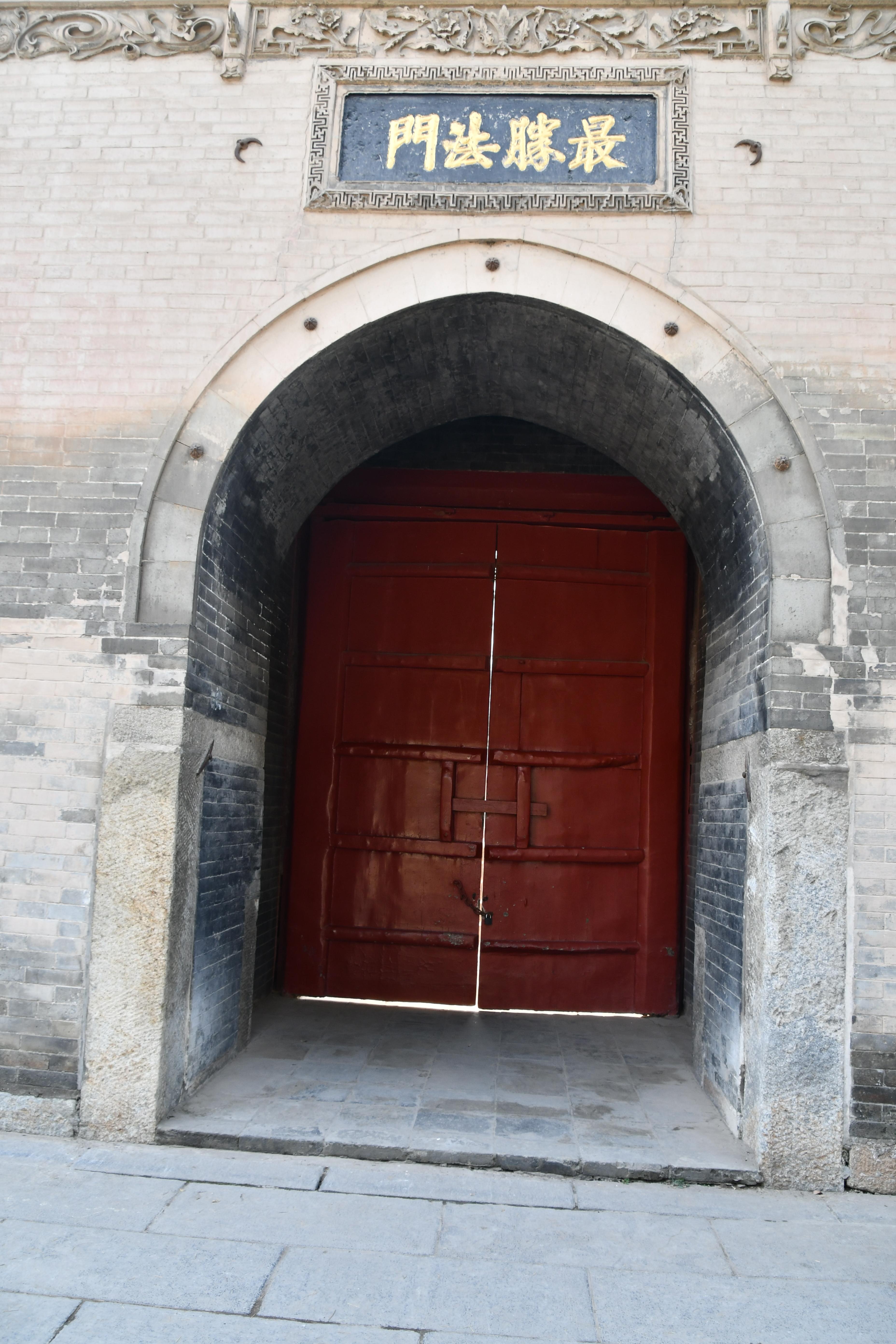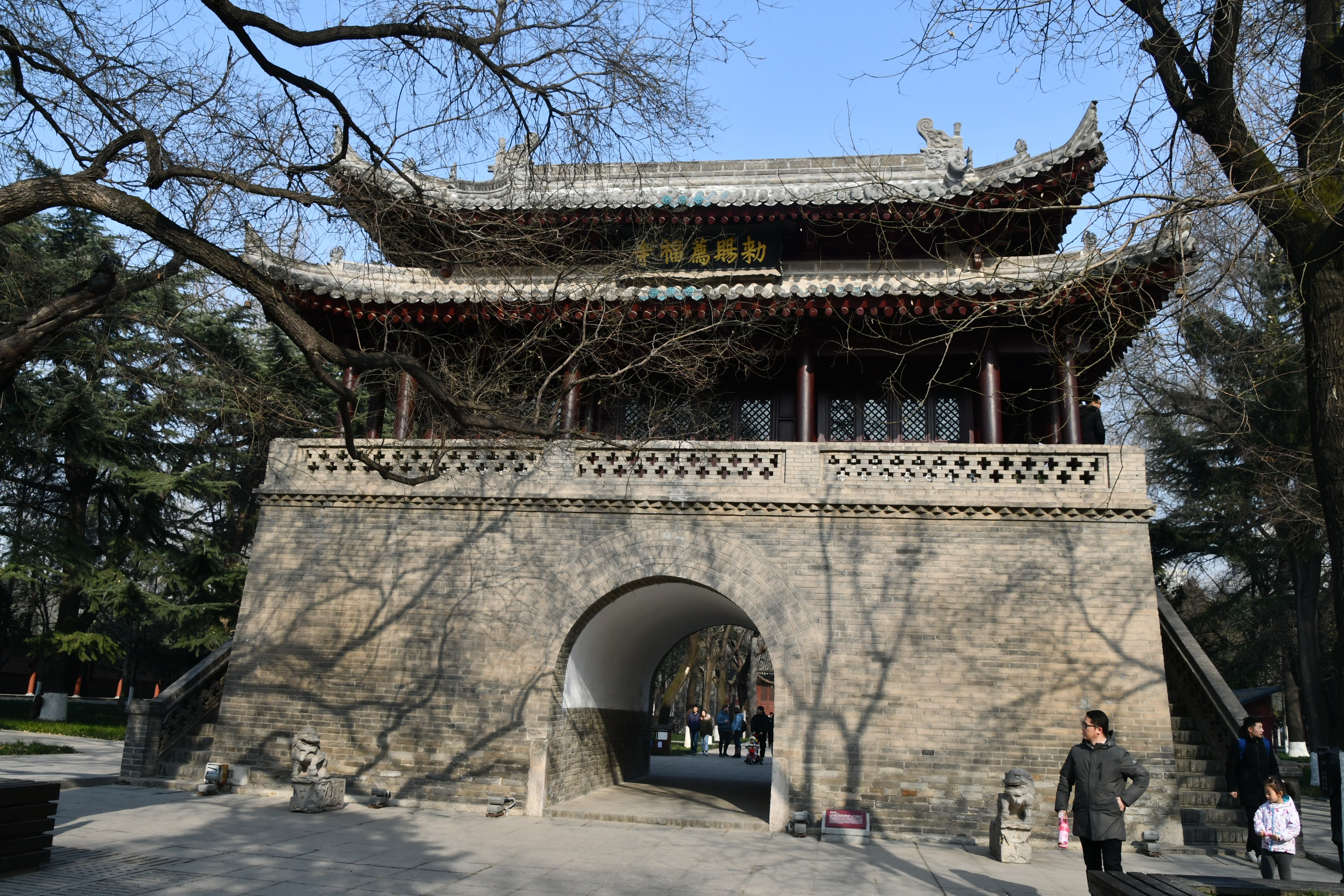 명나라. 명청시기 천복사(薦福寺)의 정문이다. 벽돌과 나무로 지어진 이 건축물이다. 단층 처마가 위로 치켜 올라간 형식이며, 팔작지붕 구조로서 지붕 위에는 푸른 유약를 바른 기와가 덮혀 있고, 용마루에는 잡상이 장식되어 있다. 처마 아래에는 별돌로 조각한 공포와 정교한 문양이 장식되어 있으며, 중앙에는 푸른 벽돌로 쌓은 아치가 있다. 문 현판 남쪽 들어간 벽에는 명나라 정덕 6년(1514)에 지어진 "勅賜薦福寺"가 새겨진 석판 사찰 이름 편액이 있으면, 북쪽에는 명나라 시대의 "最勝法門"이라는 돌에 새긴 편액이 있다.