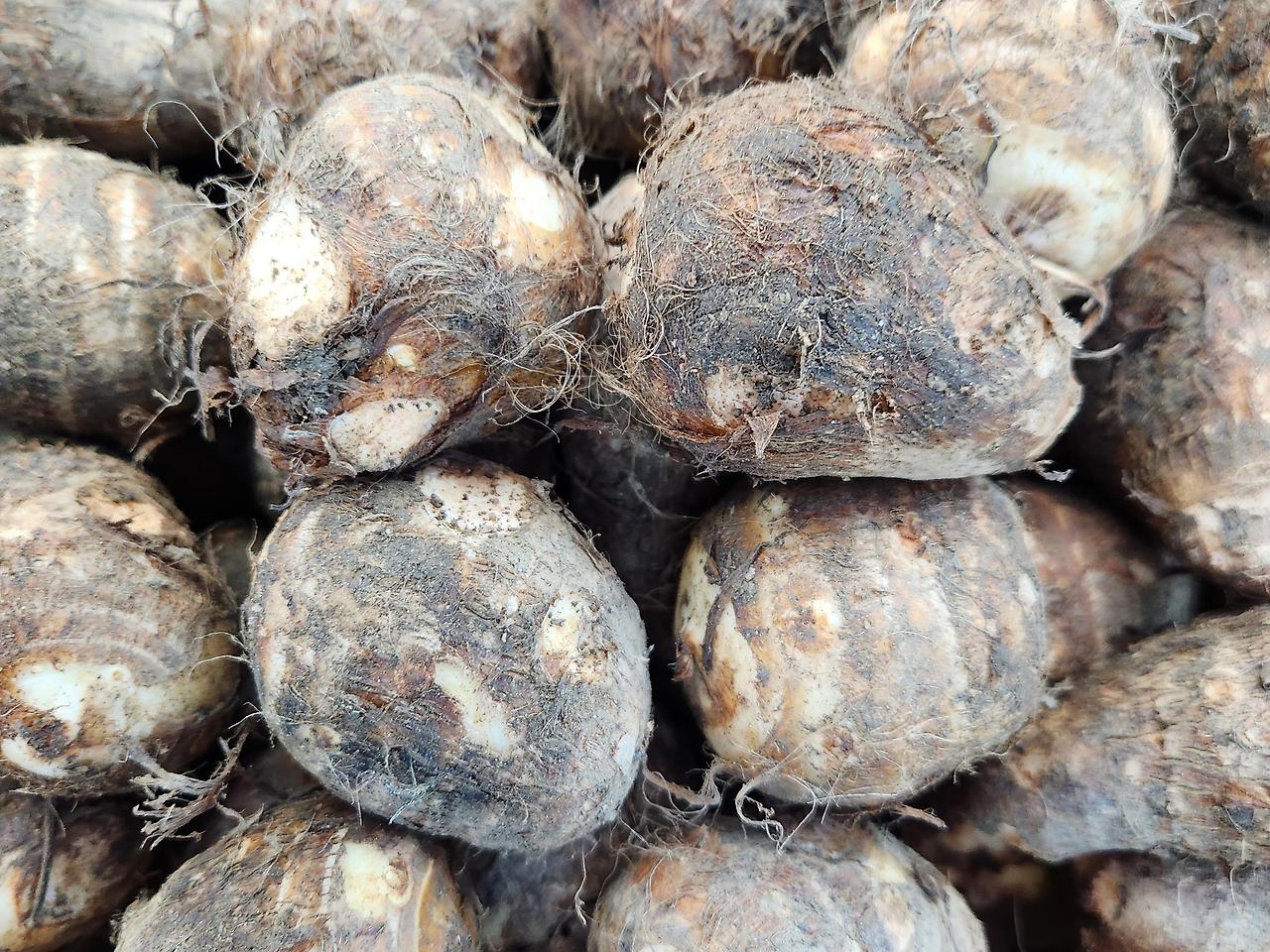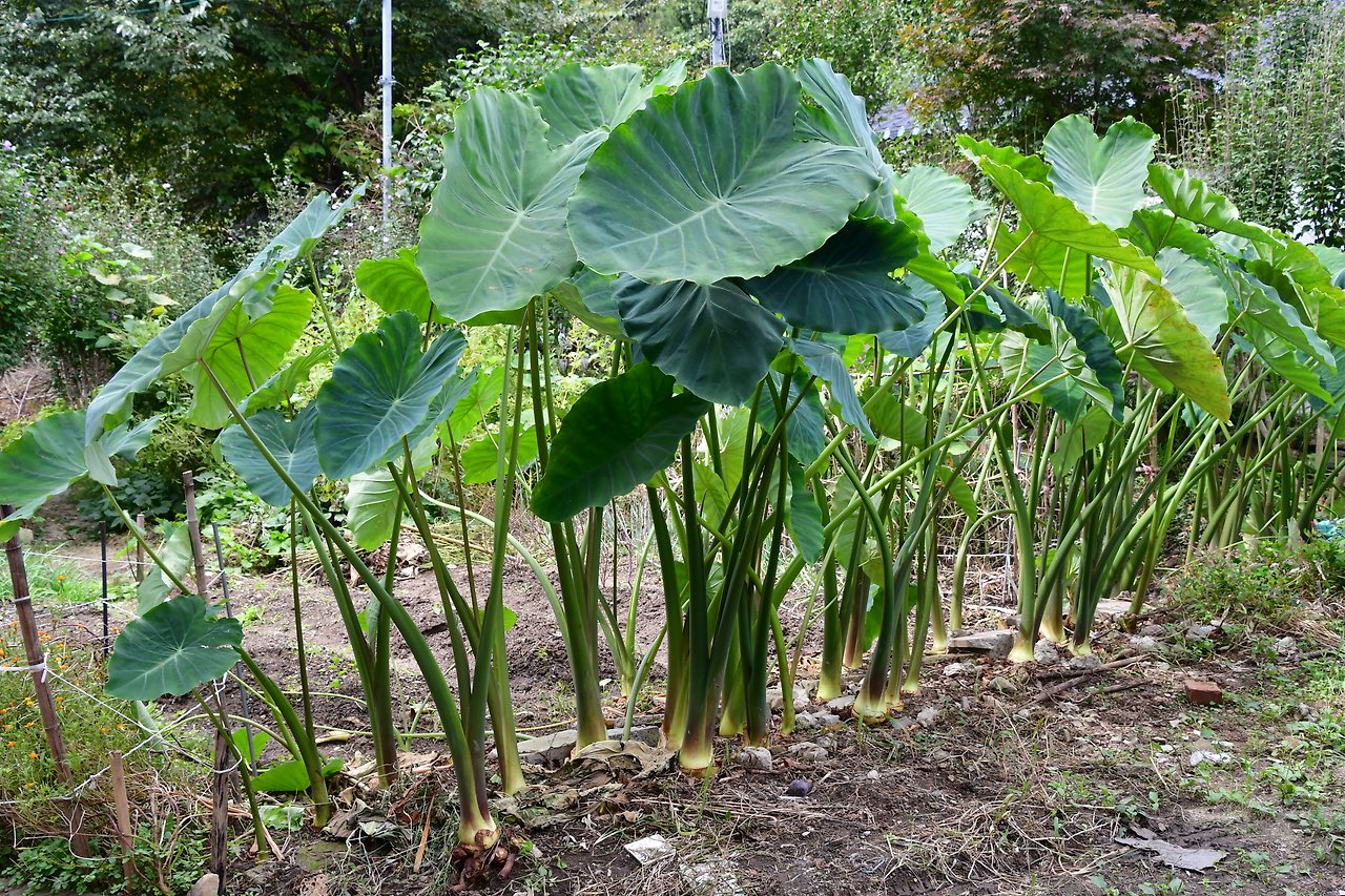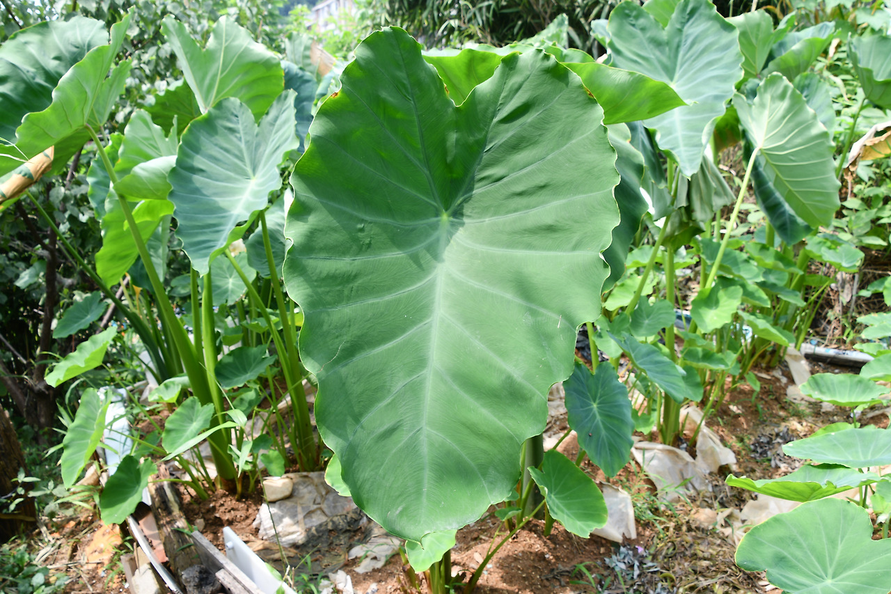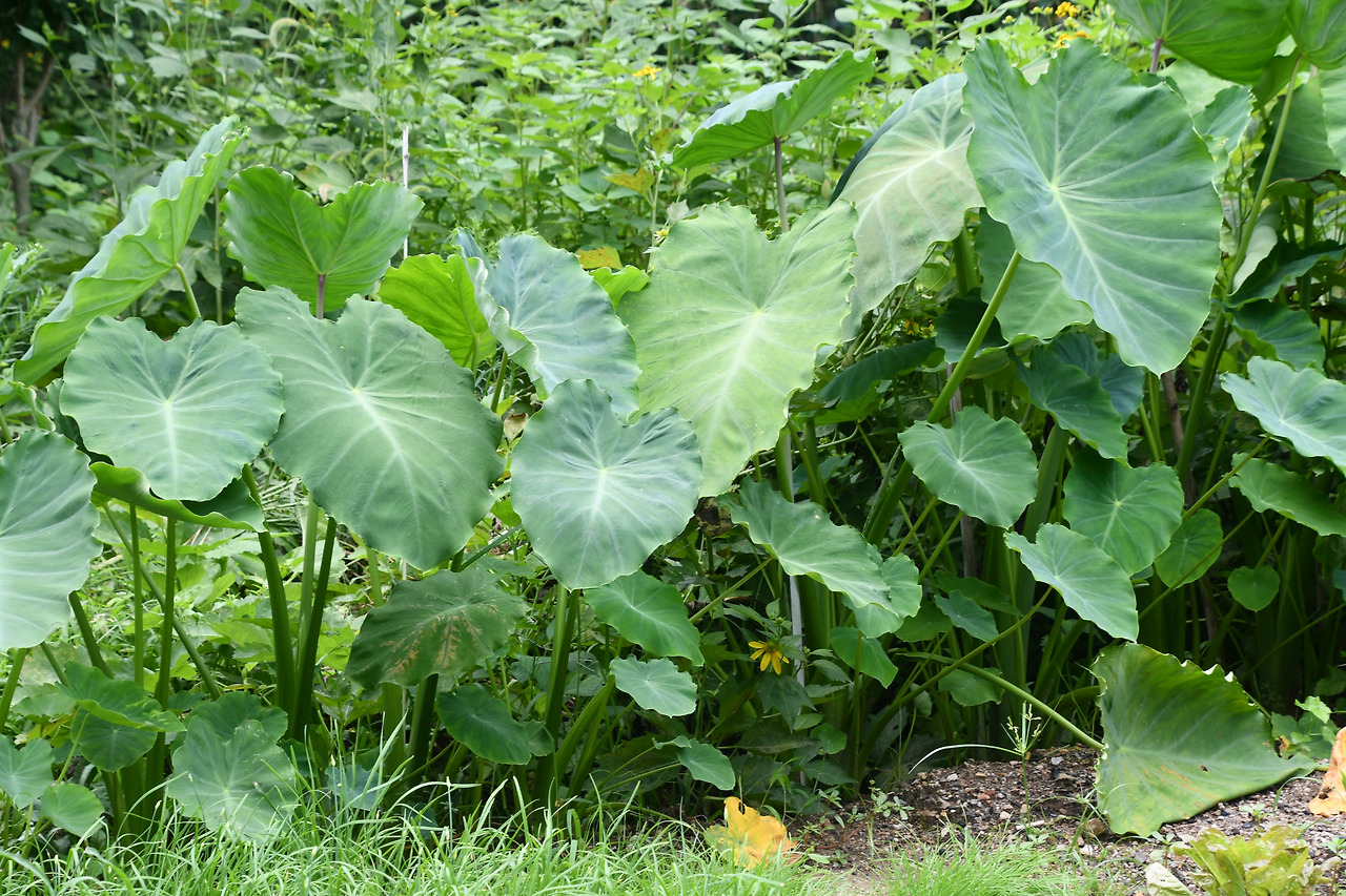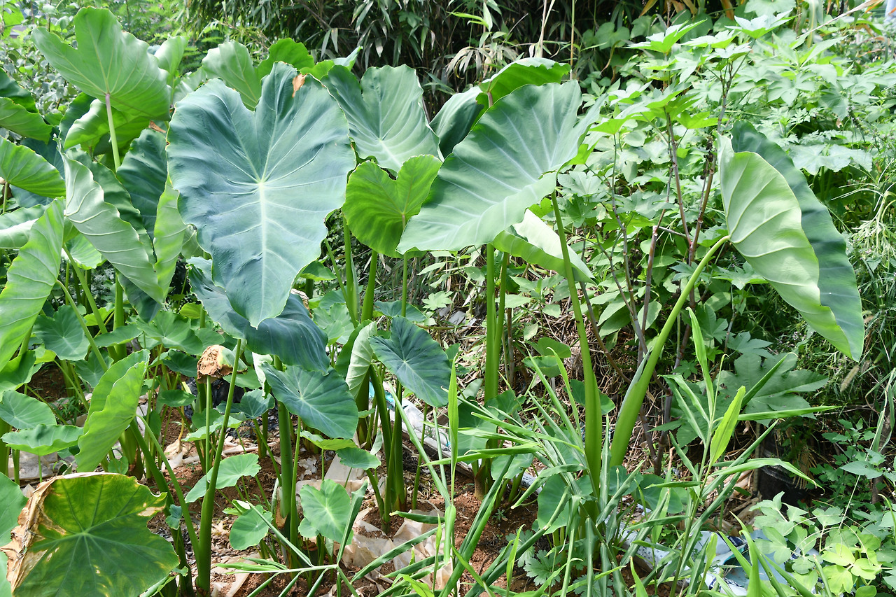 | - 잎이 원형이다. - 잎을 차로 만들어 먹는다. - 뿌리는 계란과 비슷한 모양이다. - 꽃은 8~9월에 핀다. *알로카시아와 비슷. |
