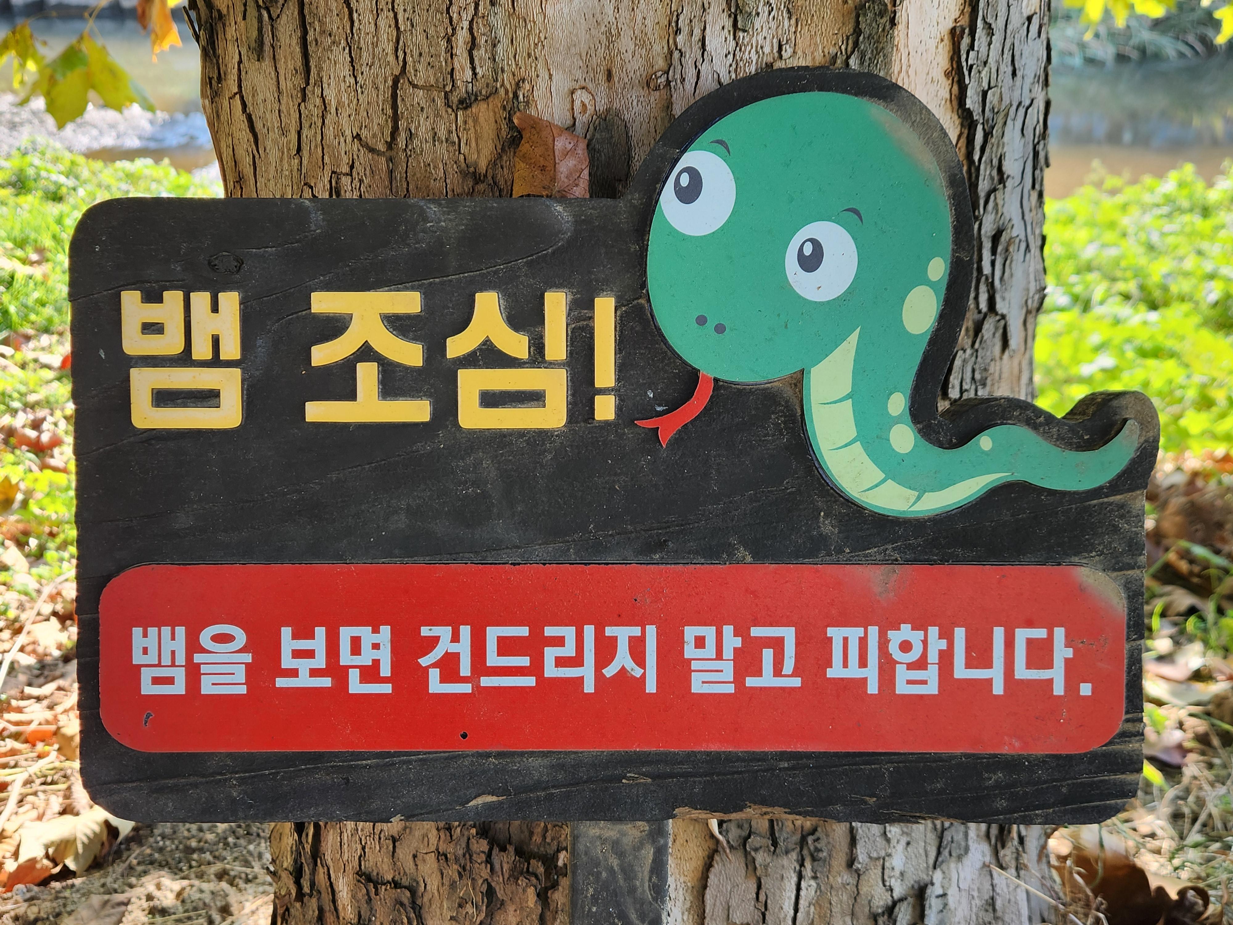 # 올 홍수에 떠내려온 "뱀조심" 팻말. 어디에 박혀 있을 아이가 나무에 기대어 섰다.