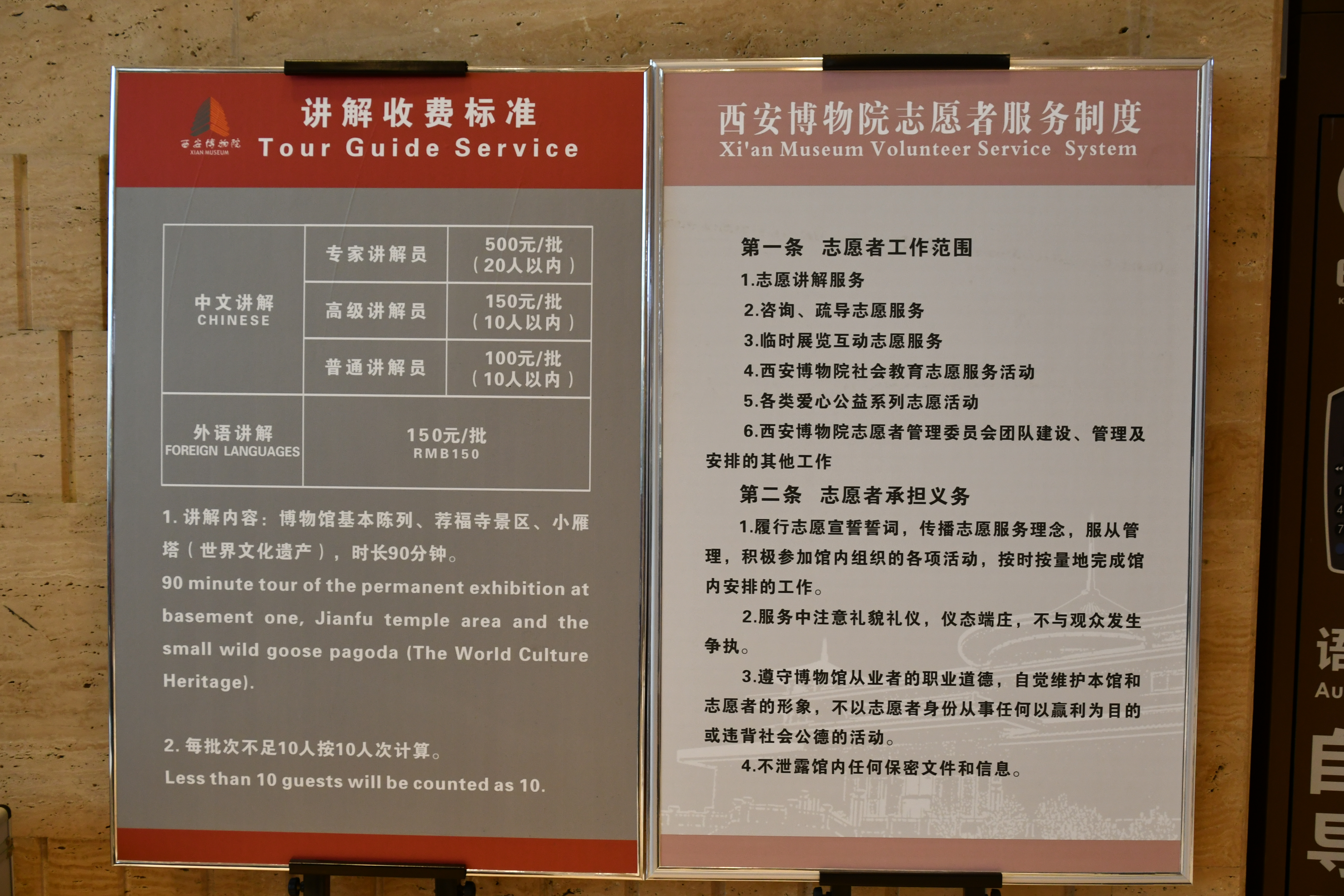 해설내용은 서안박물관 기본진열, 천복사 경구, 소안탑. 소요시간은 90분이다. 인원이 10인 안 되지 10인분으로 계산한다. 등급에 따라 가격이 다르다. 전문수준은 20인 이내 500위안, 고급수준은 10인 이내 150위원, 보통수준은 10인 이내 100위안. 외국어 해설은 150위안. 보통 수준으로 계산하면 외국인 1인당 3,000원정도.