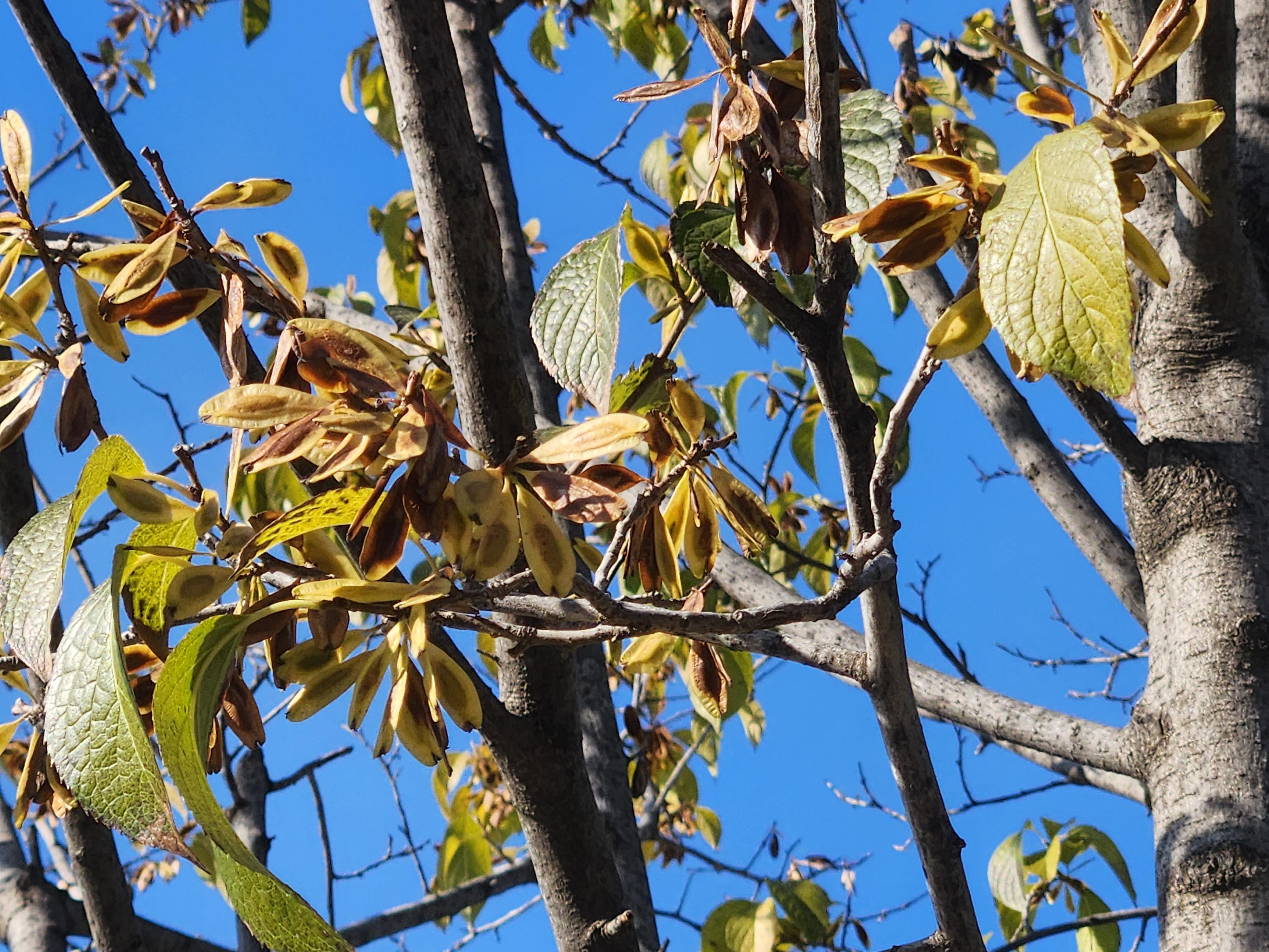 - 잎에 단풍이 들어 열매가 잘 보이지 않는다. 잎이 지고 열매만 남았을 때를 기다린다.