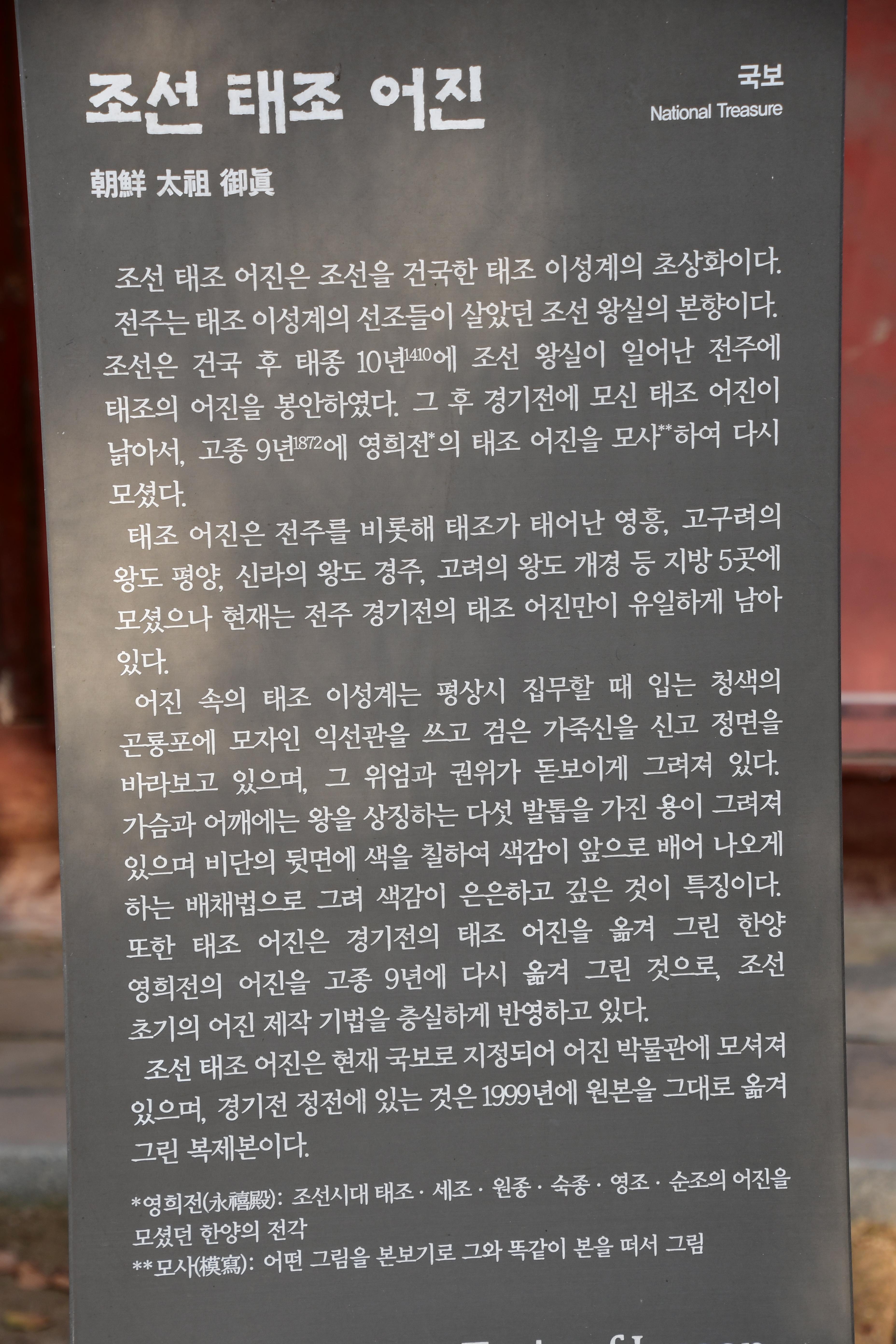 조선 태조 어진은 조선을 건국한 태조 이성계의 초상화이다. 전주는 태조 이성계의 선조들이 살았던 조선 왕실의 본향이다. 조선은 건국 후 태종 10년(1410)에 조선 왕실이 일어난 전주에 태조의 어진을 봉안하였다. 그 후 경기전에 모신 태조 어진이 낡아서, 고종 9년(1872)에 영희전*의 태조 어진을 모사*하여 다시 모셨다.