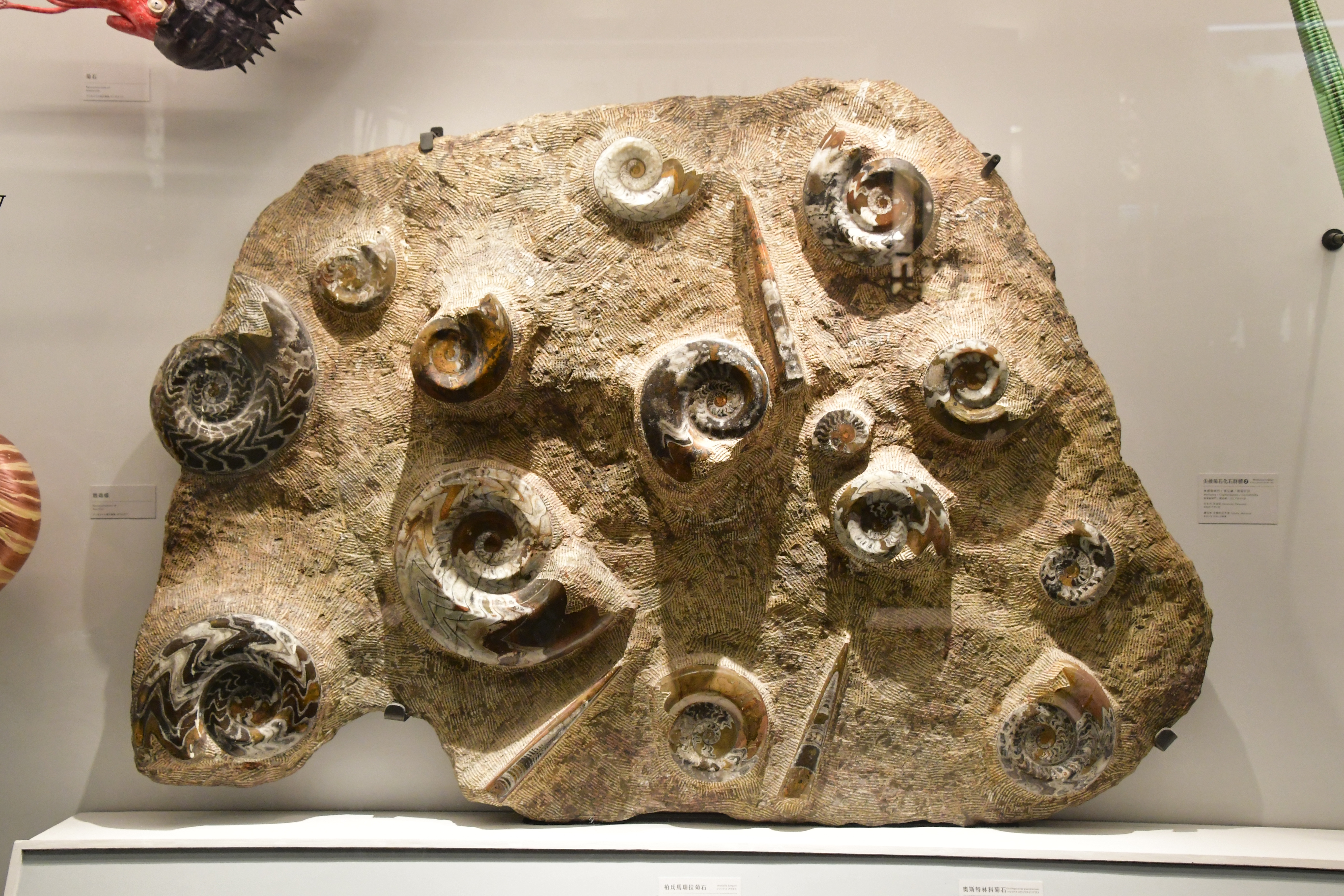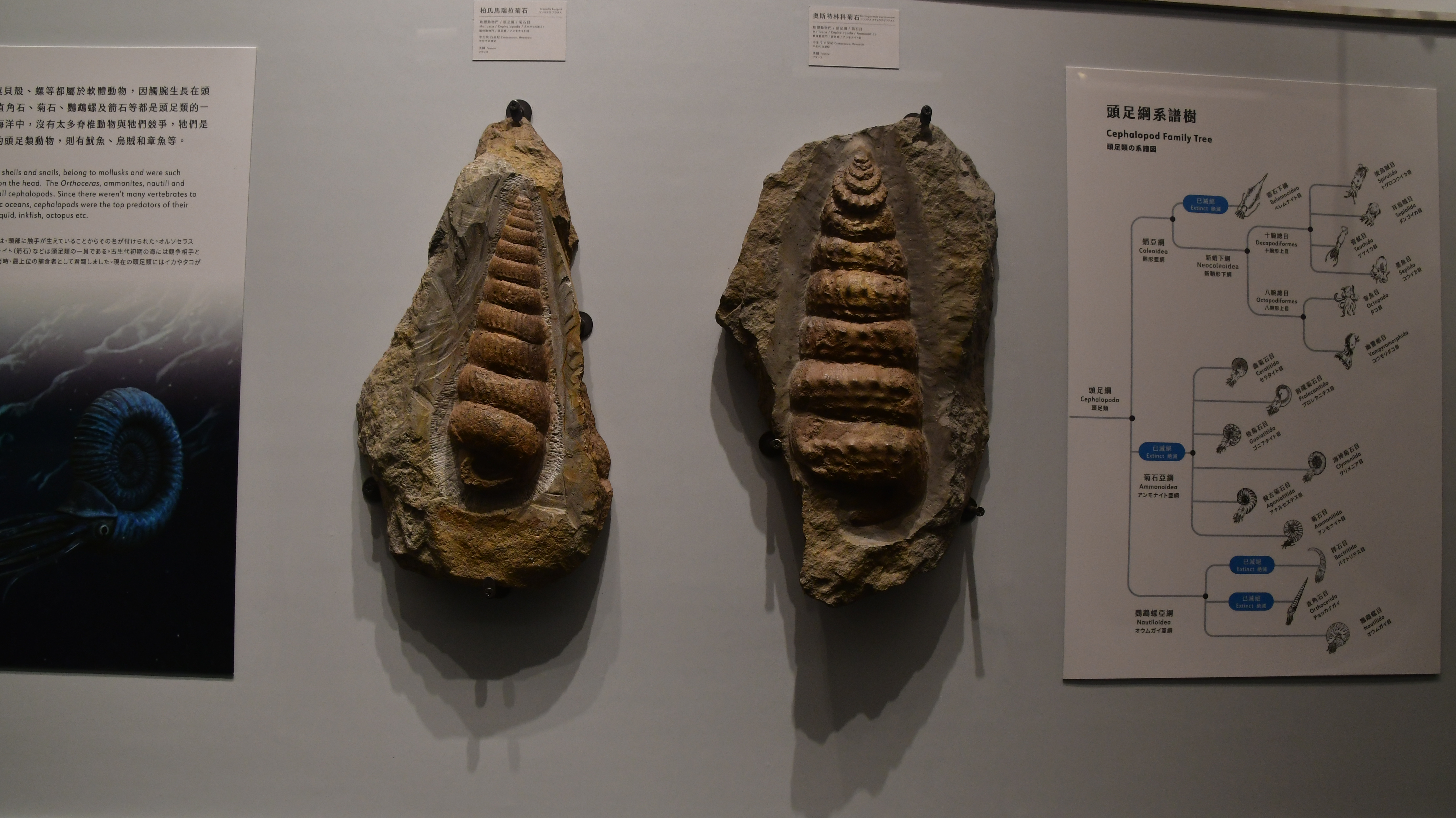 頭足類動物與貝殼、 螺等都屬於軟體動物, 因觸腕生長在頭部而稱爲頭足類, 這裡的直角石、 菊石、 鸚鵡螺及箭石等都是頭足類的一員。 由於在古生代早期的海洋中, 沒有太多脊椎動物與牠們競爭, 牠們是當時的頂級掠食者。今日的頭足類動物, 則有魷魚、 烏賊和章魚等。