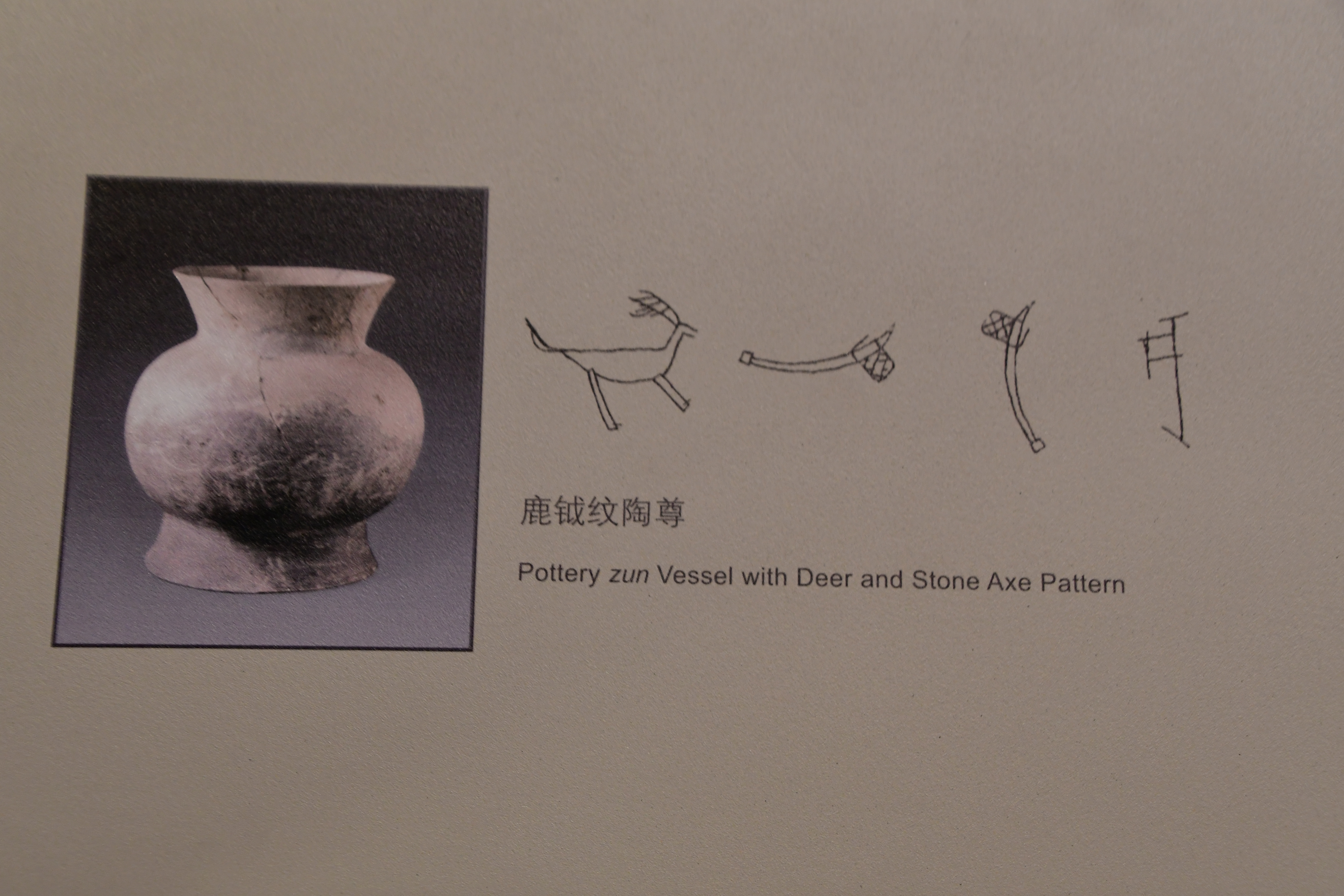# 쟁반 안쪽에는 마름모와 유사한 음각 기호가 새겨져 있으며, 같은 무덤에서는 이와 같은 음각 기호가 있는 뚜껑 달린 환족 접시 한 벌도 함께 출토되었다. 기호의 크기에는 약간의 차이가 있으나, 언제나 접시와 뚜껑의 내부 동일한 위치에 나타난다. 숭택문화와 양저문화의 토기에서는 이처럼 일정한 규칙성을 지닌 각화 도문이 자주 발견되는데, 이는 중국 문자 기원의 탐구에 중요한 단서를 제공한다.