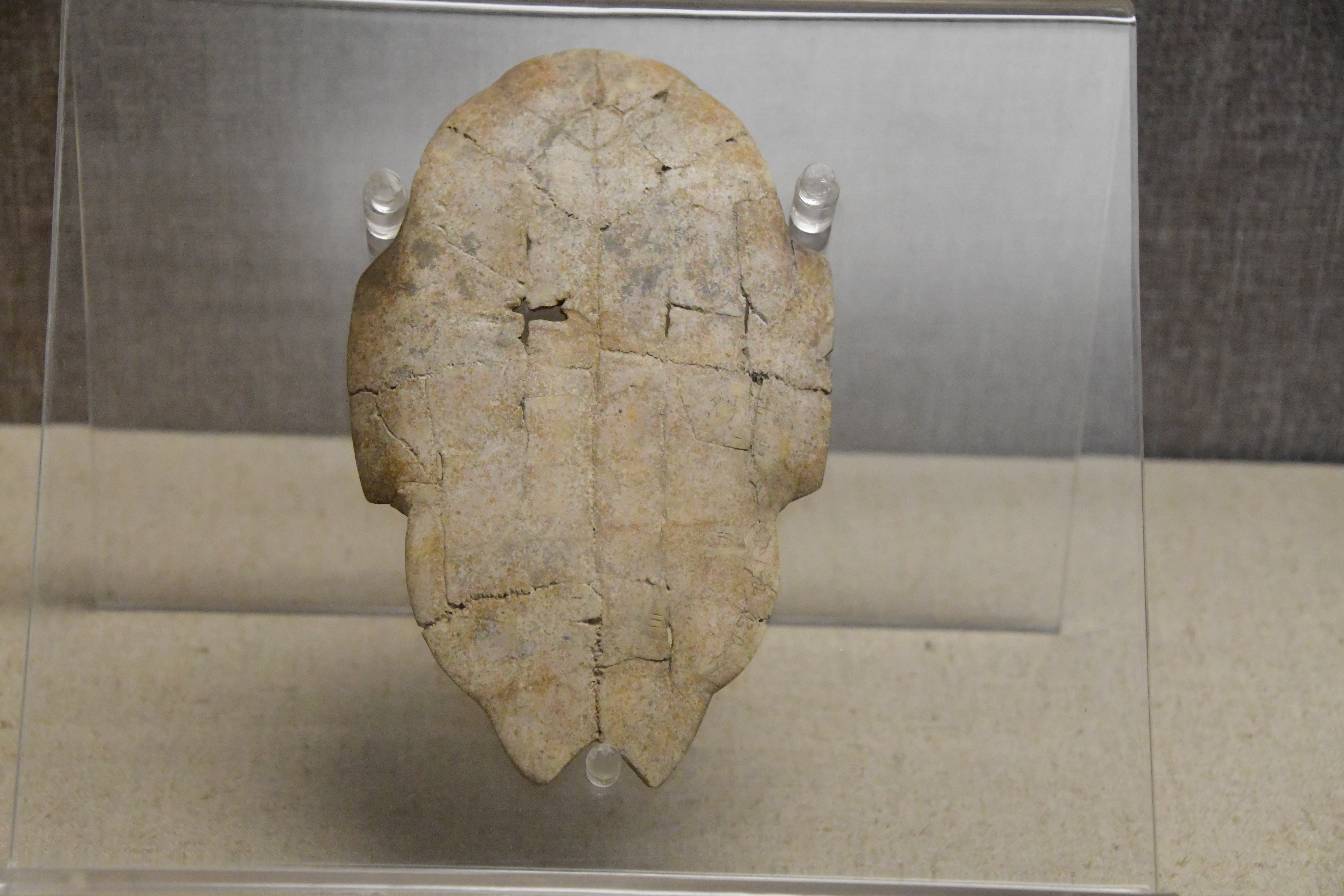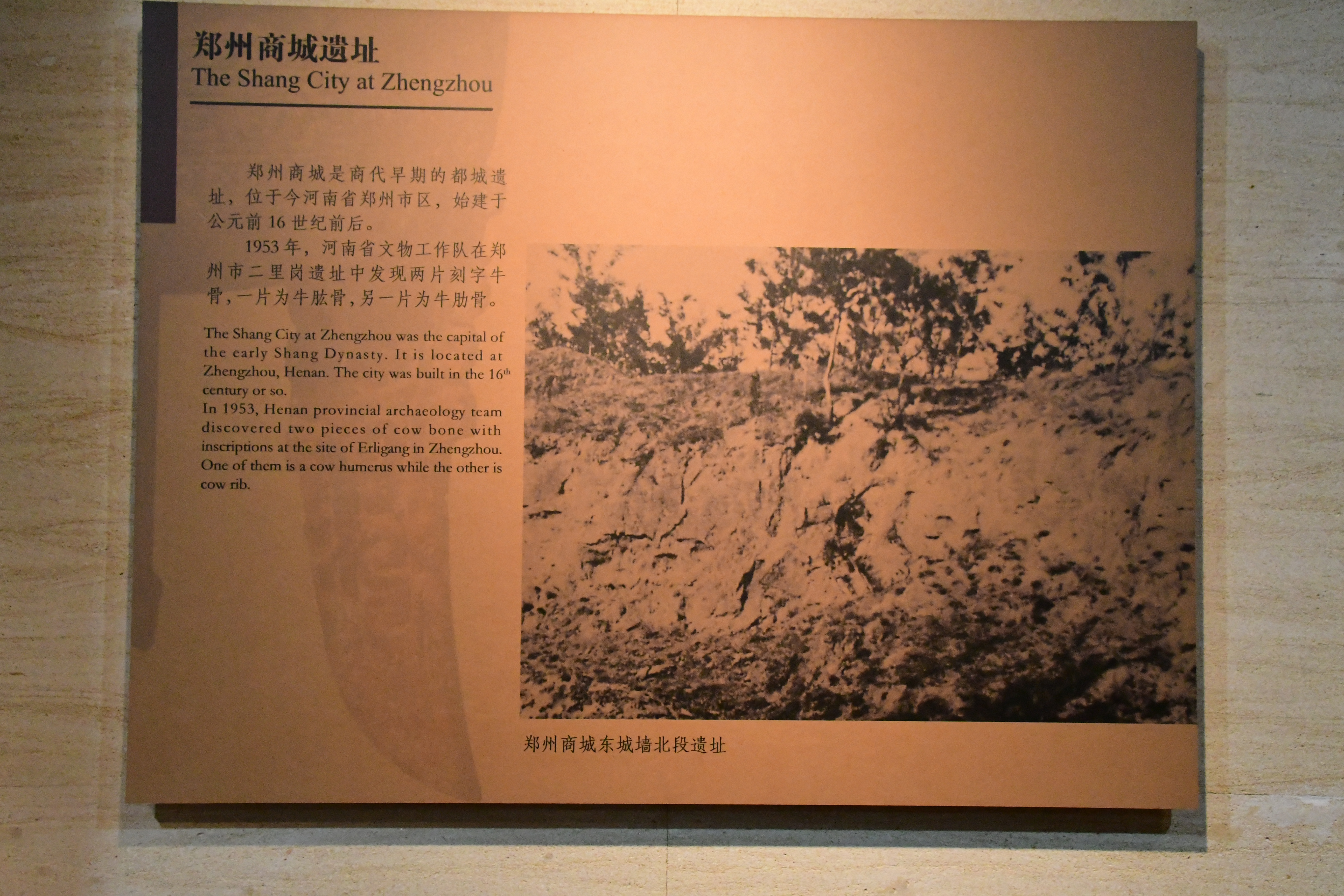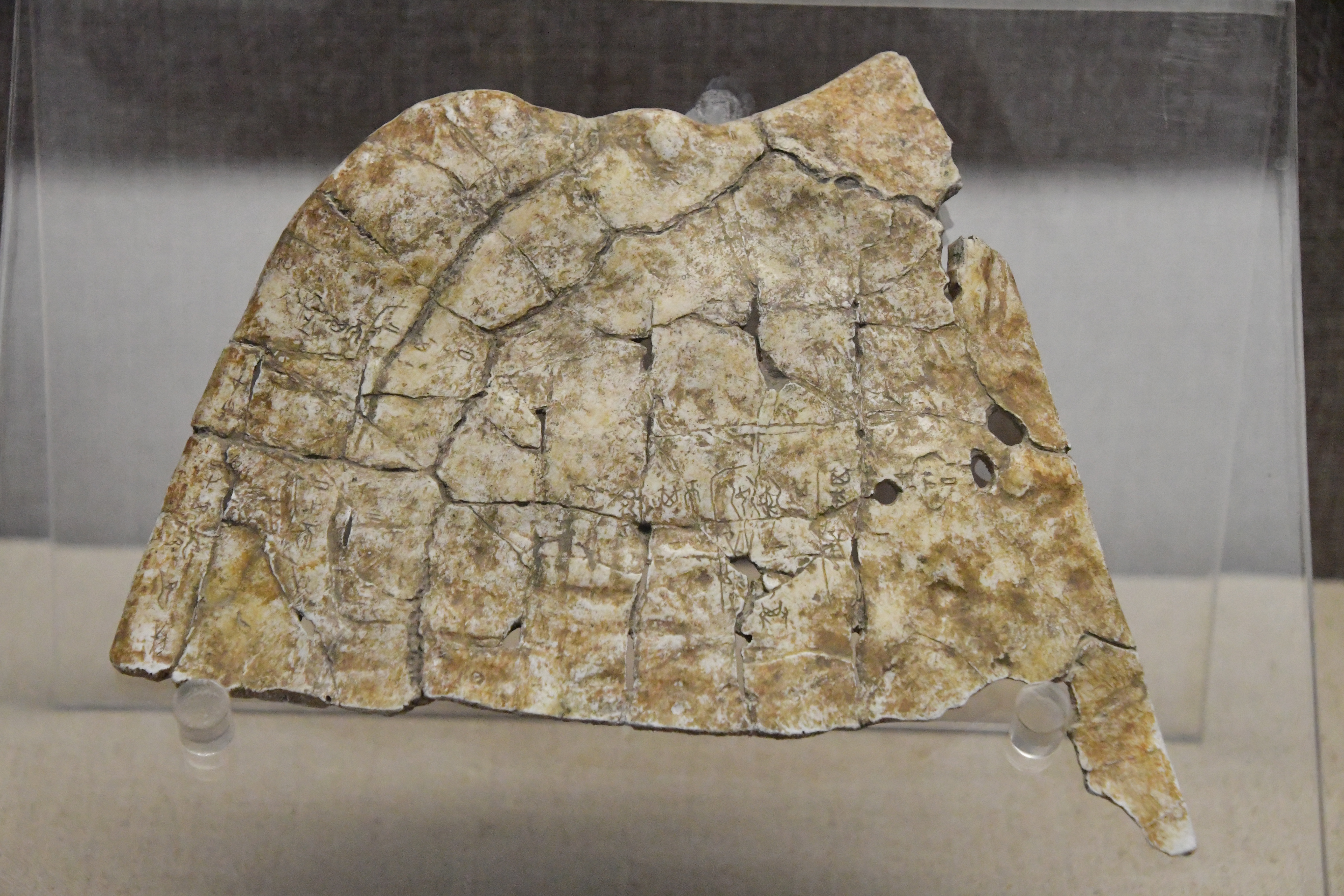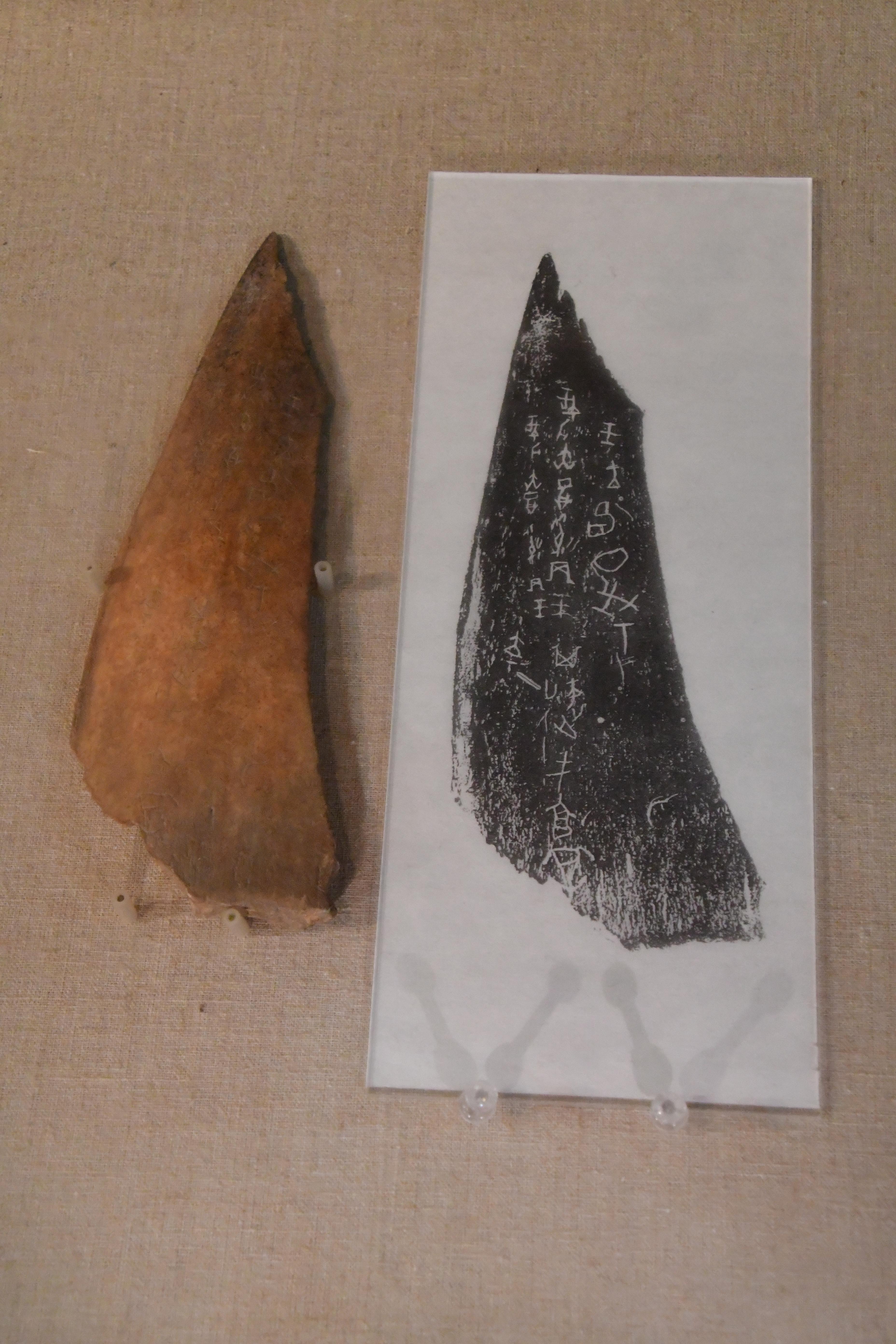 - 하남 정주 상성 출토. 글자가 없는 복골로, 뼈의 넓은 부분에 드릴로 뚫고 불로 지진 흔적이 있어 이 갑골이 점복에 사용되었음을 설명한다.
