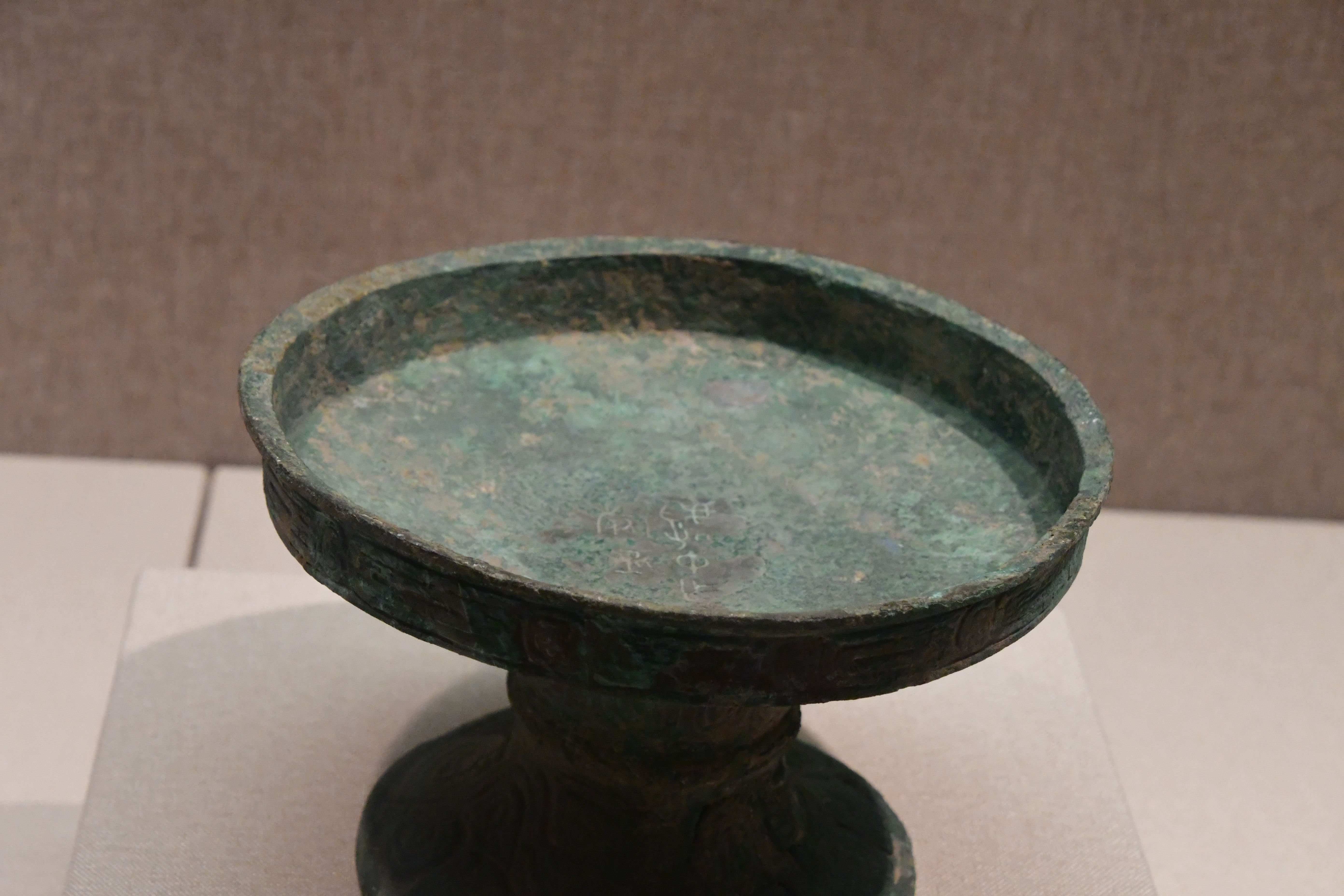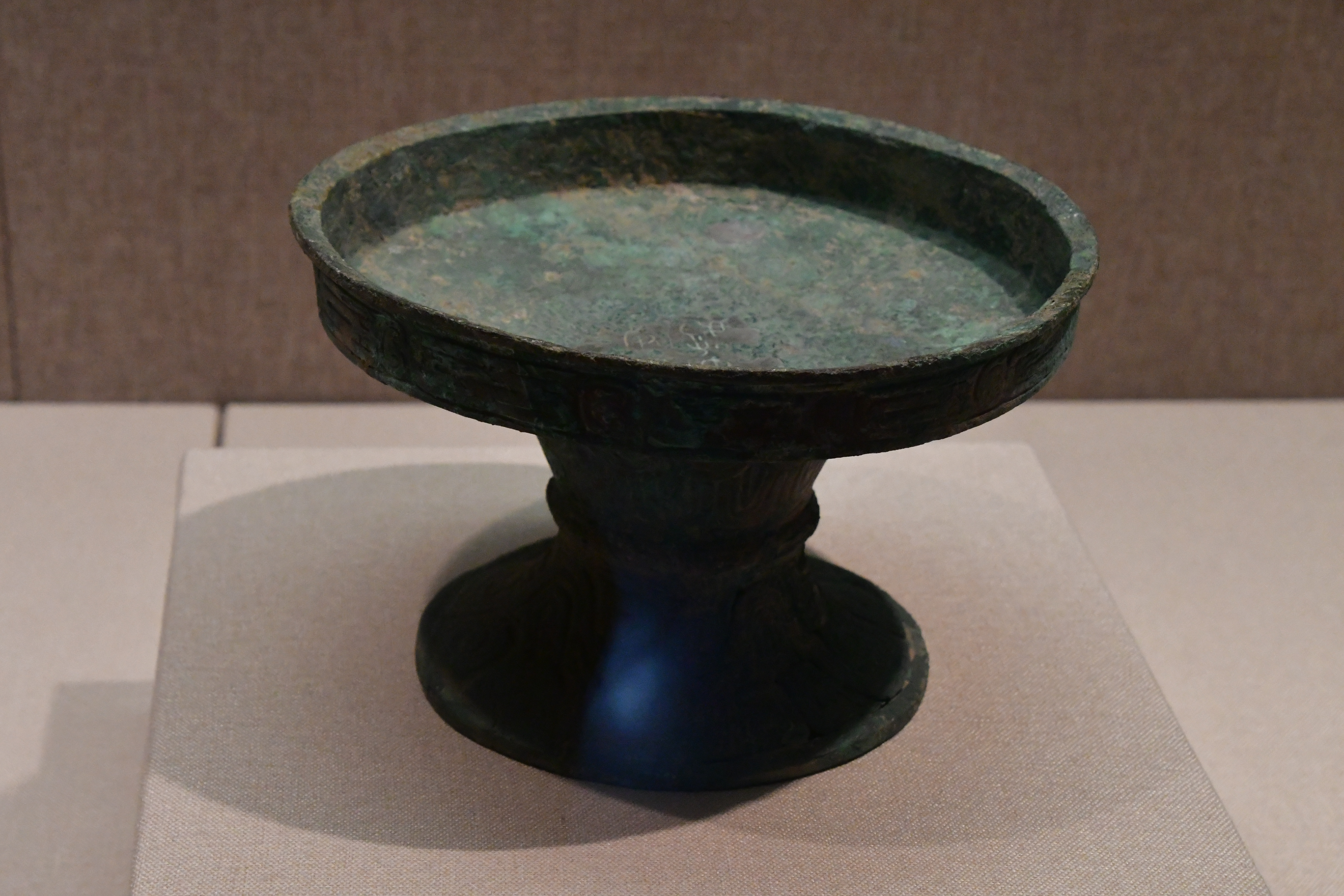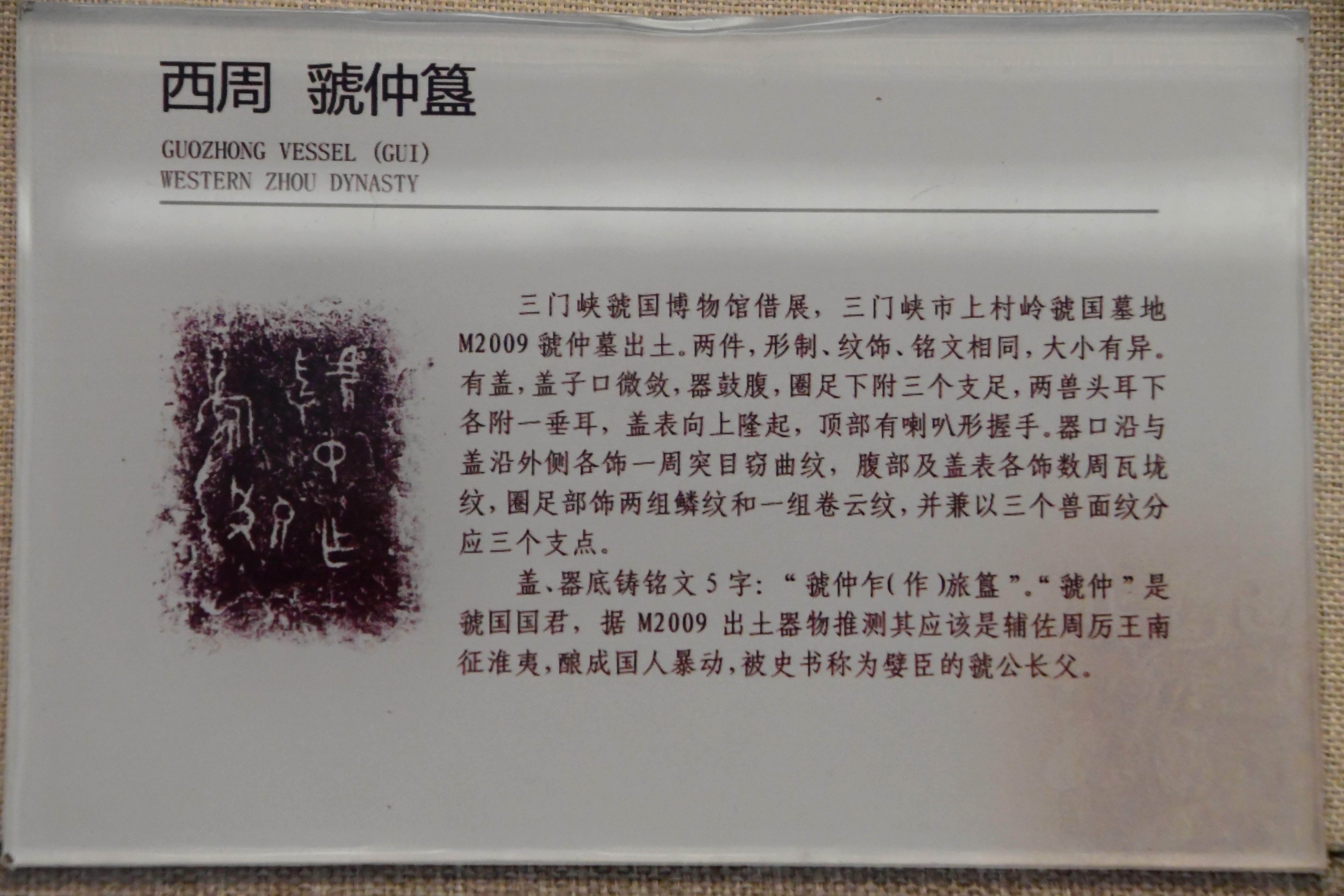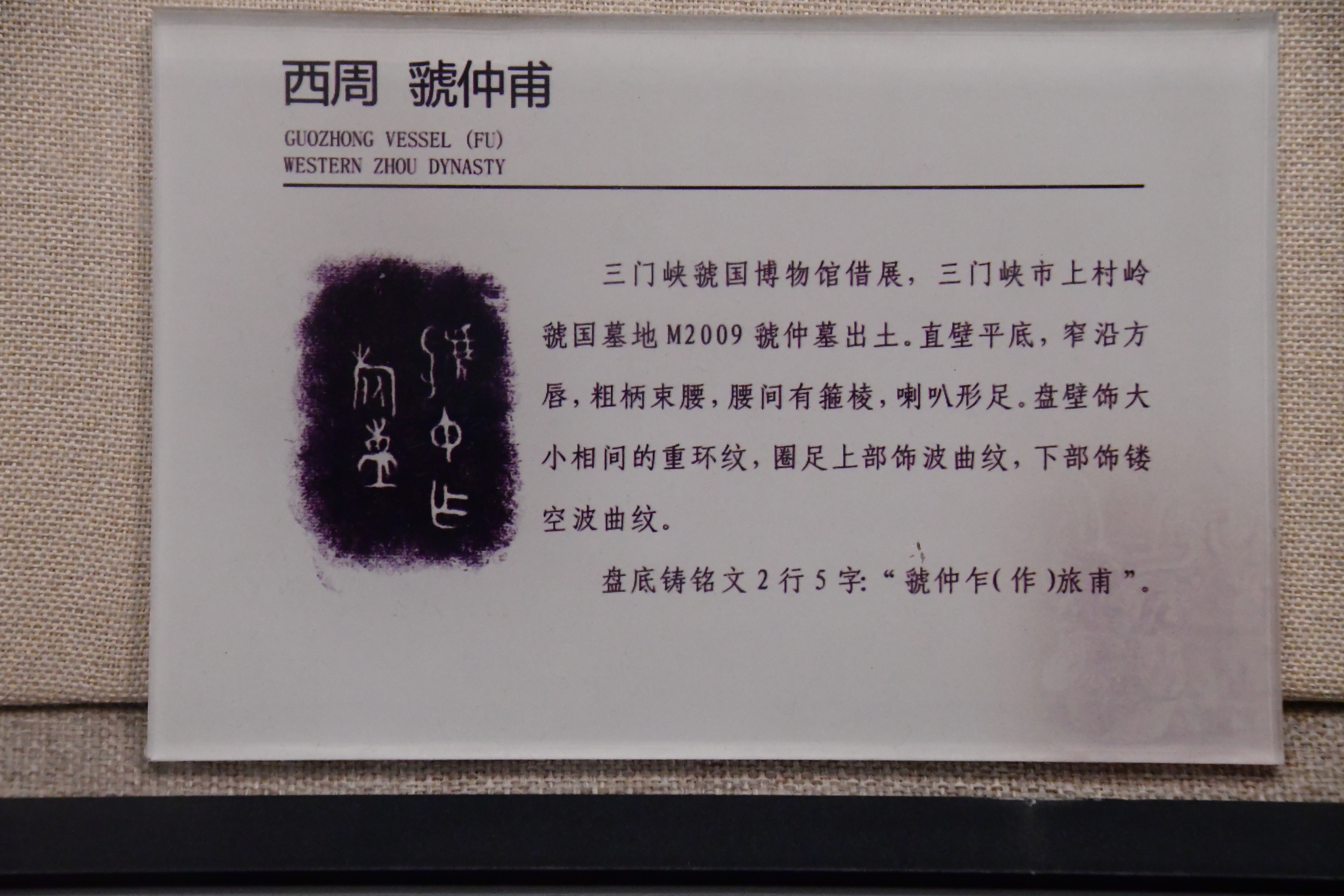 三門峽虢國博物館借展,三門峽市上村嶺虢國墓地 M2009 虢仲墓出土。直壁平底,窄沿方唇,粗柄束腰,腰間有箍棱,喇叭形足。盤壁飾大小相間的重環紋,圈足上部飾波曲紋,下部飾鏤空波曲紋。 盤底鑄銘文 2 行 5 字:“虢仲乍(作)旅甫”。