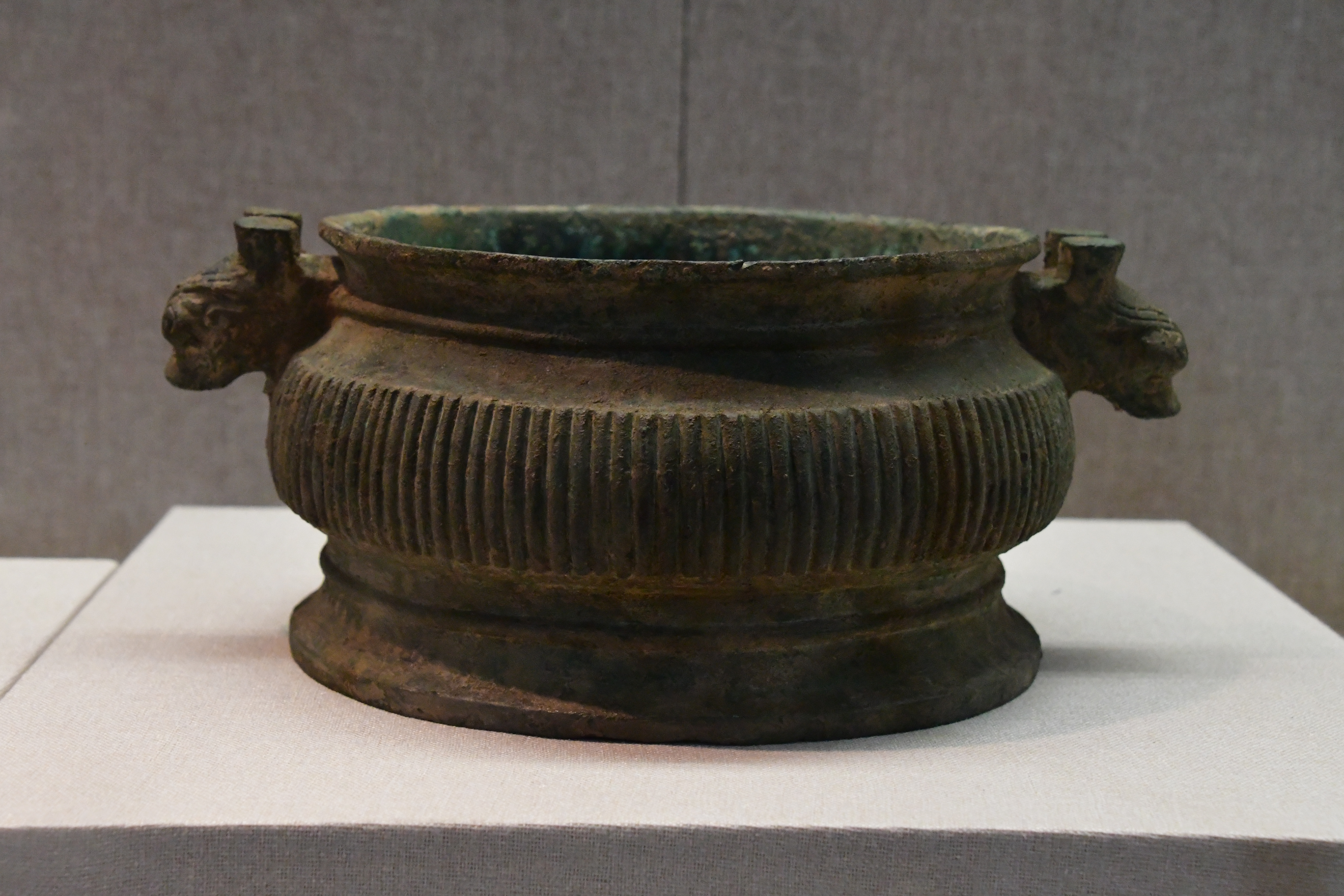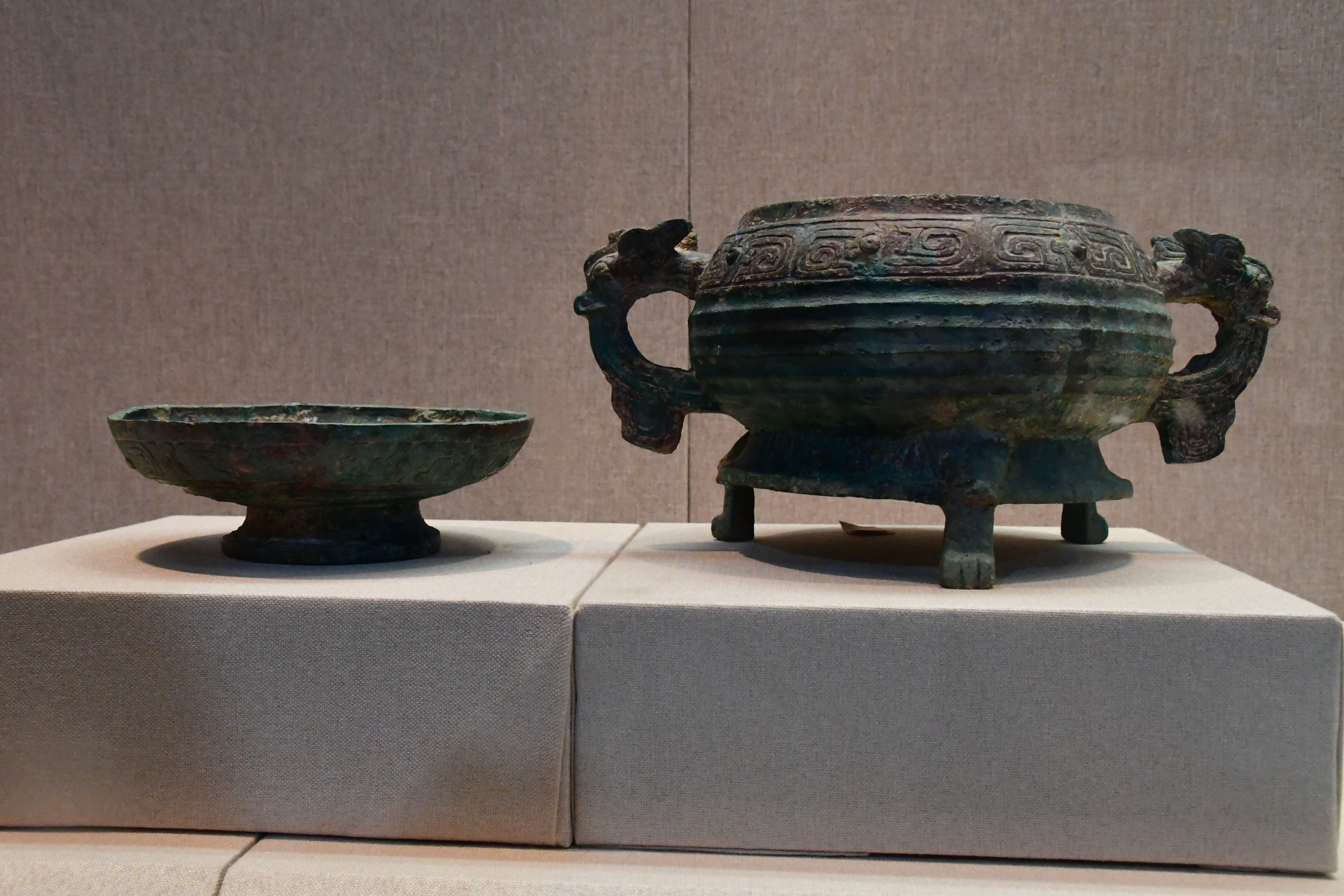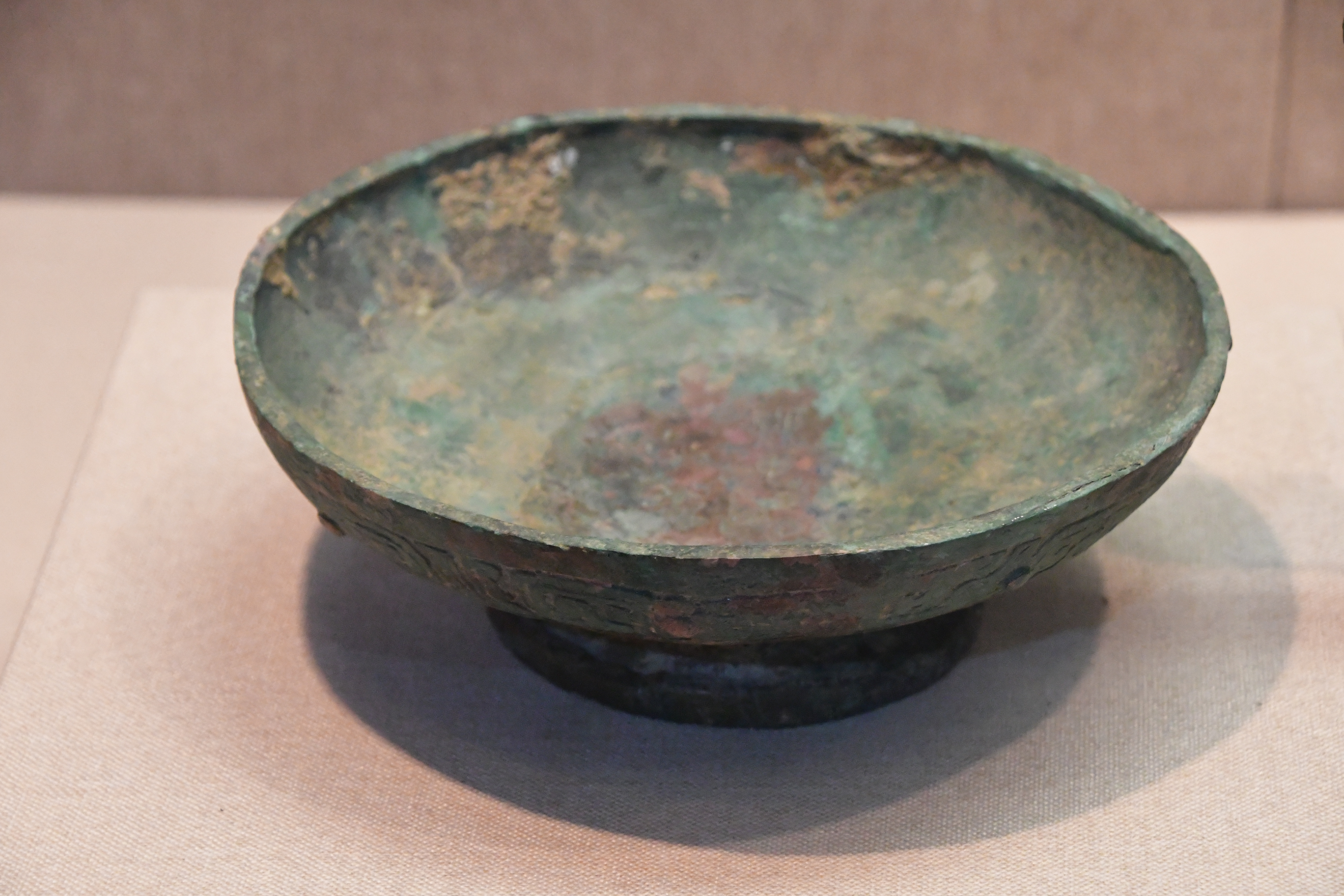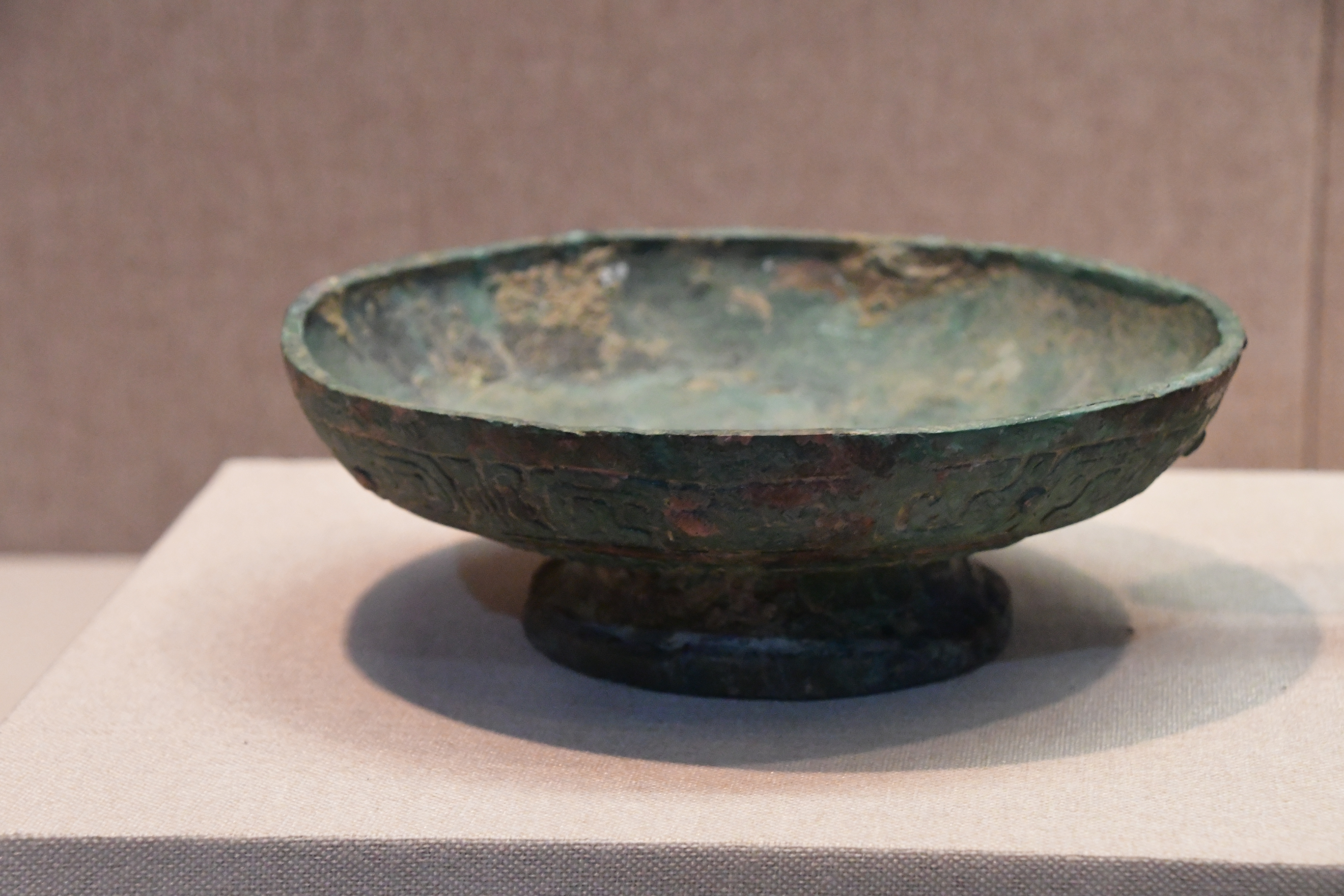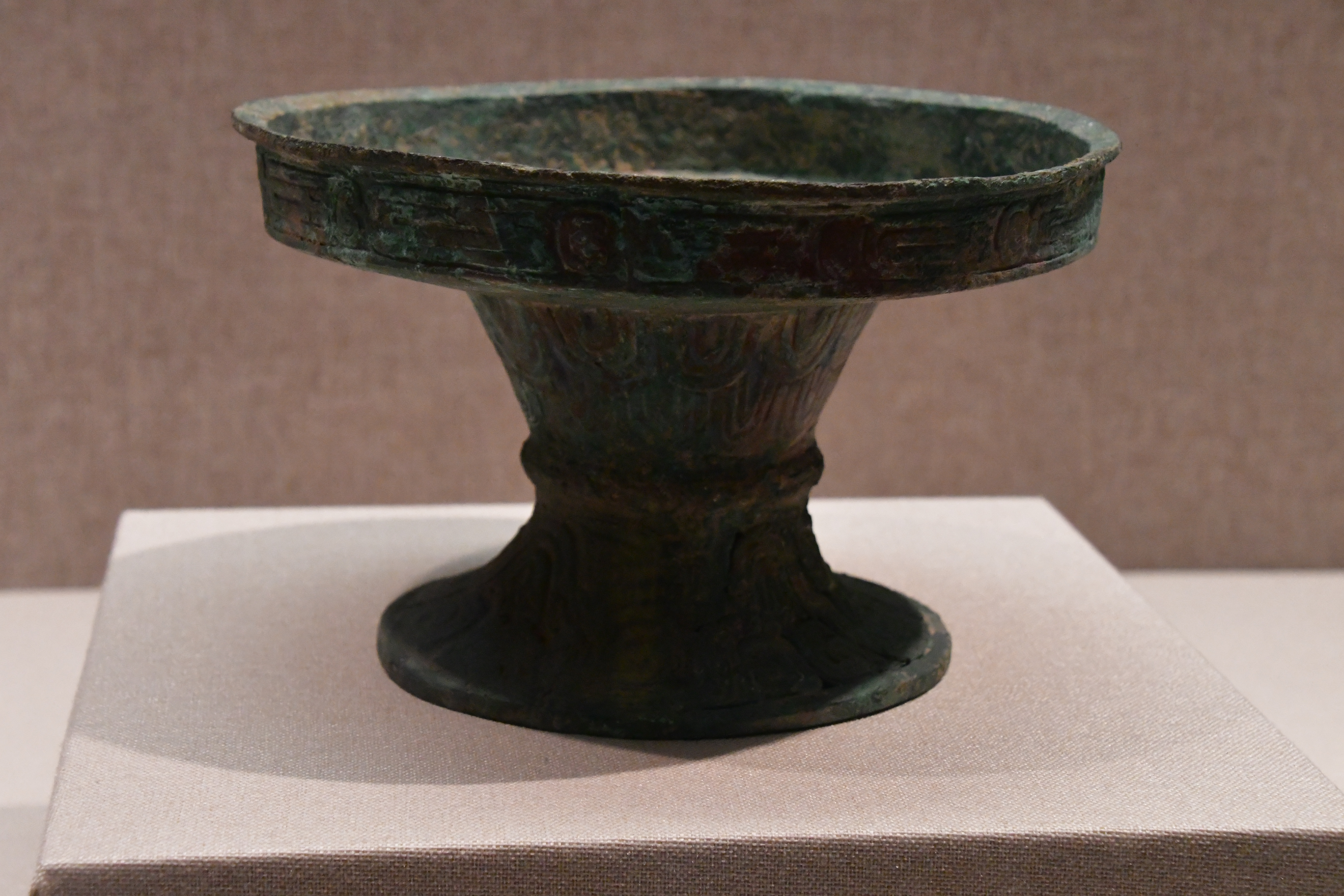 三門峽虢國博物館借展,三門峽市上村嶺虢國墓地 M2009 虢仲墓出土。直壁平底,窄沿方唇,粗柄束腰,腰間有箍棱,喇叭形足。盤壁飾大小相間的重環紋,圈足上部飾波曲紋,下部飾鏤空波曲紋。 盤底鑄銘文 2 行 5 字:“虢仲乍(作)旅甫”。
