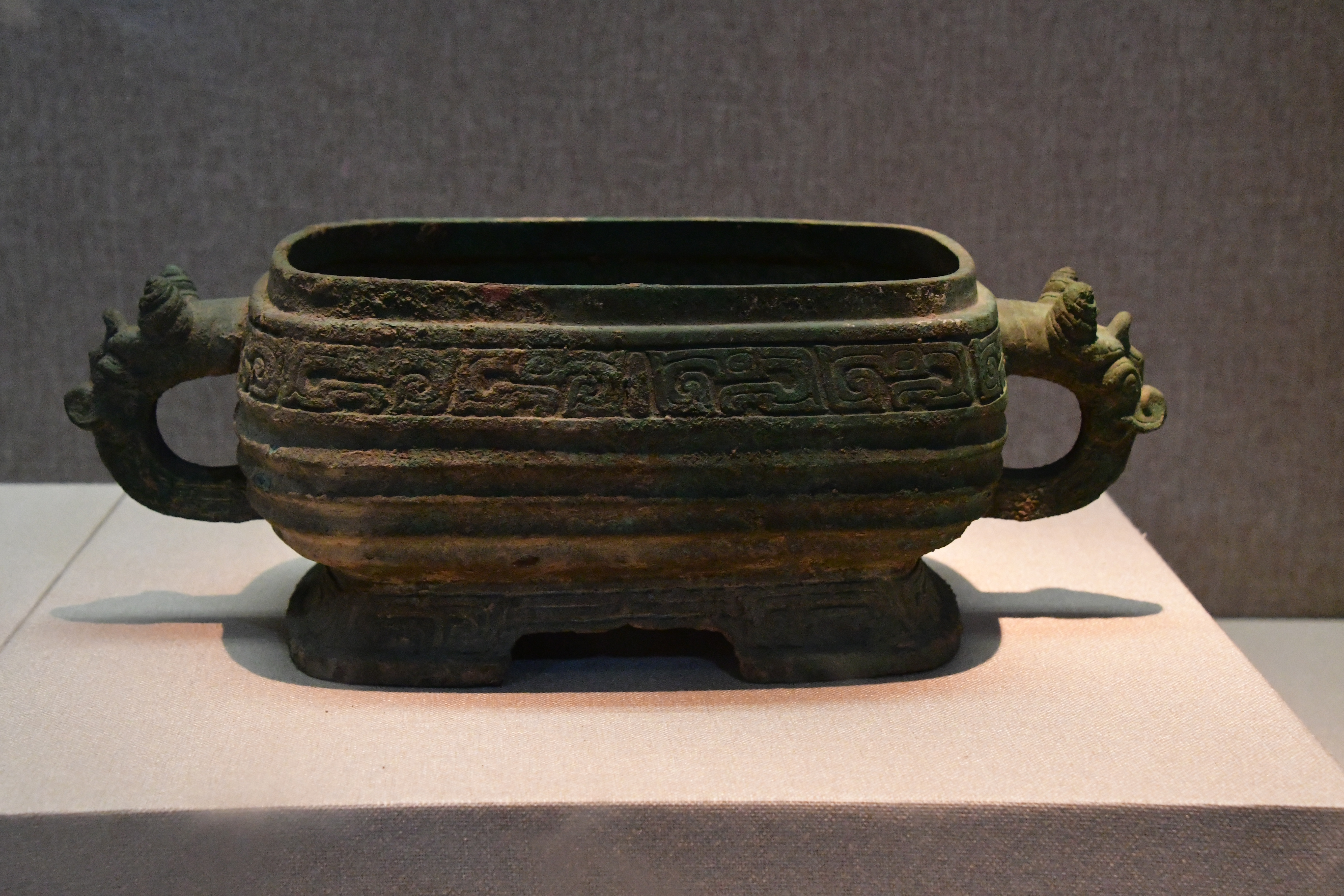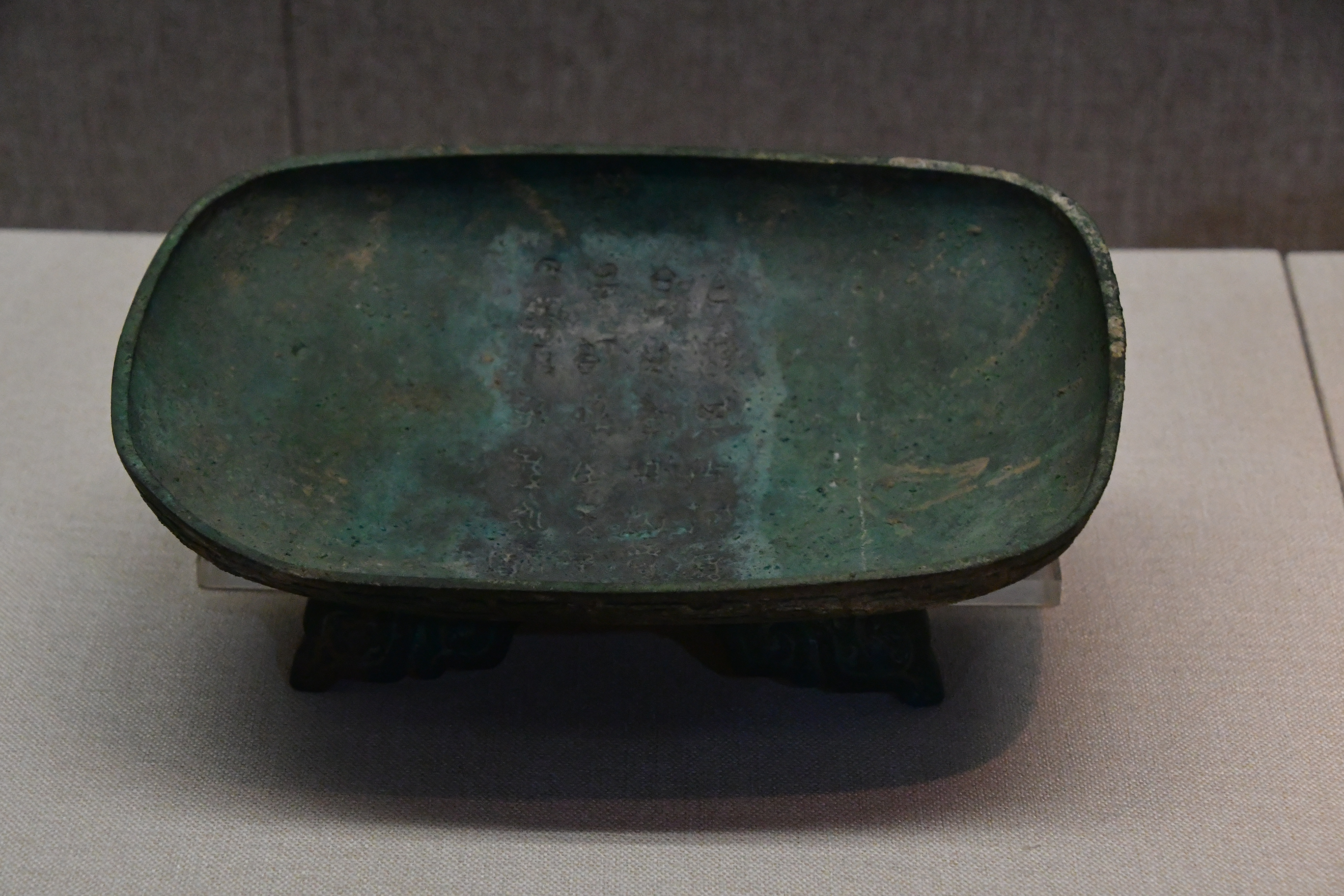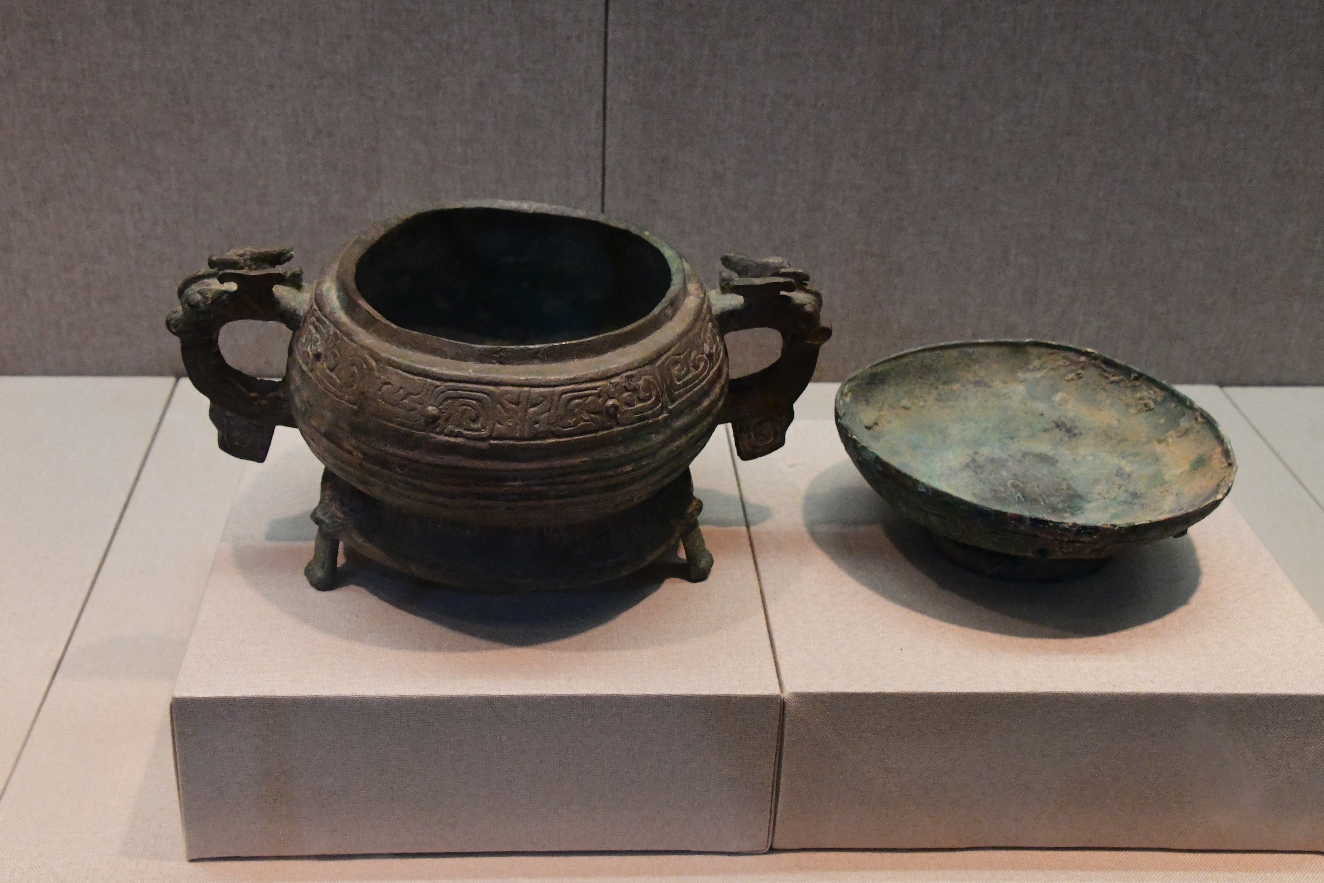 三門峽虢國博物館借展,三門峽市上村嶺虢國墓地 M2009 虢仲墓出土。平沿方唇,淺腹,兩附耳高出器口,圈足低而外撇,圈足下附三獸足,腹部與圈足均飾獸帶紋。 盤底鑄銘文 2 行 5 字:“虢仲乍(作)旅盤”。