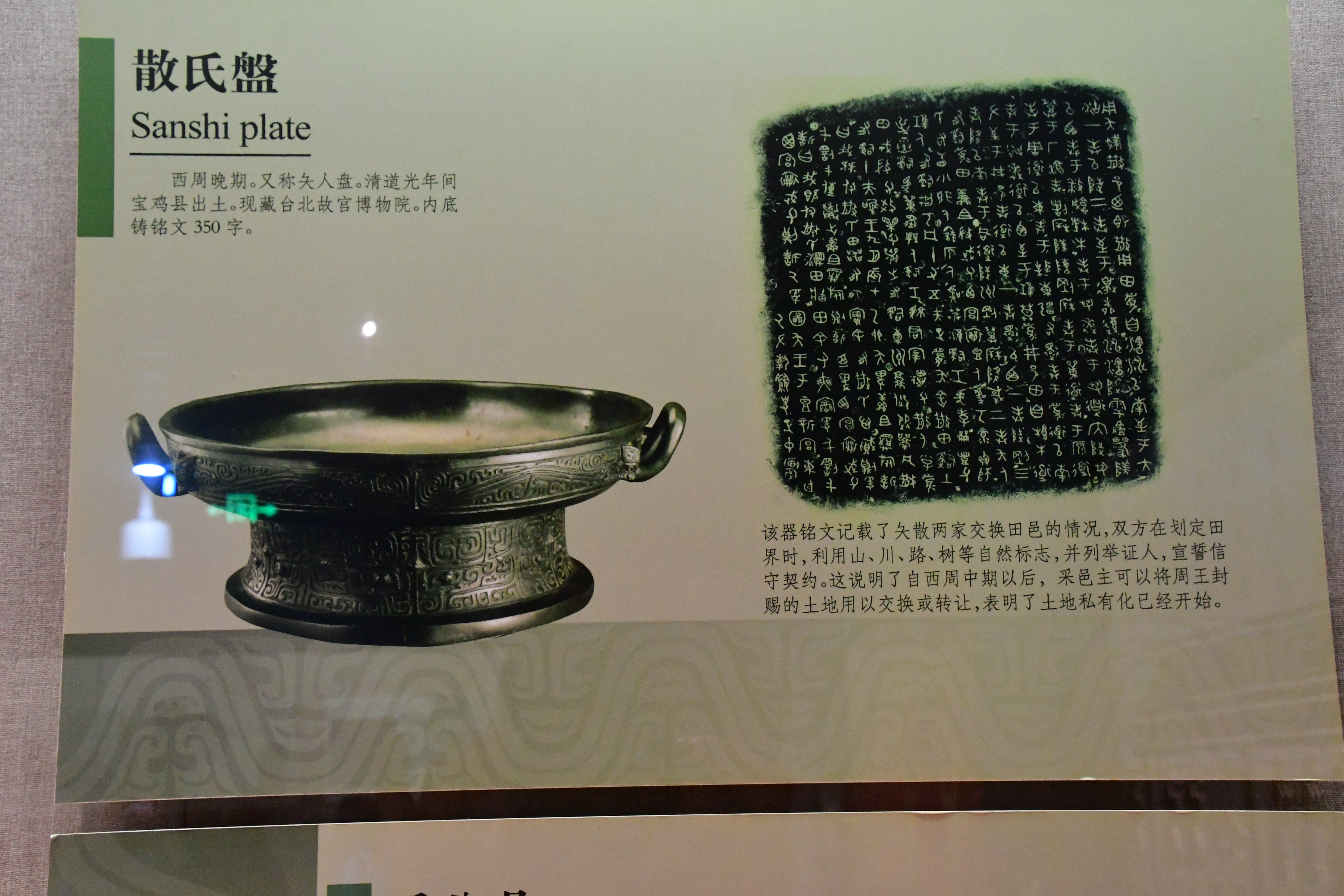 - 서주 말기의 유물이다. 시인반(矢人盤)이라고도 불린다. 청나라 도광 연간에 보계현에서 출토되었다. 현재 타이베이 고궁박물원에 소장되어 있다. 바닥 안쪽에는 350자의 명문이 주조되어 있다.
