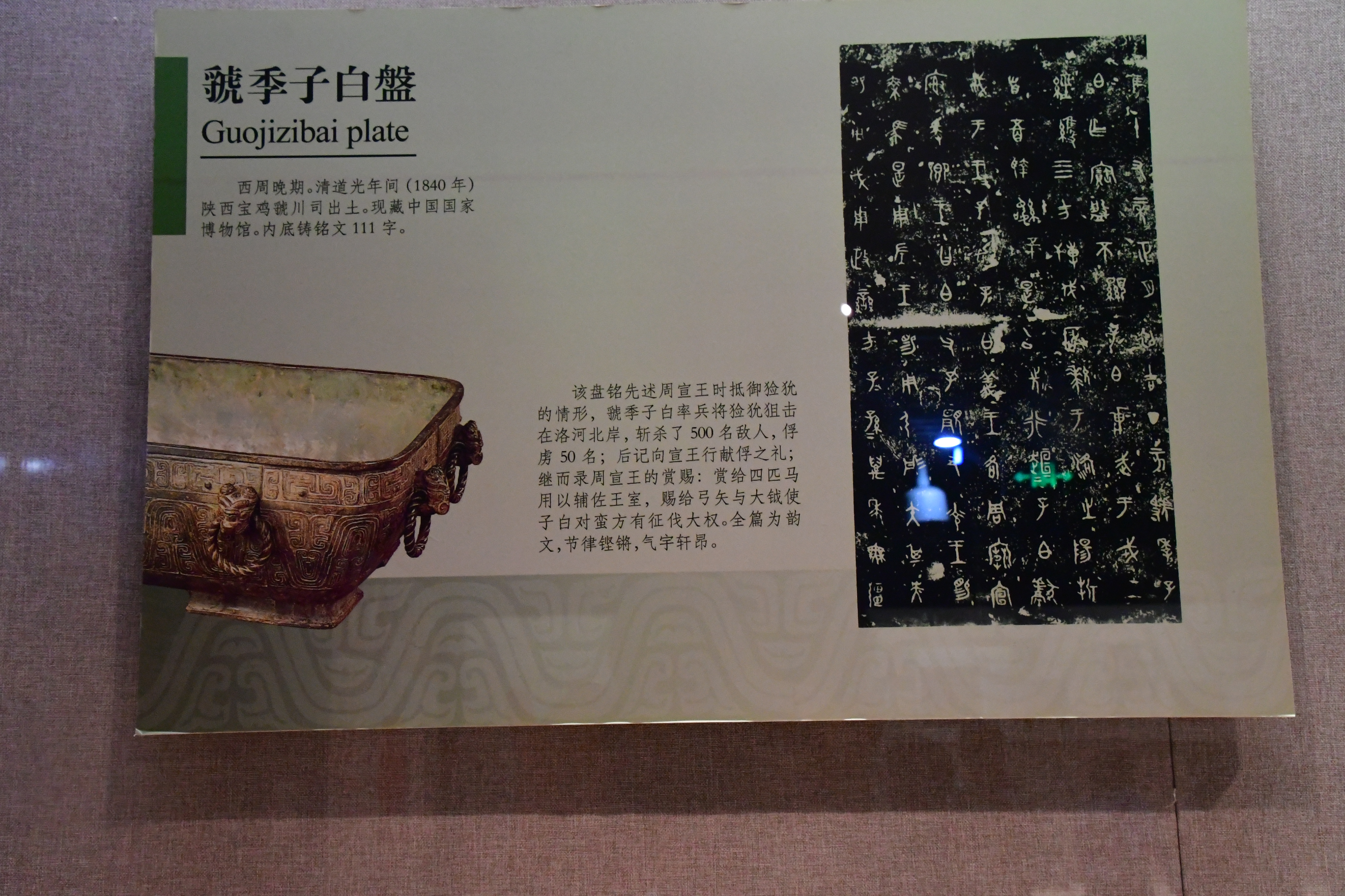 該盤銘先述周宣王時抵御玁狁的情形,虢季子白率兵將玁狁狙擊在洛河北岸,斬殺了 500 名敵人,俘虜 50 名;後記向宣王行獻俘之禮;繼而錄周宣王的賞賜:賞給四匹馬用以輔佐王室,賜給弓矢與大鉞使子白對蠻方有征伐大權。全篇爲韻文,節律鏗鏘,氣宇軒昂。