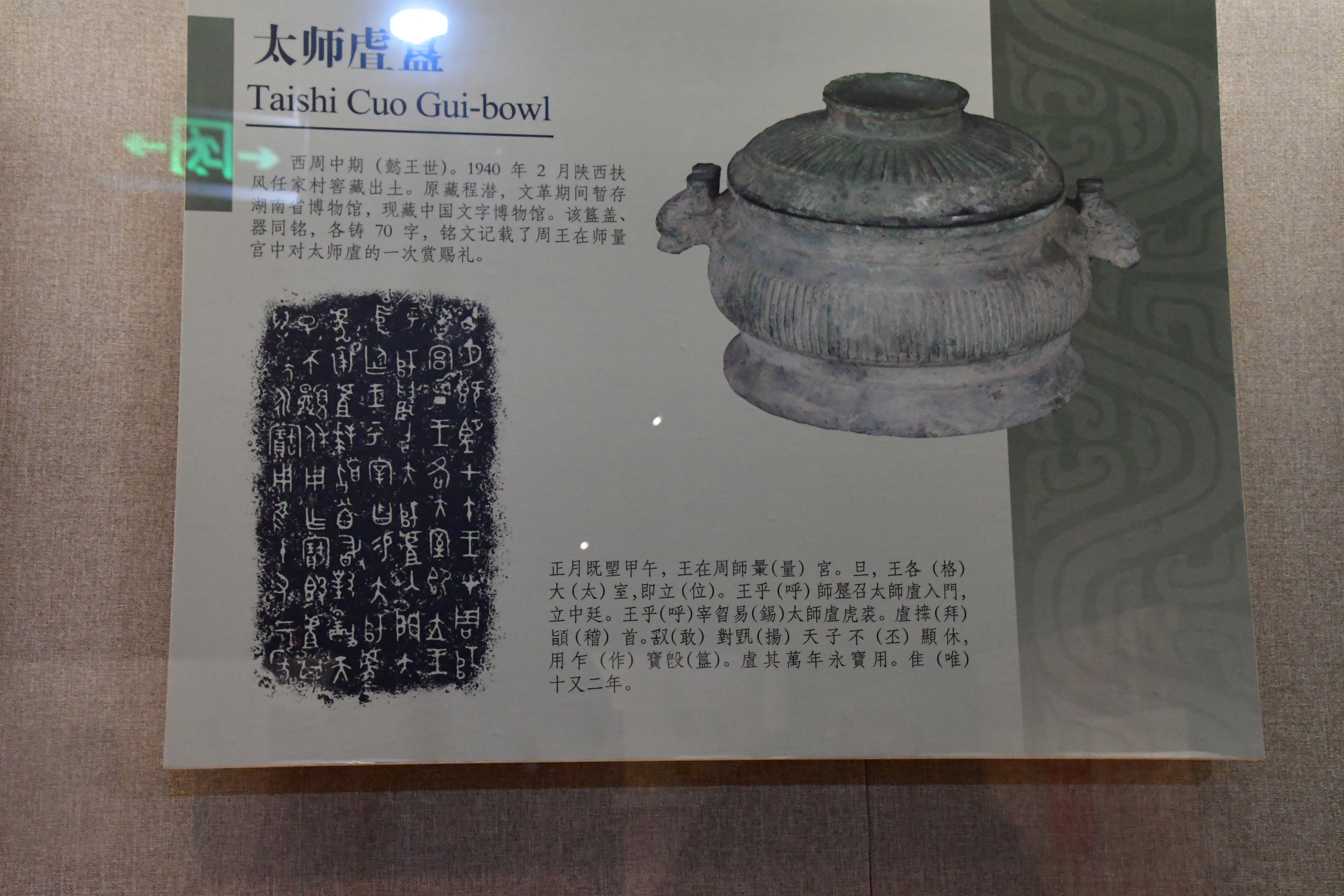 - 서주 만기의 유물이다. 청나라 도광 연간(1840년) 섬서성 보계시 괵천사에서 출토되었다. 현재 중국국가박물관에 소장되어 있다. 바닥 안쪽에는 111자의 명문이 주조되어 있다.