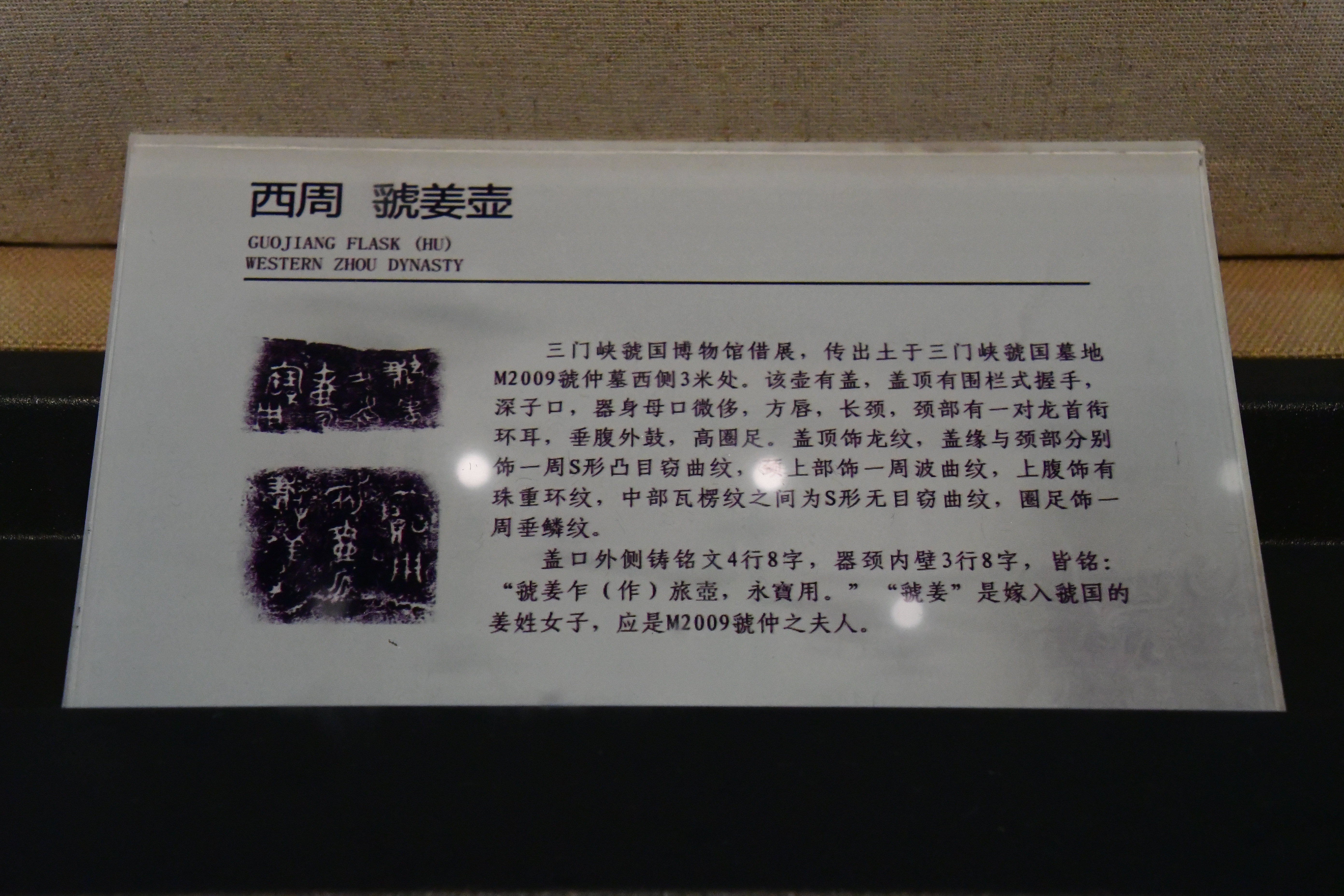 삼문협 괵국박물관 대여 전시 유물로, 삼문협 괵국묘지 M2009 괵중 묘 서쪽 3m 지점에서 출토된 것으로 전해진다. 이 호(壺:병)는 뚜껑이 있으며, 뚜껑 위에는 울타리 형태의 손잡이가 있고 입구가 깊다. 몸체의 입구는 약간 벌어졌으며, 입술 면은 네모나고 목이 길다. 목 부분에는 용 머리가 고리를 물고 있는 형태의 귀(銜環耳)가 한 쌍 달려 있고, 아래로 처진 배는 밖으로 불룩하며 굽(권족)이 높다. 뚜껑 위는 용무늬로, 뚜껑 가장자리와 목 부분은 각각 한 줄의 S자형 돌목절곡문(凸目竊曲紋)으로 장식되었고, 목 상부는 파곡문, 상복부는 주중환문, 중부 기와골 무늬 사이는 S자형 무목절곡문, 굽은 수린문으로 장식되었다. 뚜껑 입구 외측에 4행 8자, 그릇 목 내벽에 3행 8자의 명문이 주조되어 있으며, 내용은 모두 "괵강(虢姜)이 여행용 호를 만드니, 영원히 보배로이 사용하라"이다. '괵강'은 괵나라로 시집온 강(姜)씨 성을 가진 여성으로, 응당 M2009 괵중의 부인일 것이다.