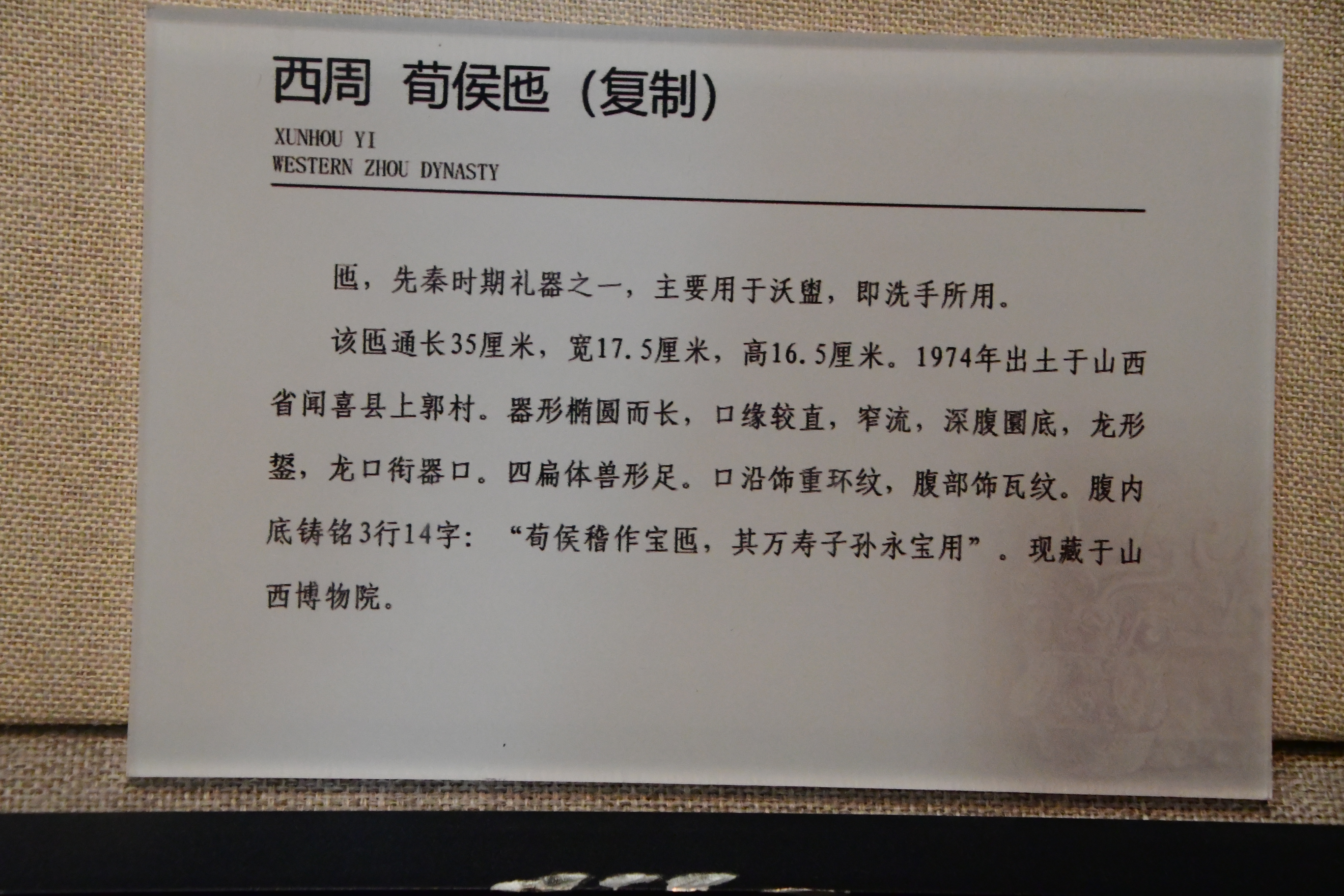 該匜通長 35 厘米,寬 17.5 厘米,高 16.5 厘米。1974 年出土於山西省聞喜縣上郭村。器形橢圓而長,口緣較直,窄流,深腹圈底,龍形鋬,龍口銜器口。四扁體獸形足。口沿飾重環紋,腹部飾瓦紋。腹內底鑄銘 3 行 14 字:“荀侯穄作寶匜,其萬壽子孫永寶用”。現藏於山西博物院。