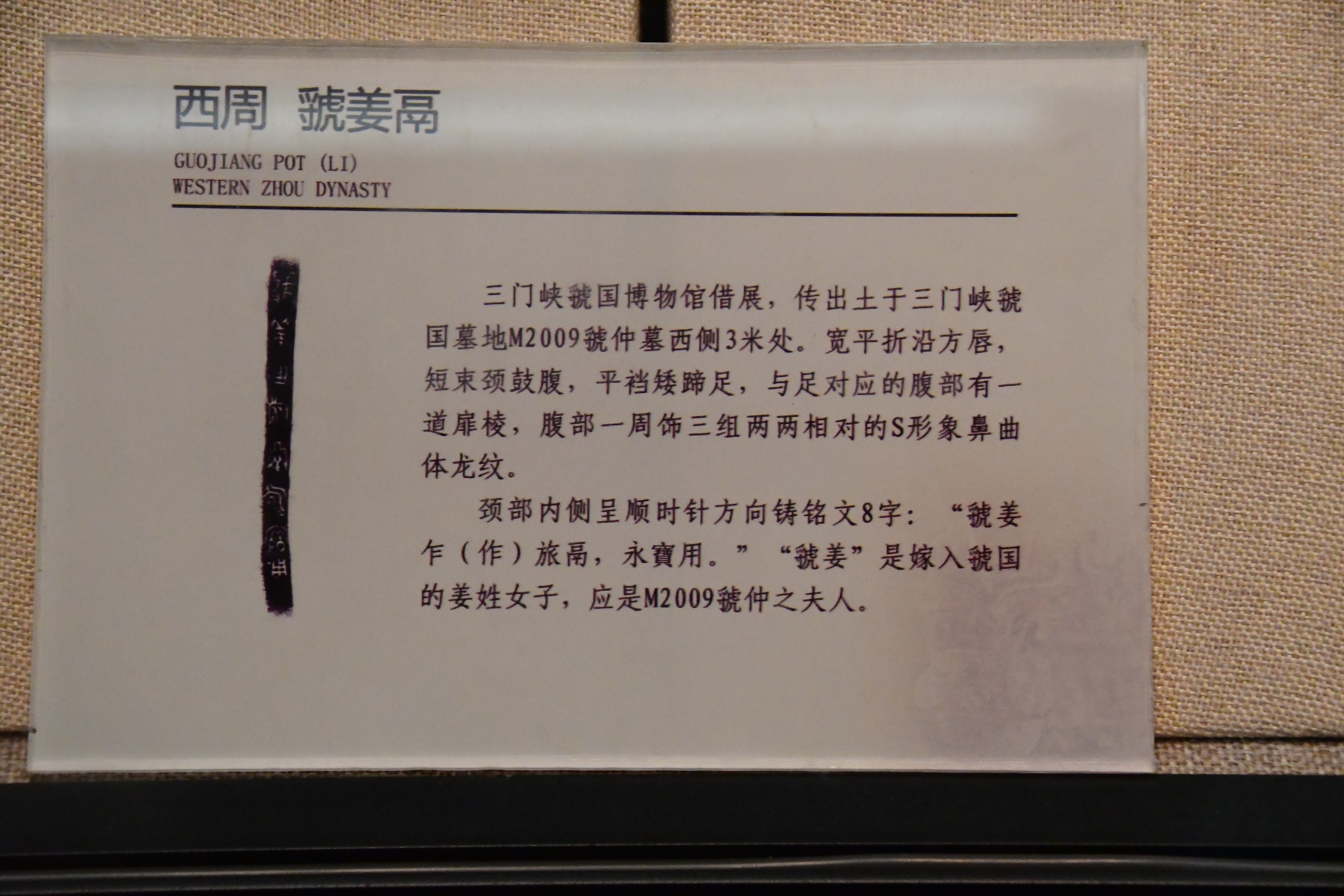 # 삼문협 괵국박물관 대여 전시 유물로, 삼문협 괵국묘지 M2009 괵중묘 서측 3미터 지점에서 출토된 것으로 전해진다. 넓고 평평하며 꺾인 테두리와 각진 입술, 짧고 잘록한 목과 불룩한 몸체, 평평한 가랑이와 낮은 발을 가졌다. 목 부분 안쪽에는 시계 방향으로 "괵강작려격, 영보용(虢姜乍旅鬲, 永寶用)"이라는 8자의 명문이 주조되어 있다.