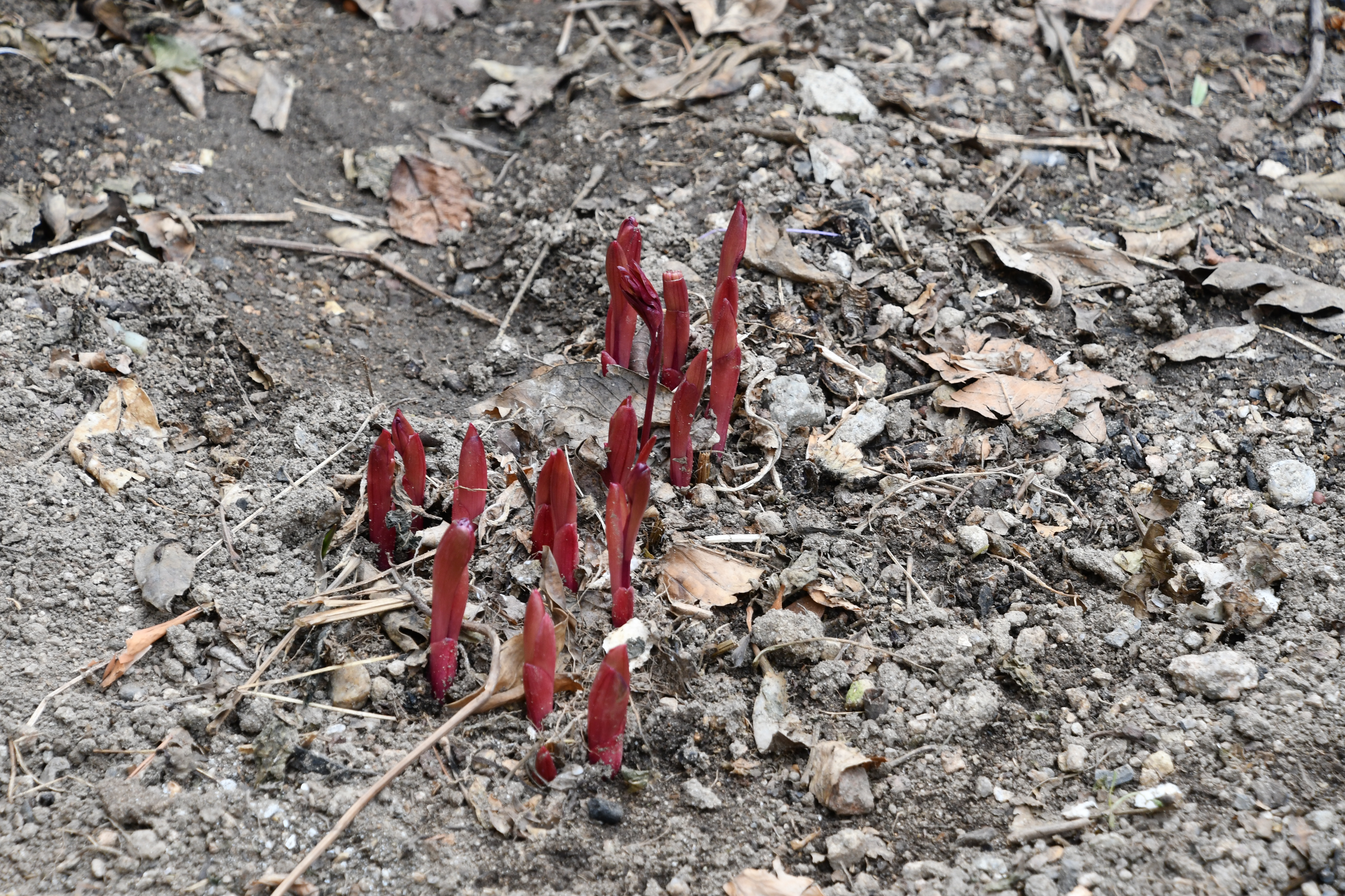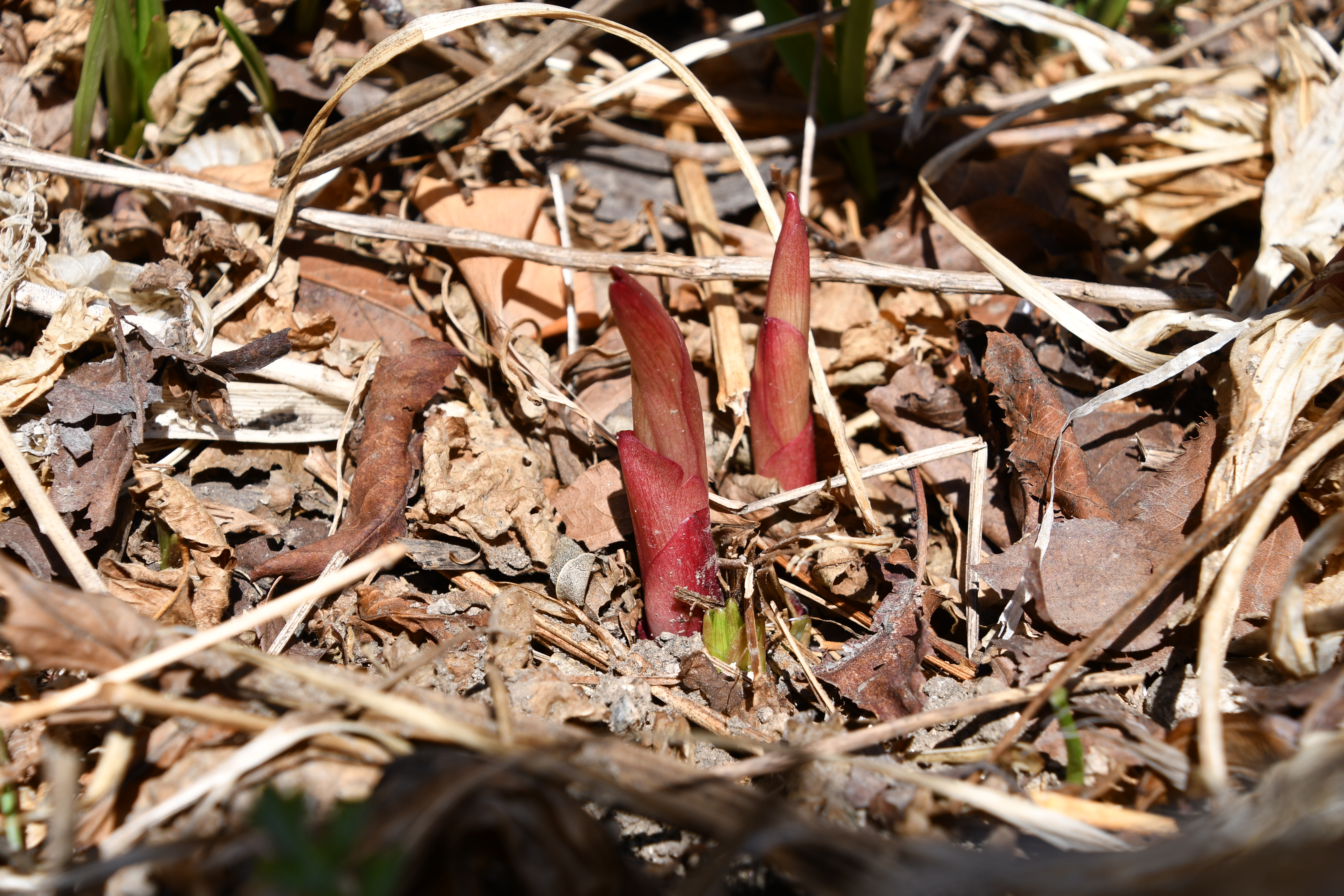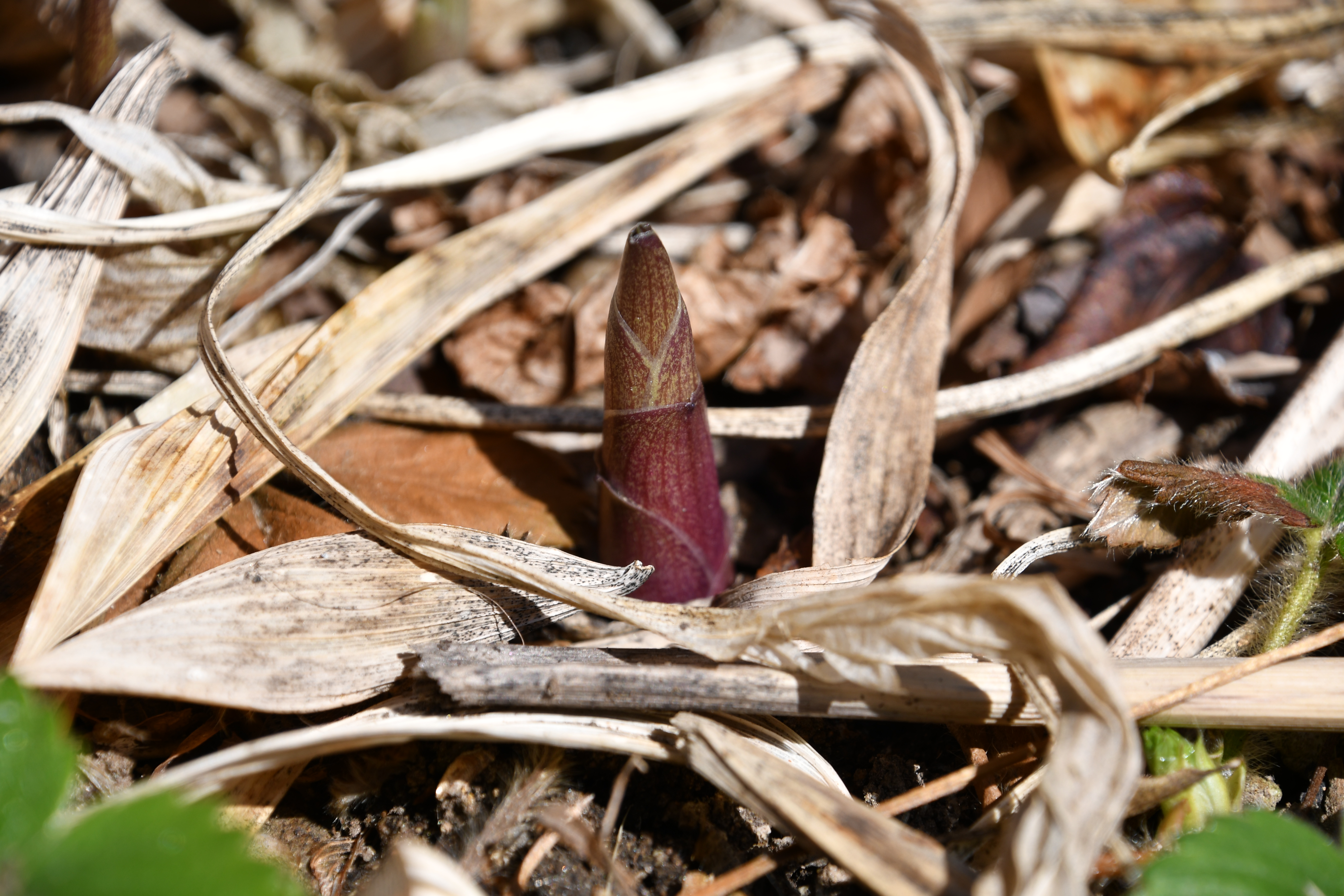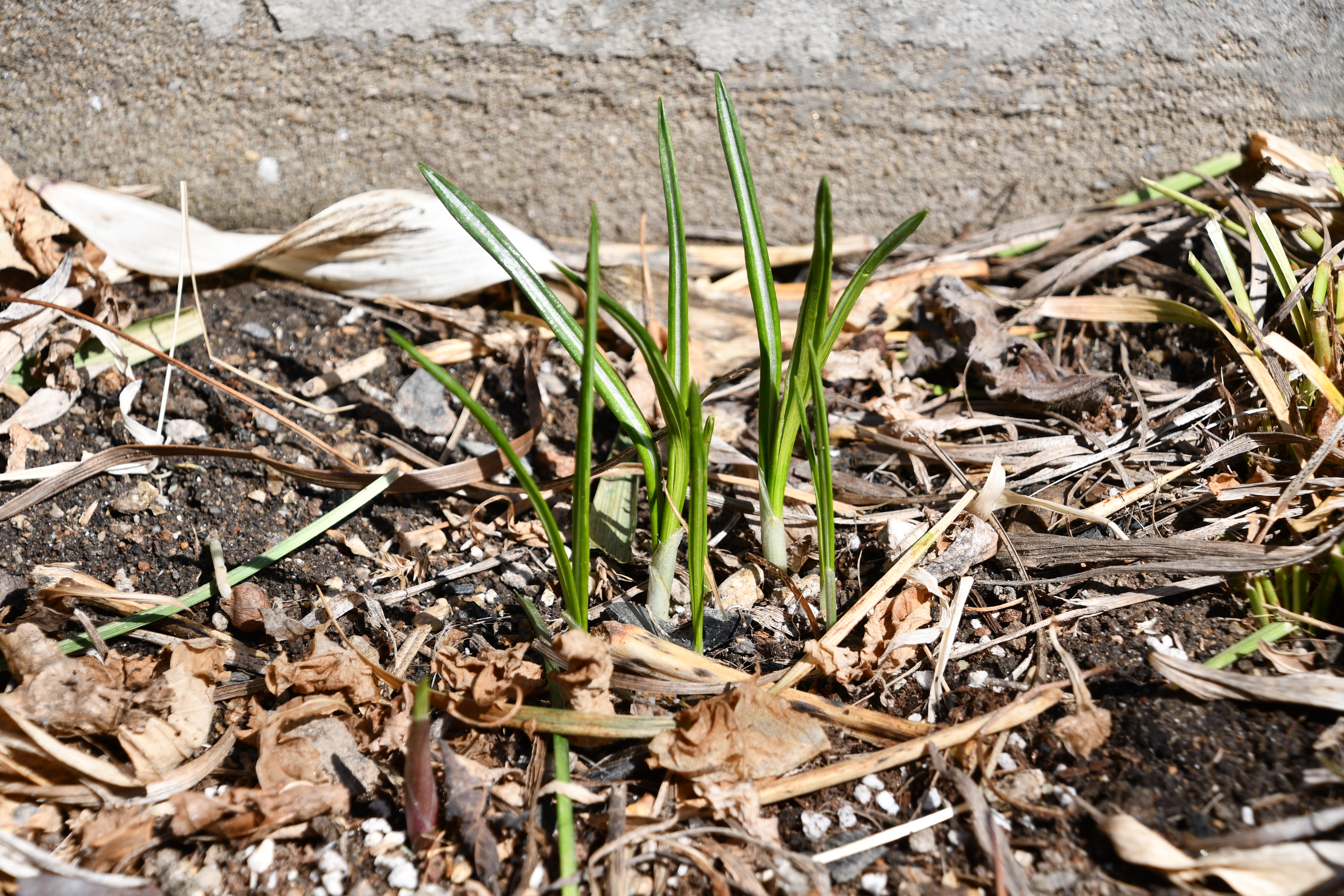 - 묵은 잎 사이로 새순이 돋았다. 포트에 심은 흔적이 그대로 남았다.