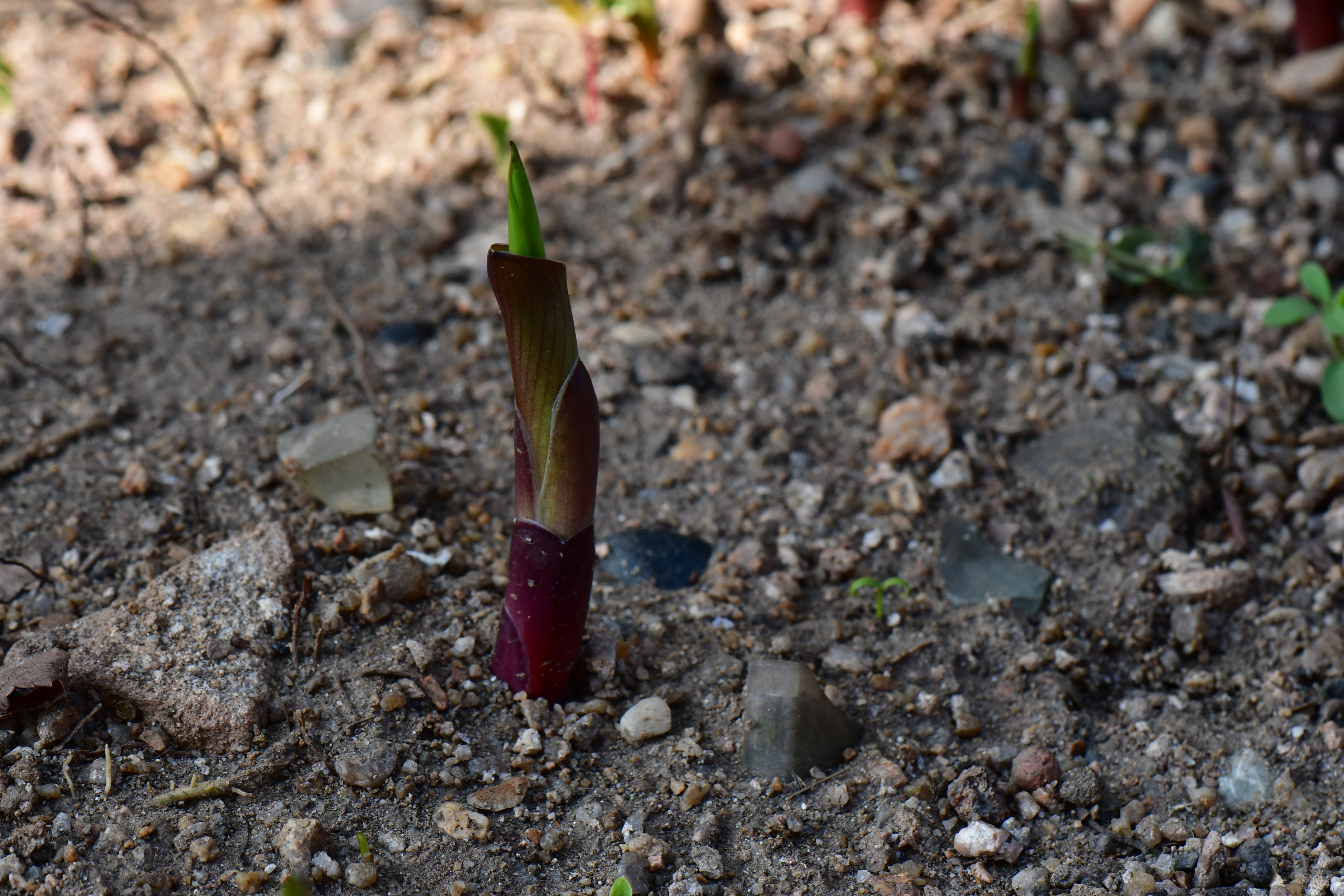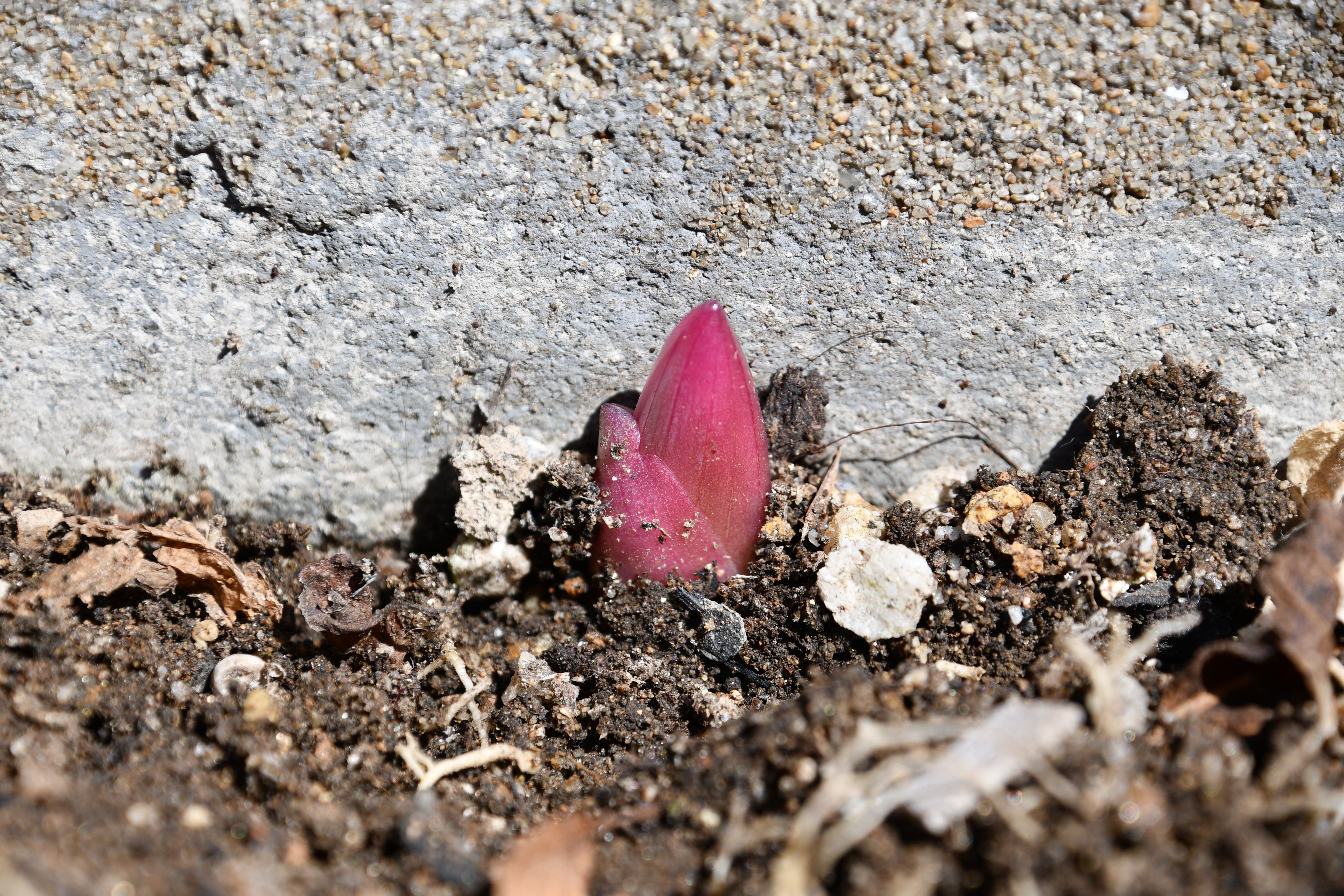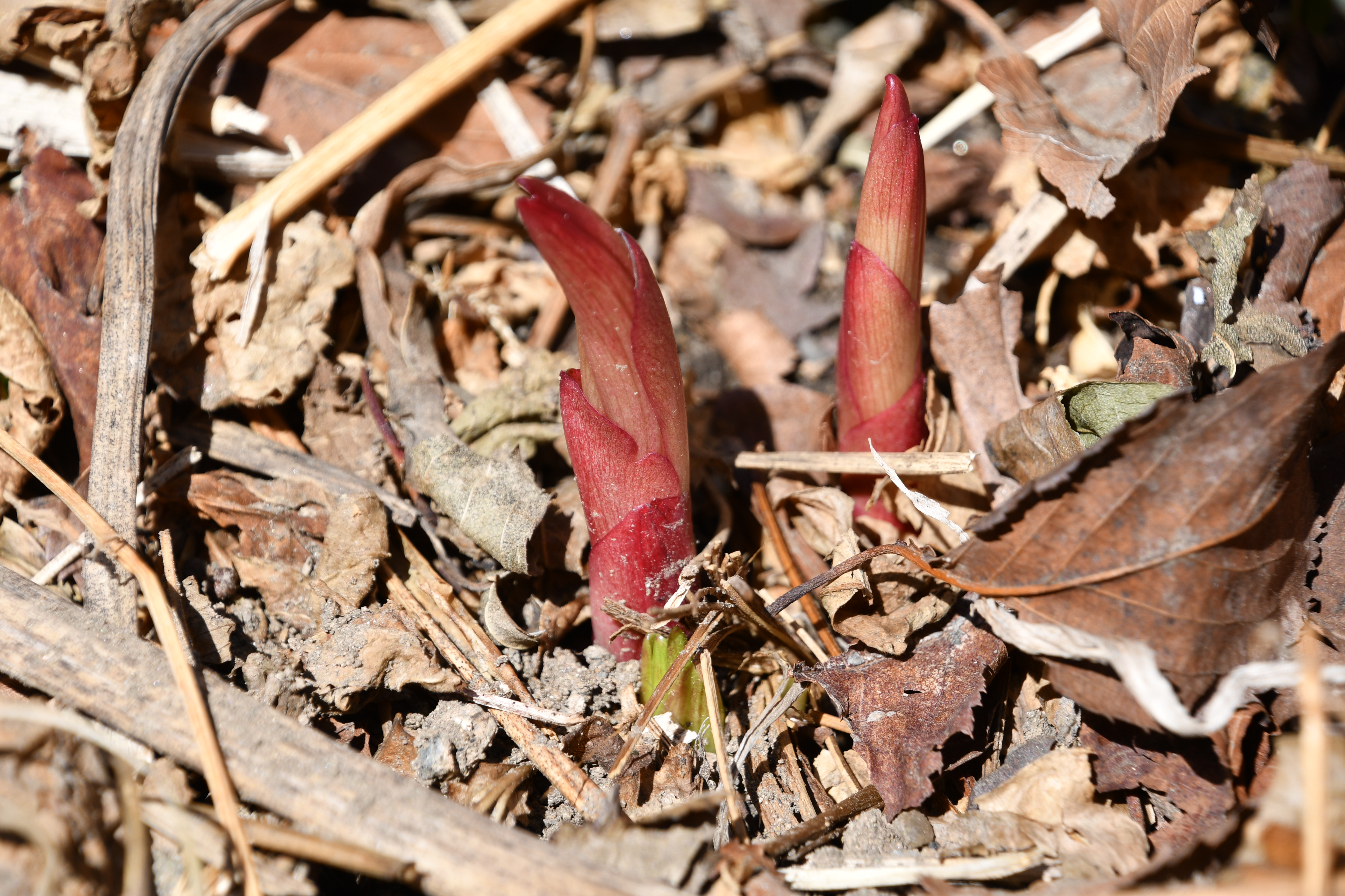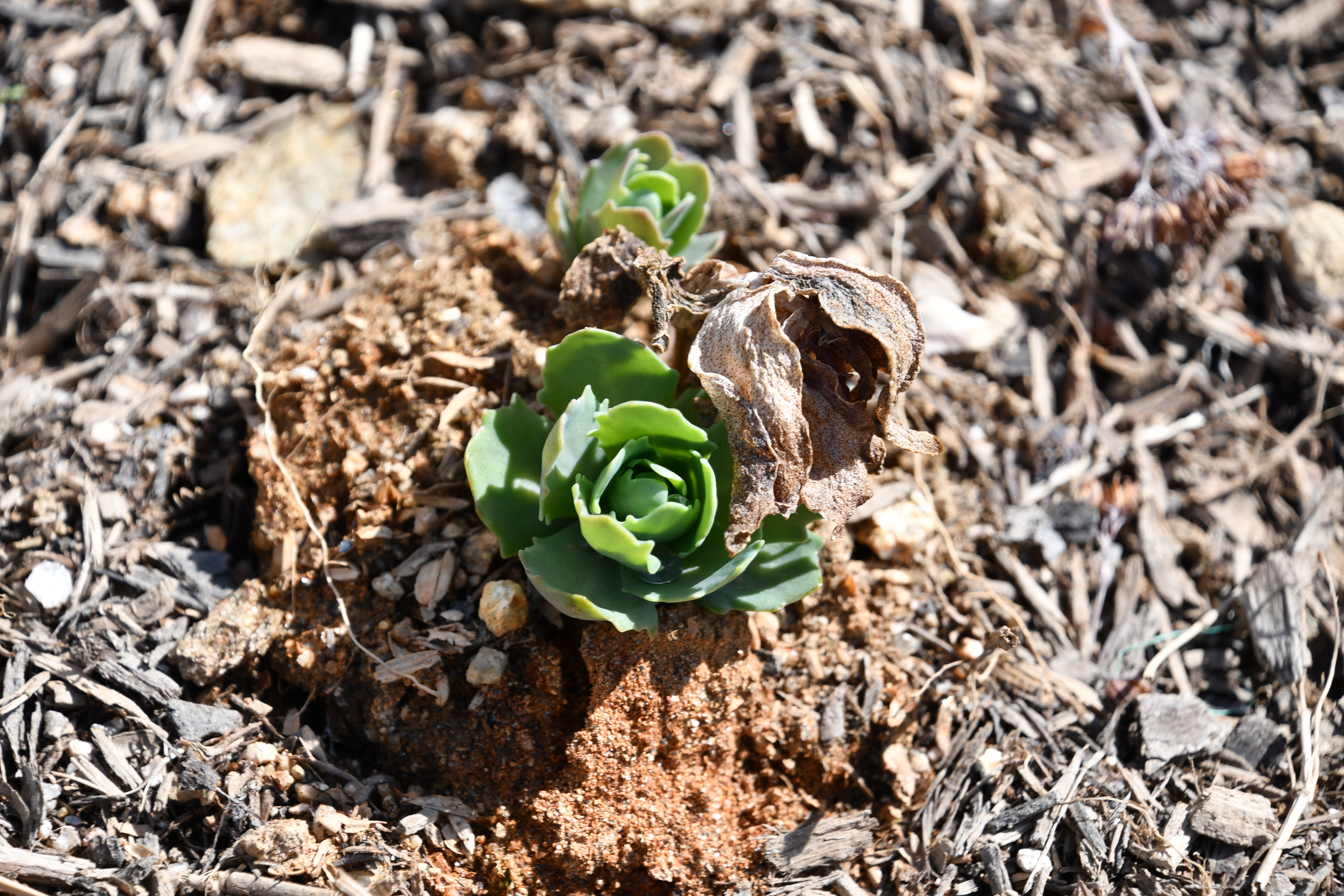 - 묵은 잎 사이로 새순이 돋았다. 포트에 심은 흔적이 그대로 남았다.