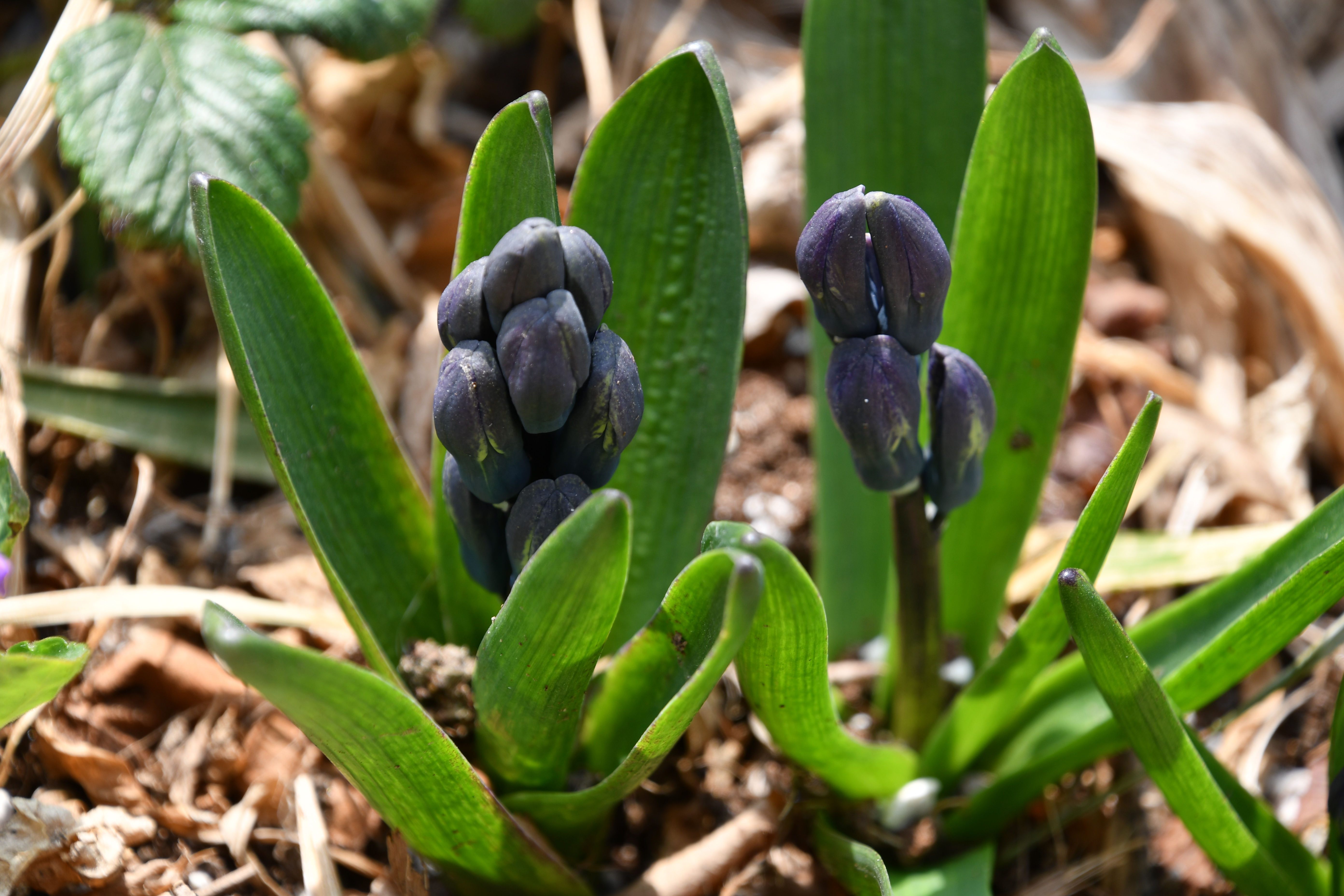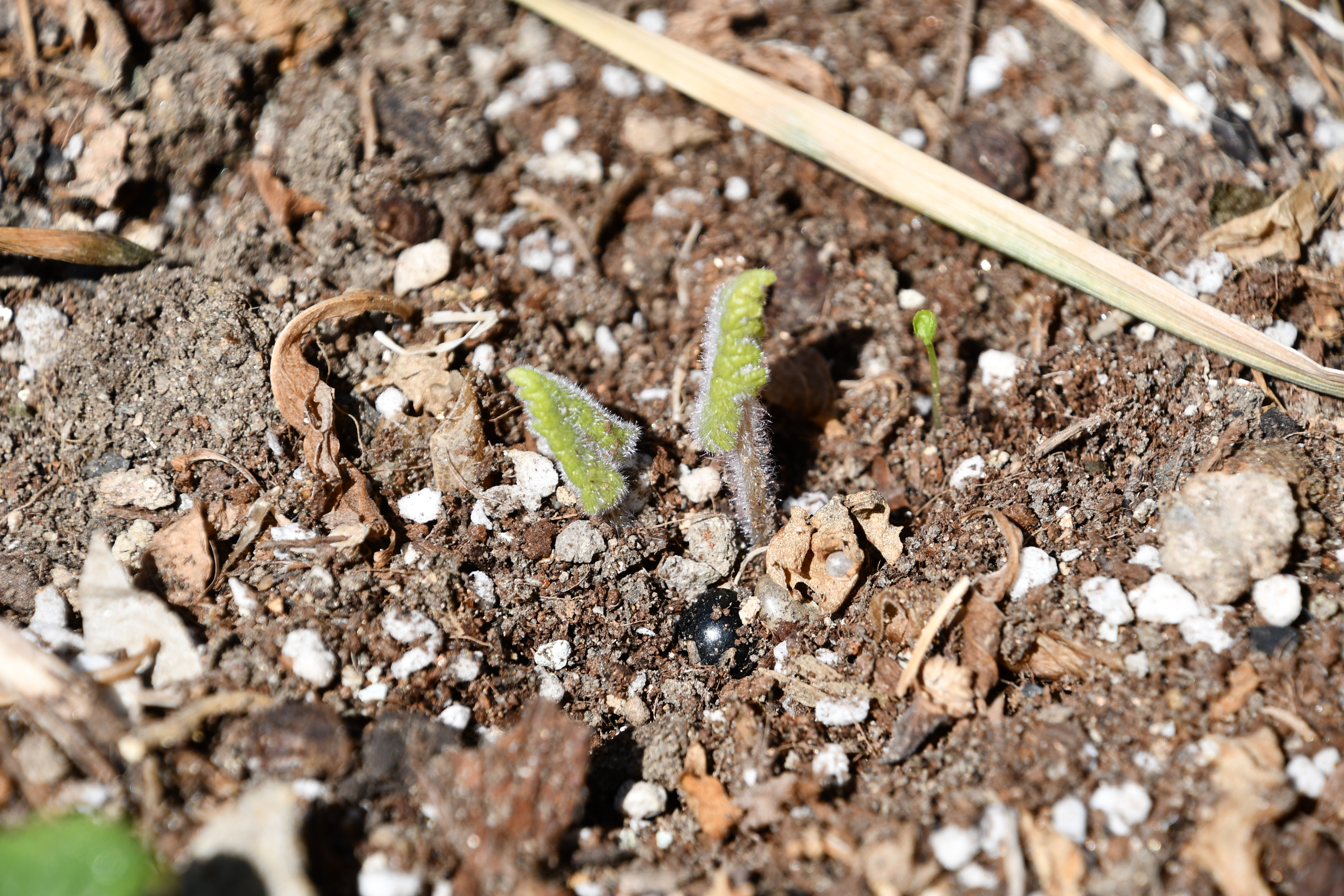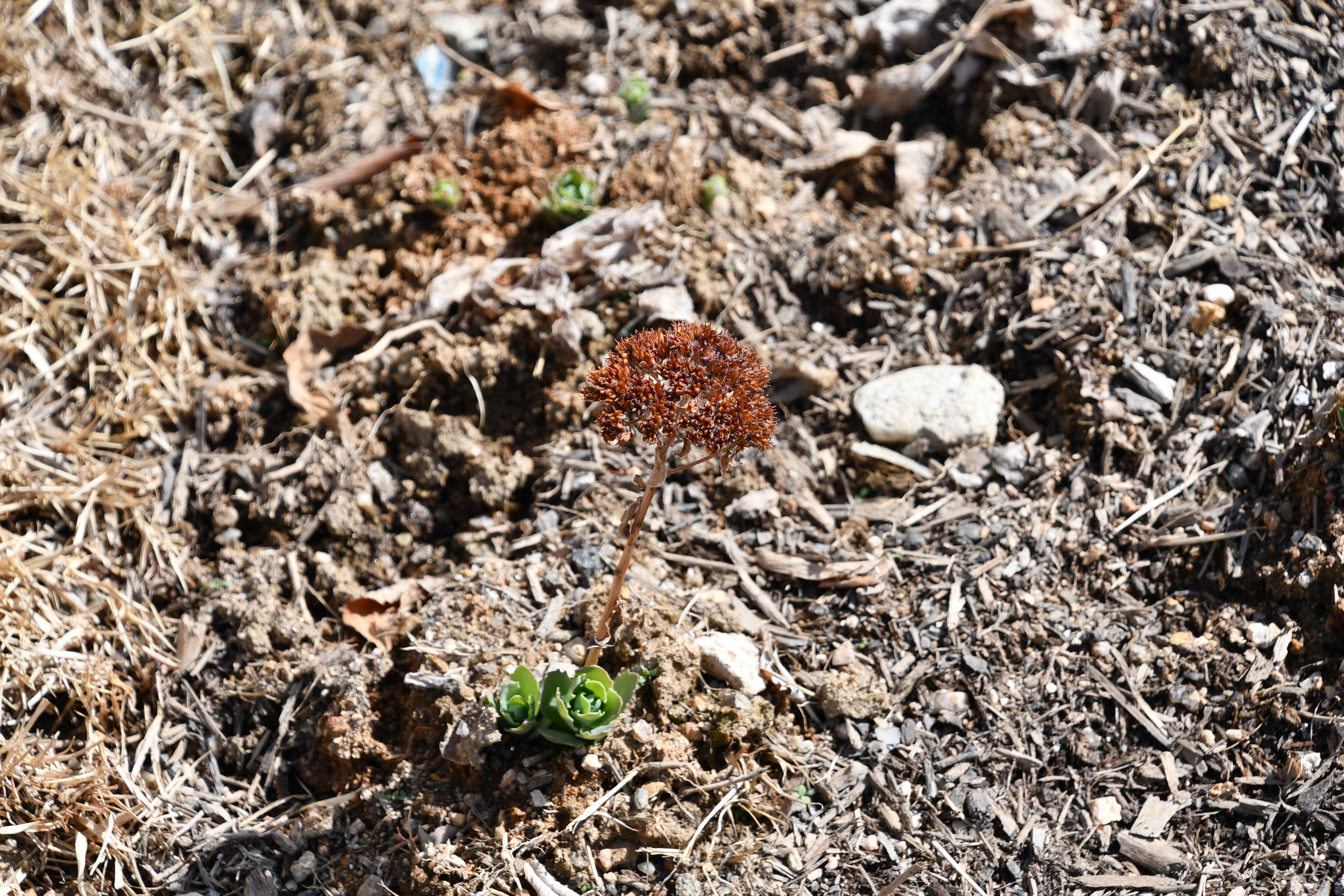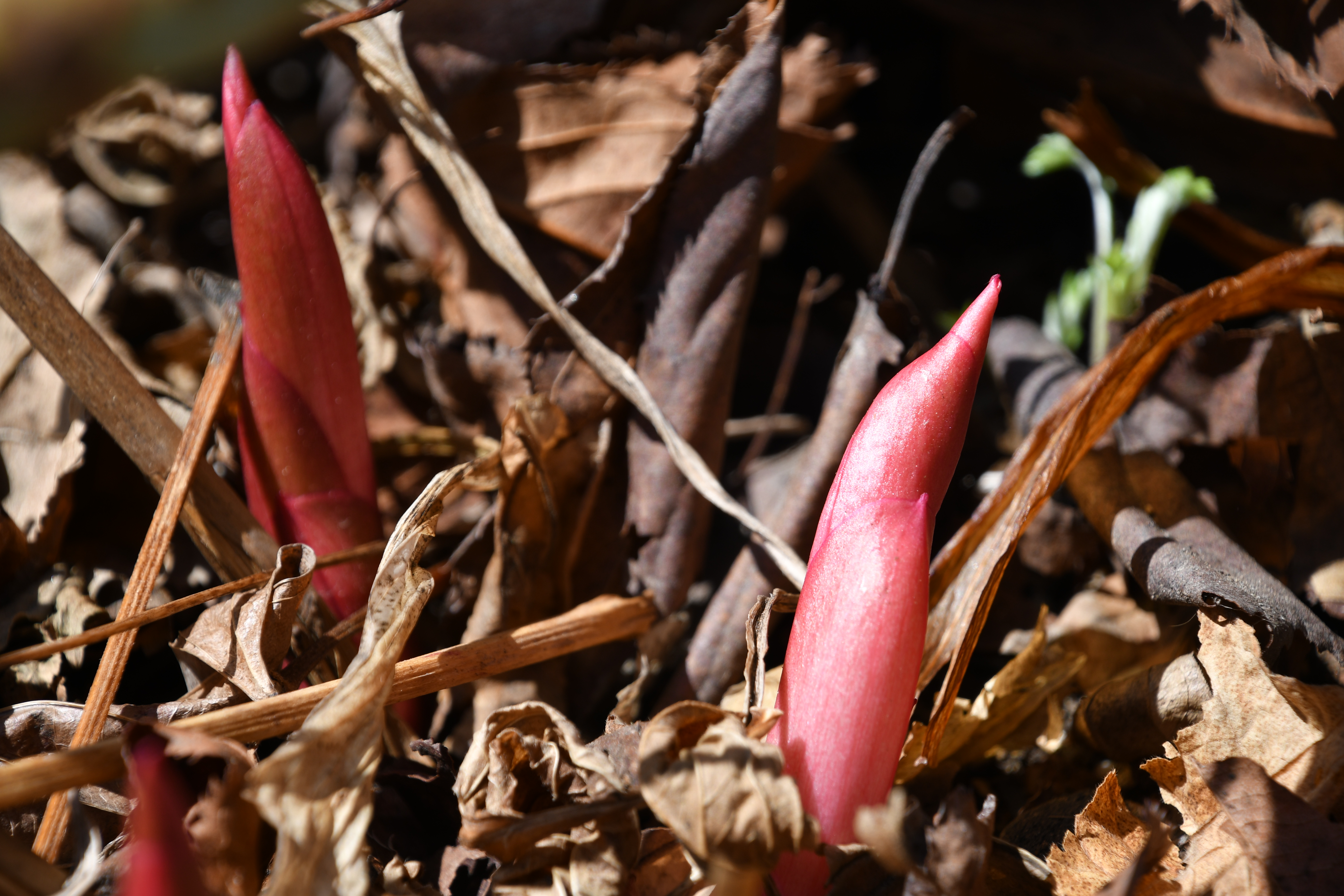 - 묵은 잎 사이로 새순이 돋았다. 포트에 심은 흔적이 그대로 남았다.