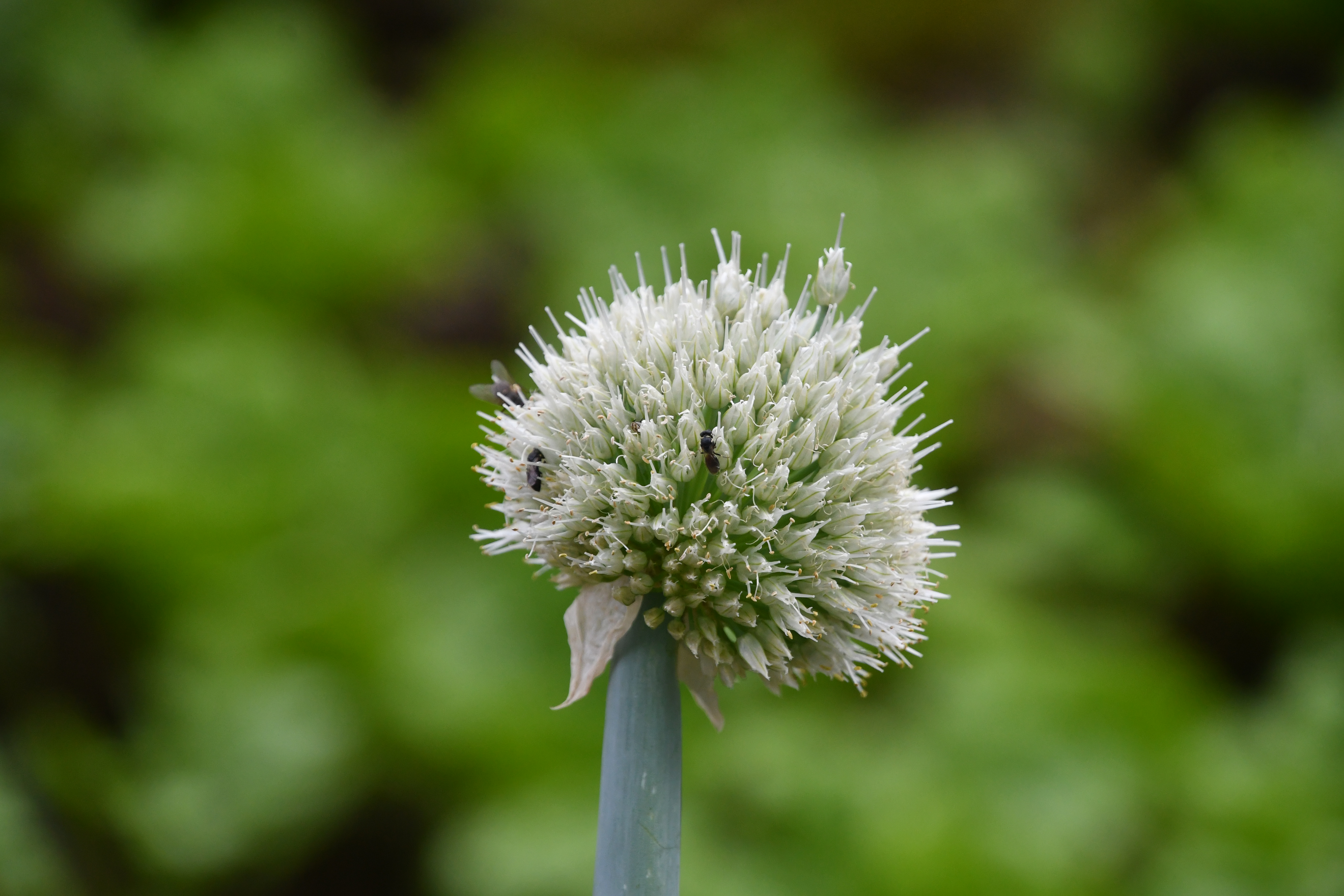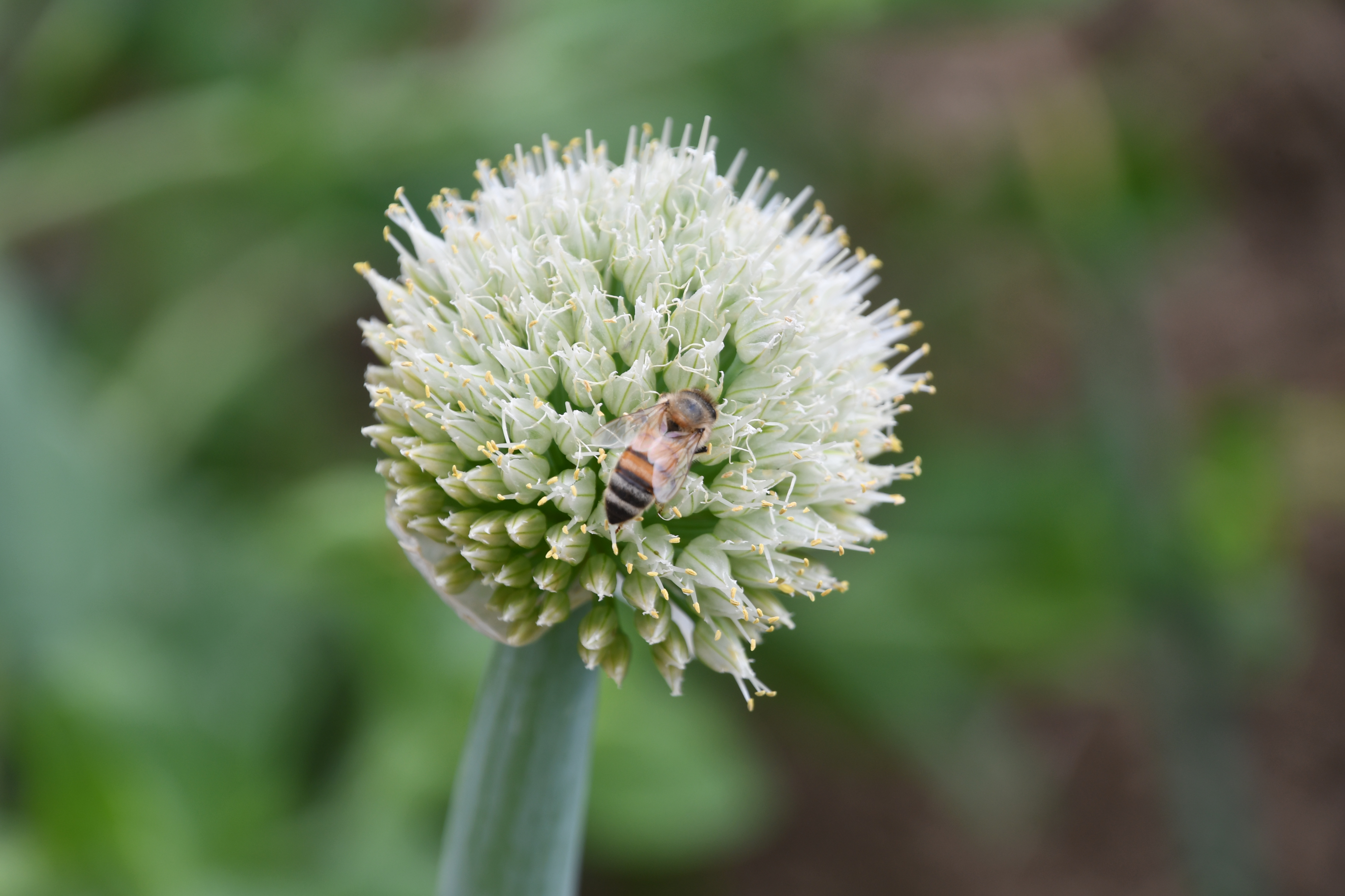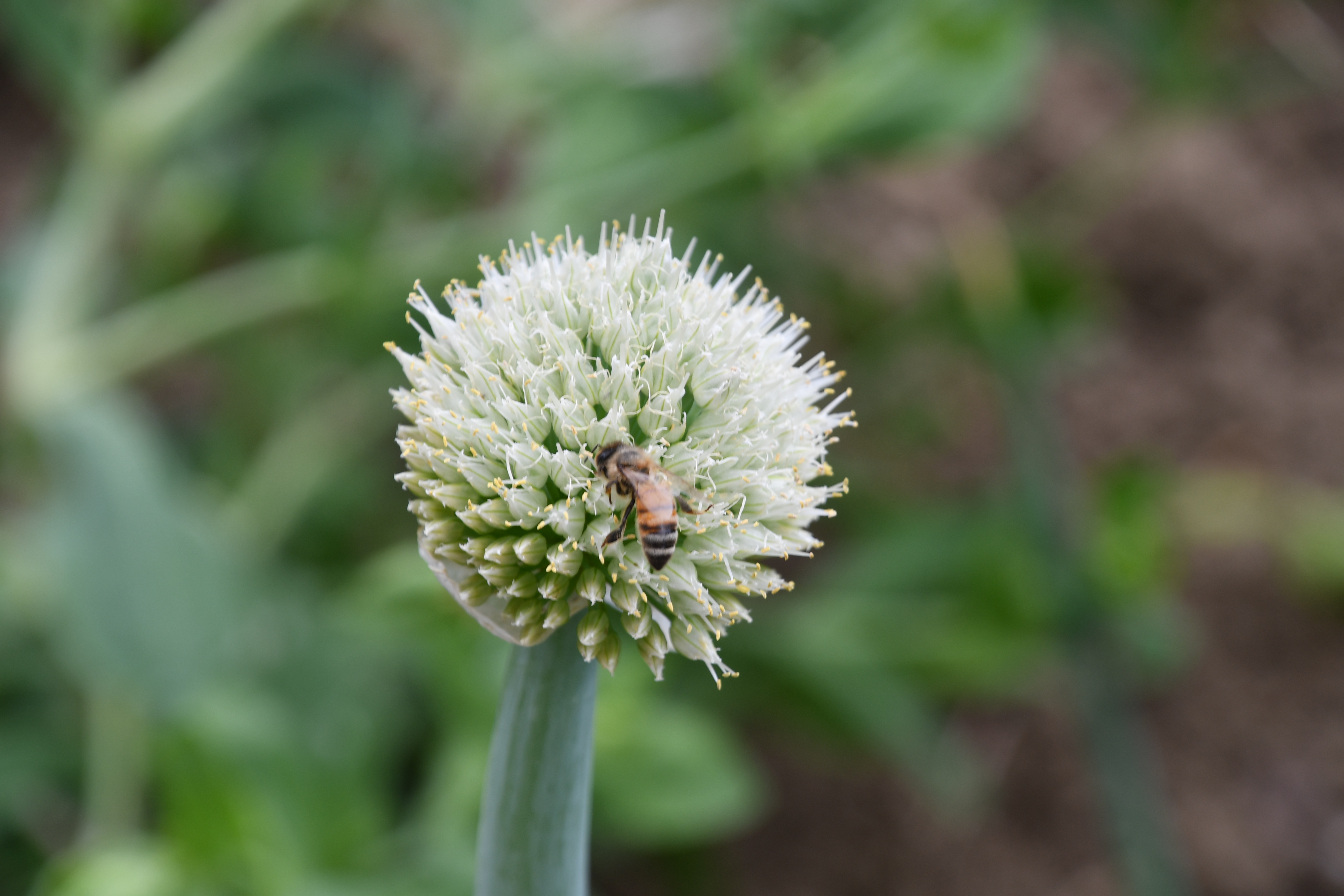 - 정말 하얀색의 파꽃이 피었다. 벌도 한마리 분위기를 살려준다.
