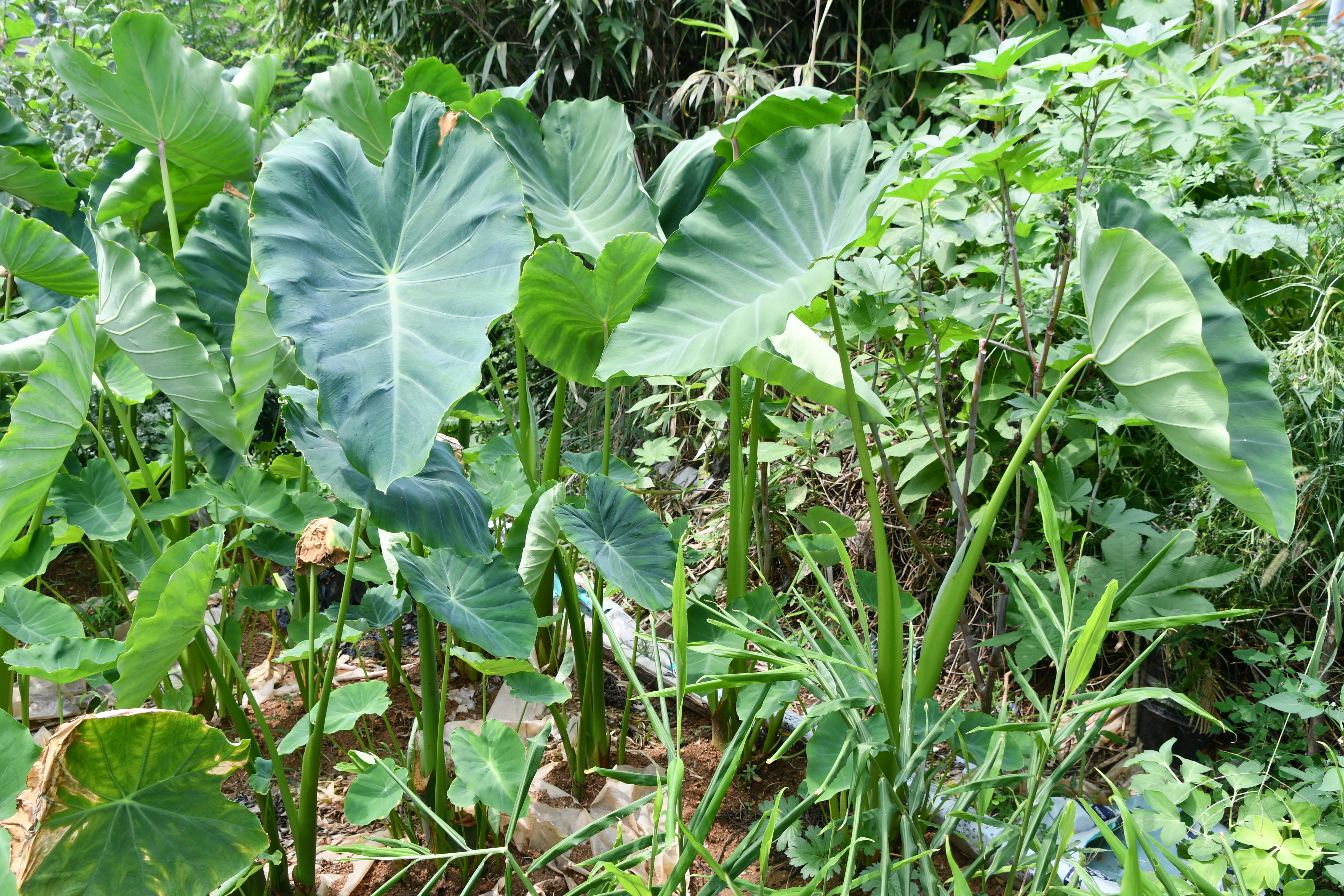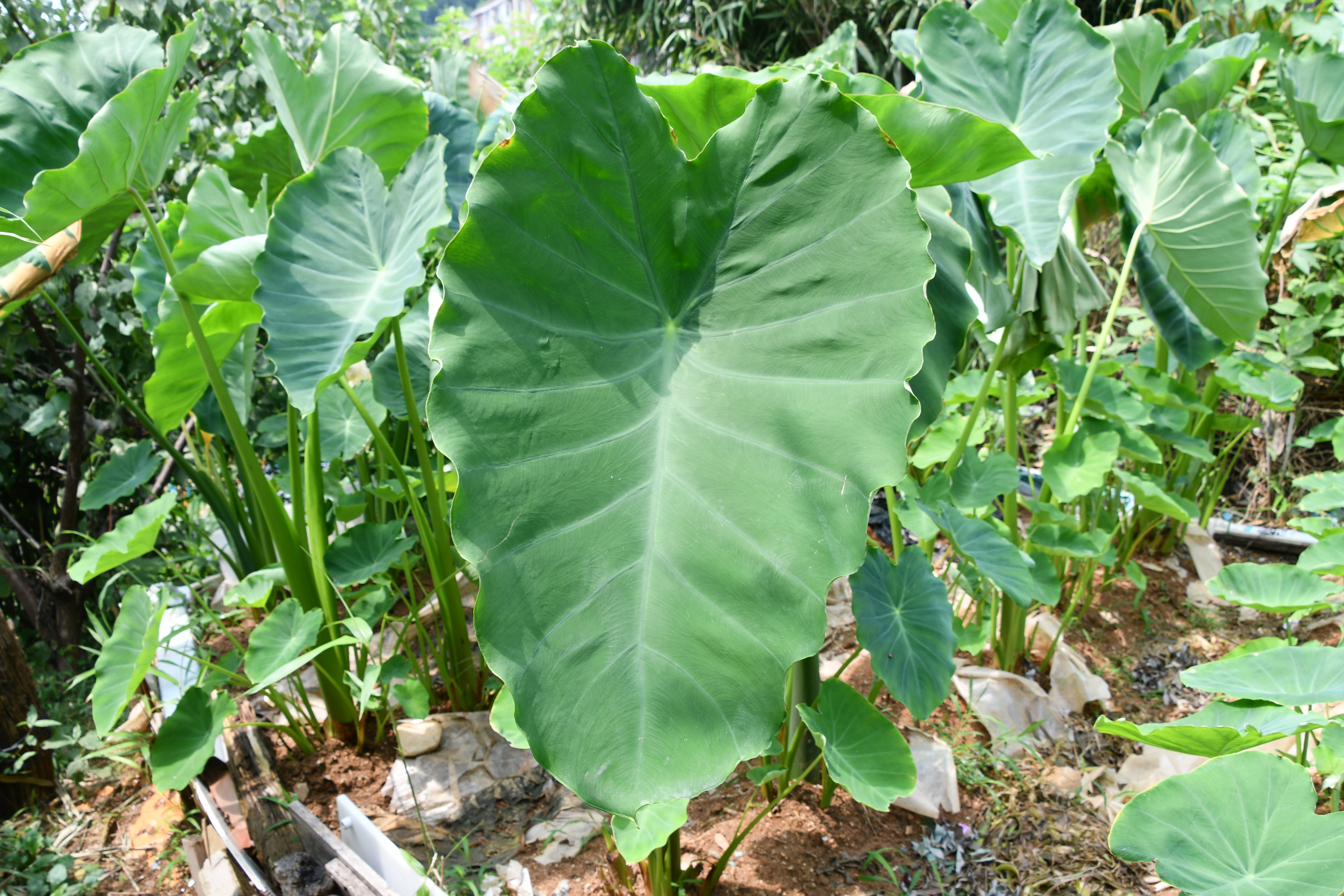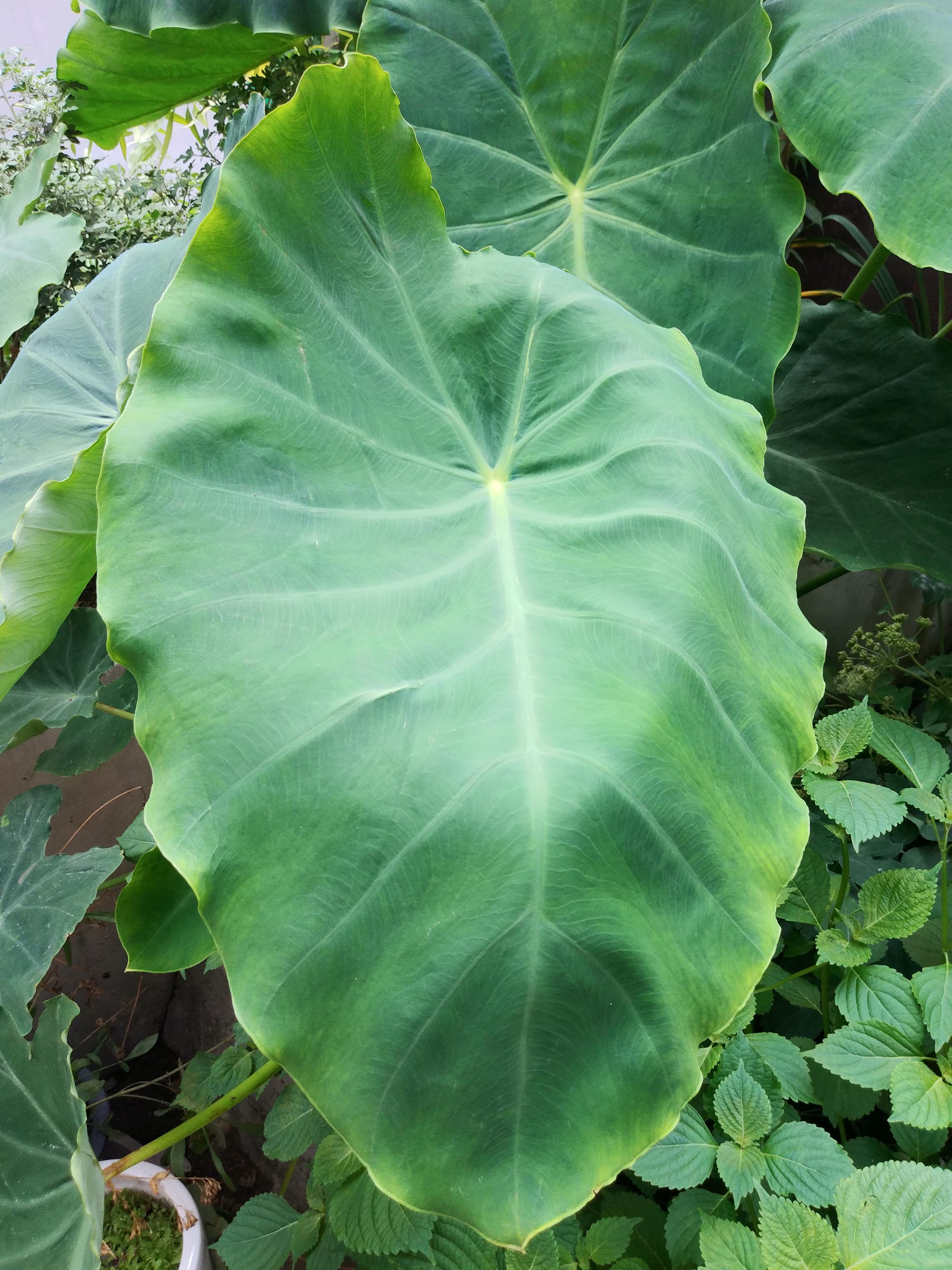 - 한국에서 꽃이 피지 않지만 그래도 토란의 큰 잎사귀는 매혹적이다.