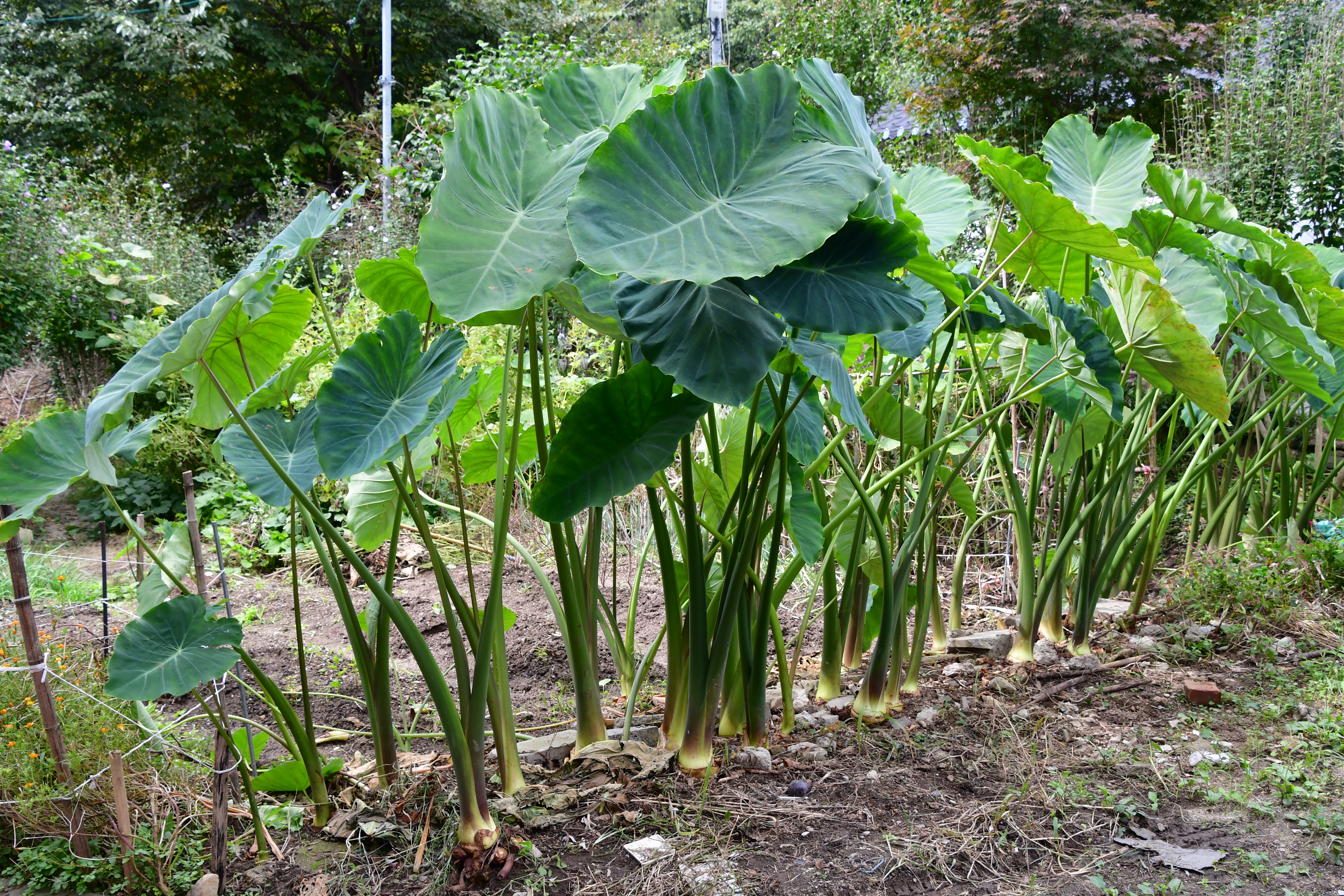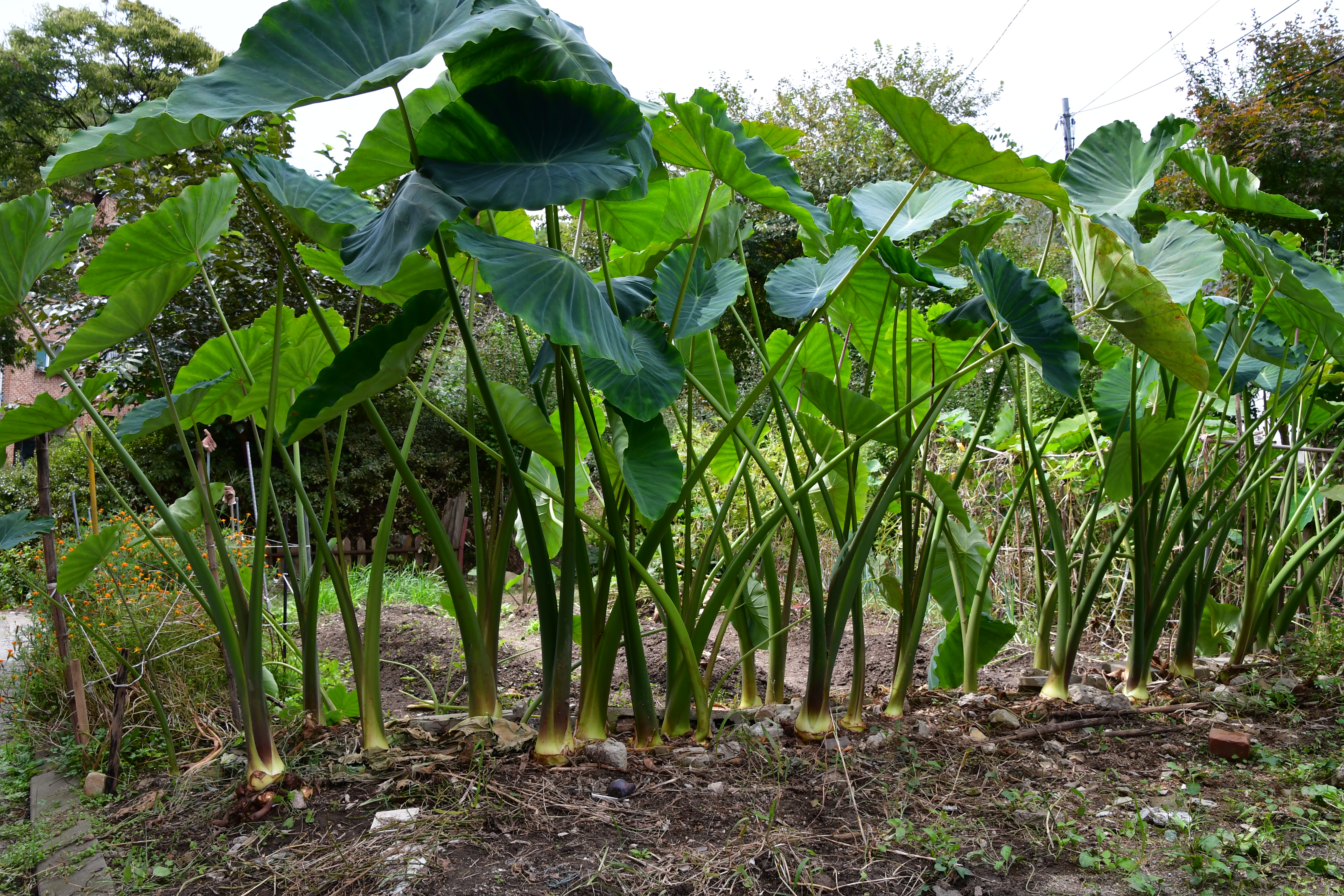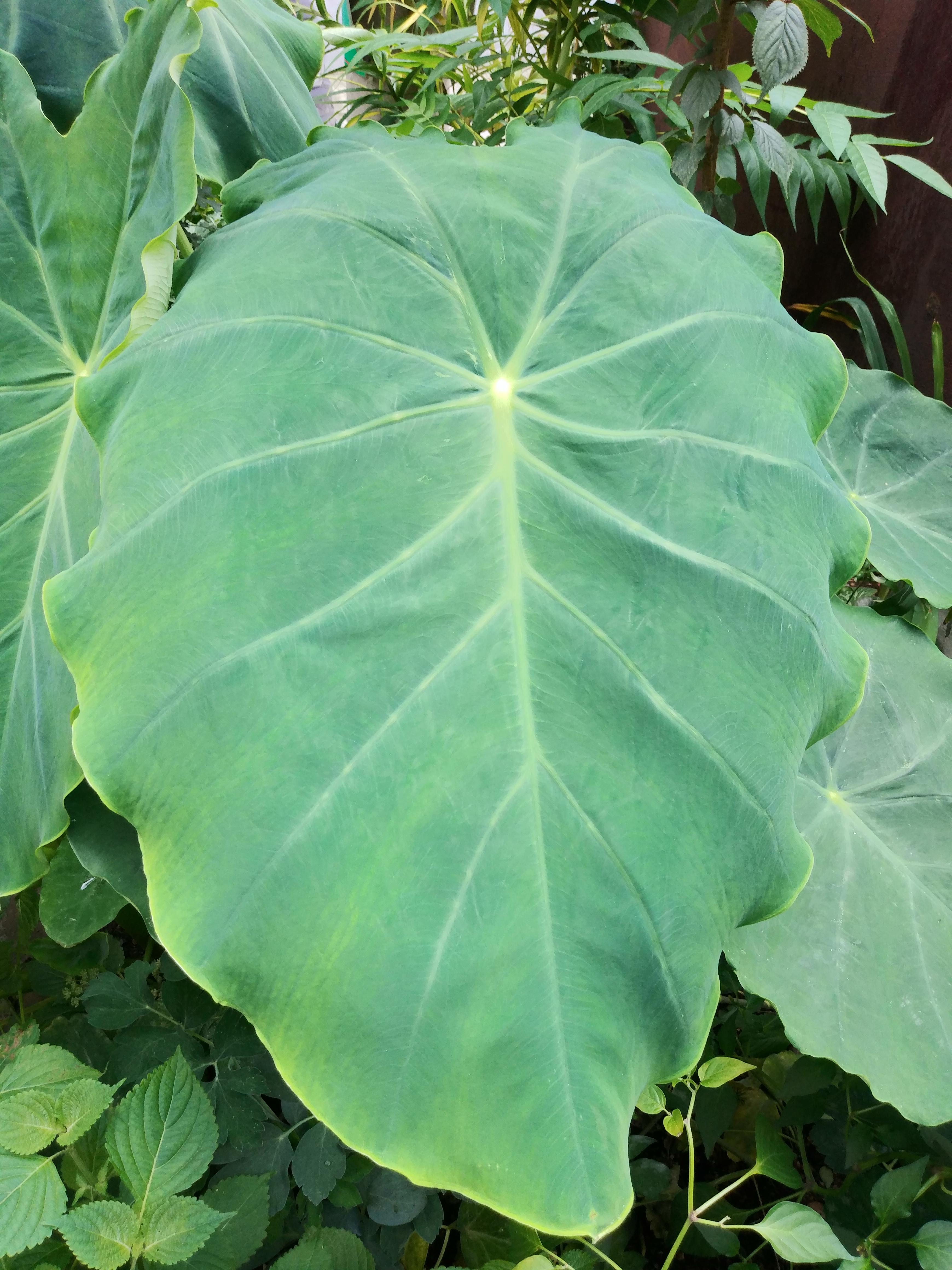 - 한국에서 꽃이 피지 않지만 그래도 토란의 큰 잎사귀는 매혹적이다.