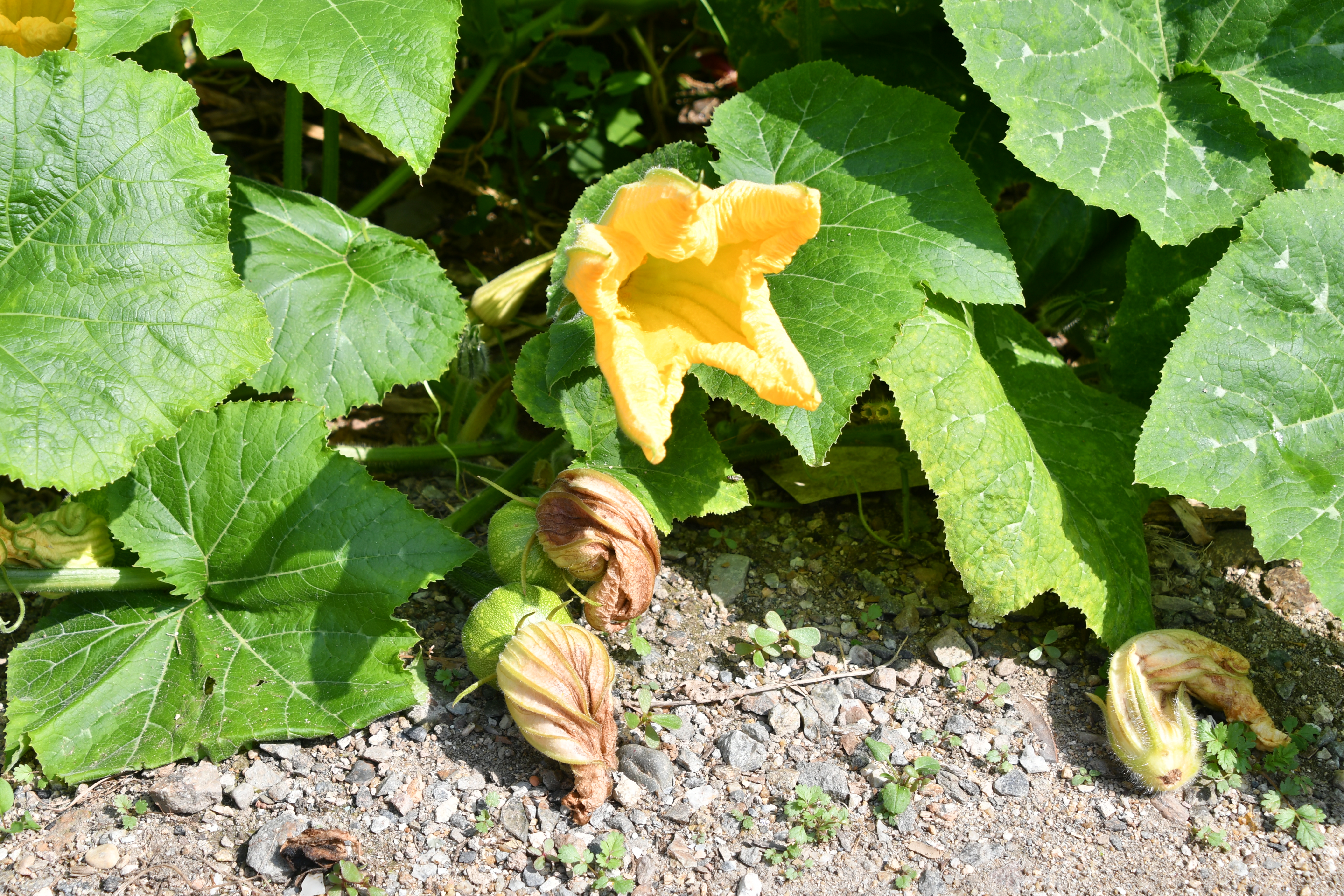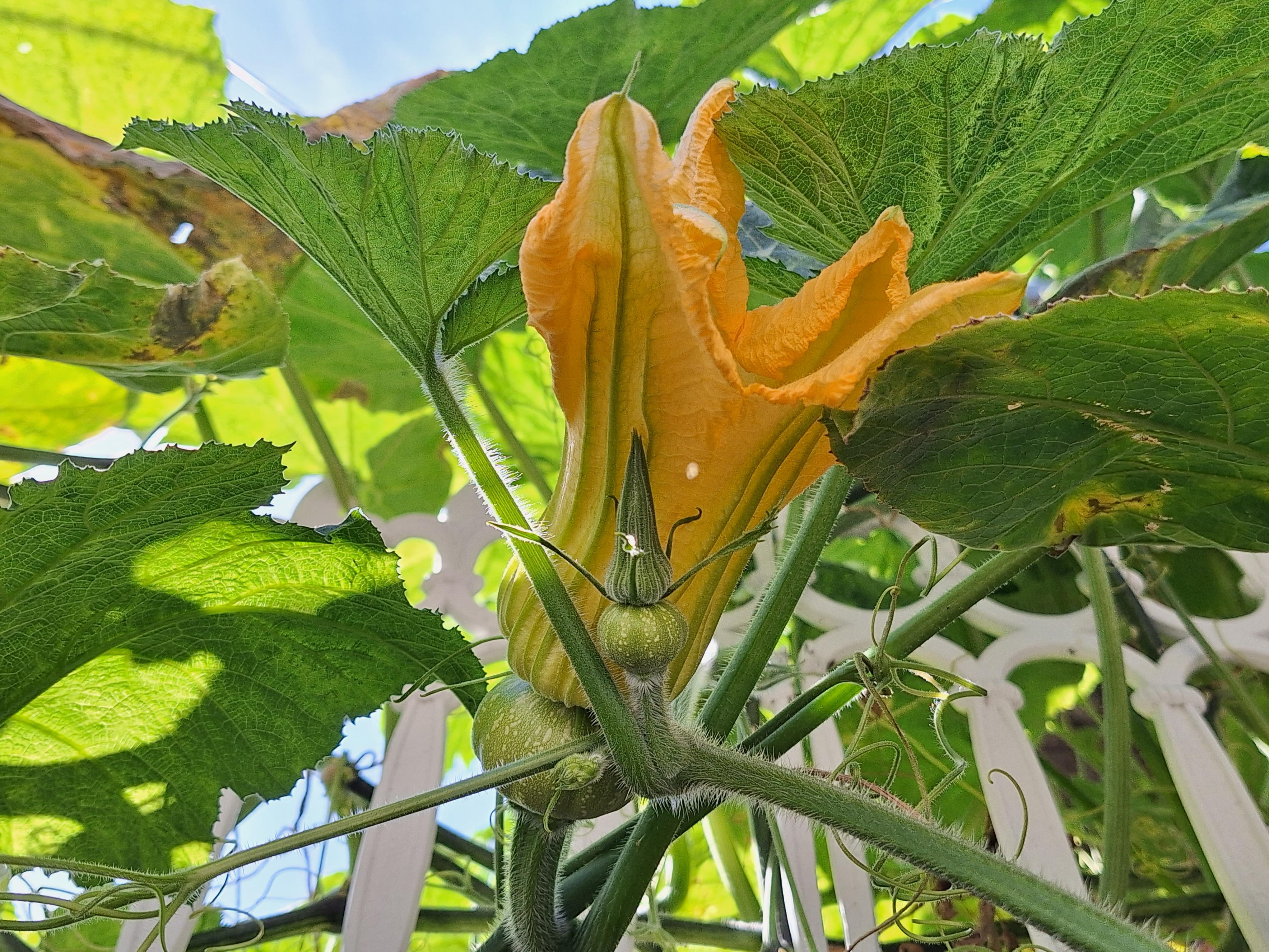 - 호박꽃 아래 애기 호박 동그리 2개가 자라고 있다.