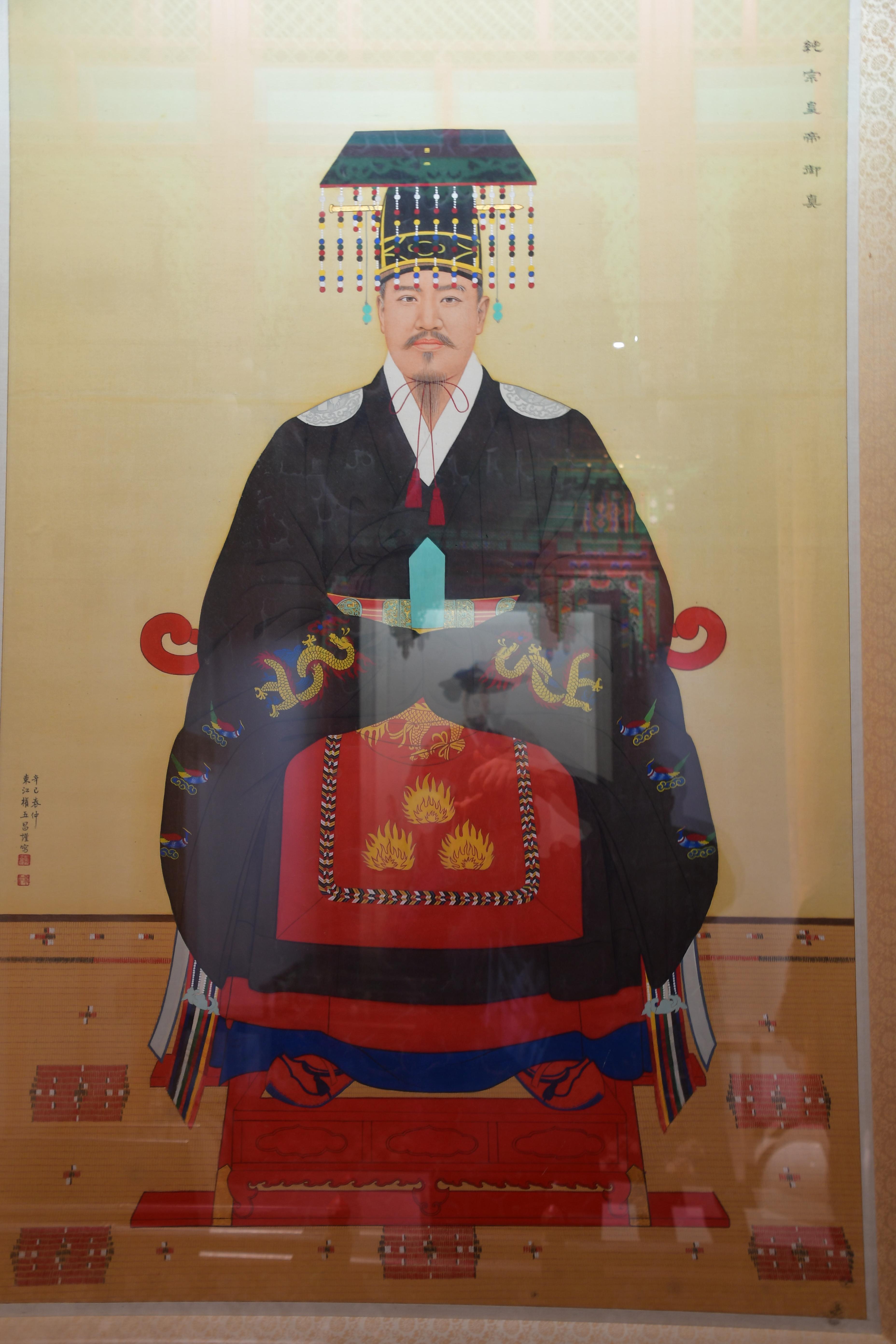 순종의 사진을 보고 그린 어진이다. 순종어진은 면류관을 쓰고 십이장복을 입은 대례복 차림이다. 의례를 행할 때 황제는 십이장복을 입었고, 왕은 구장복을 입었다. 십이장복이란 옷에 들어가는 문양의 수가 12가지라 는 뜻이다.