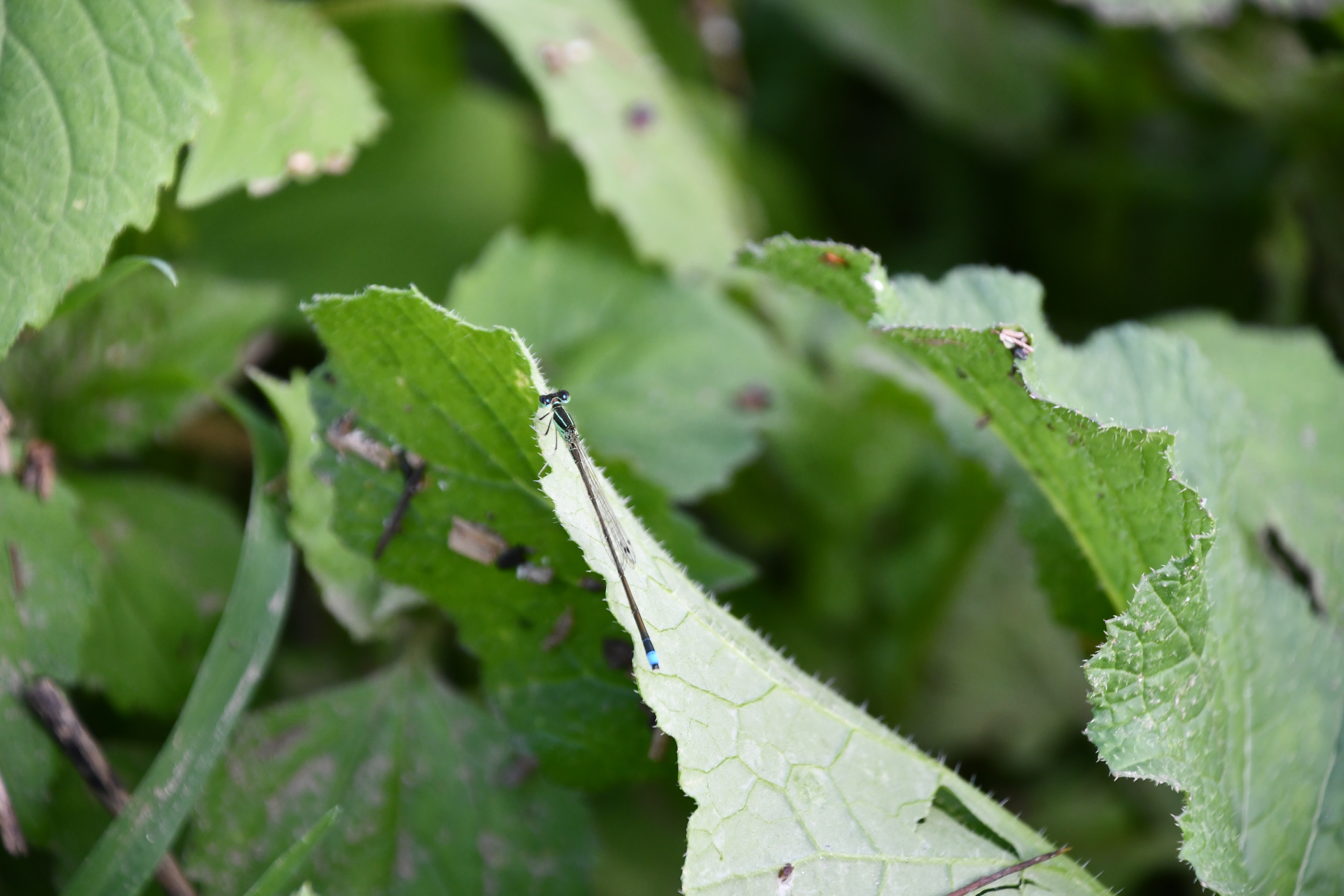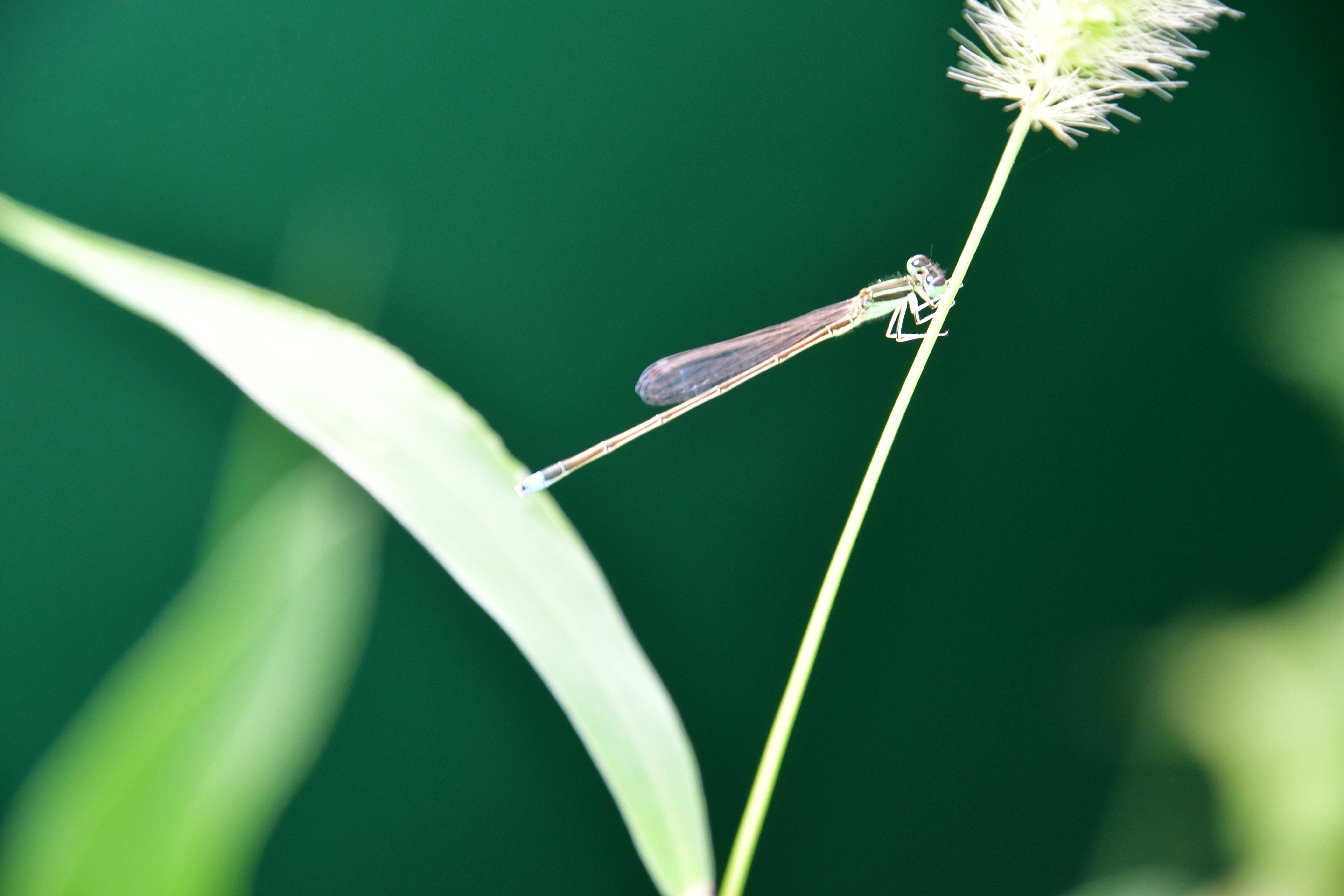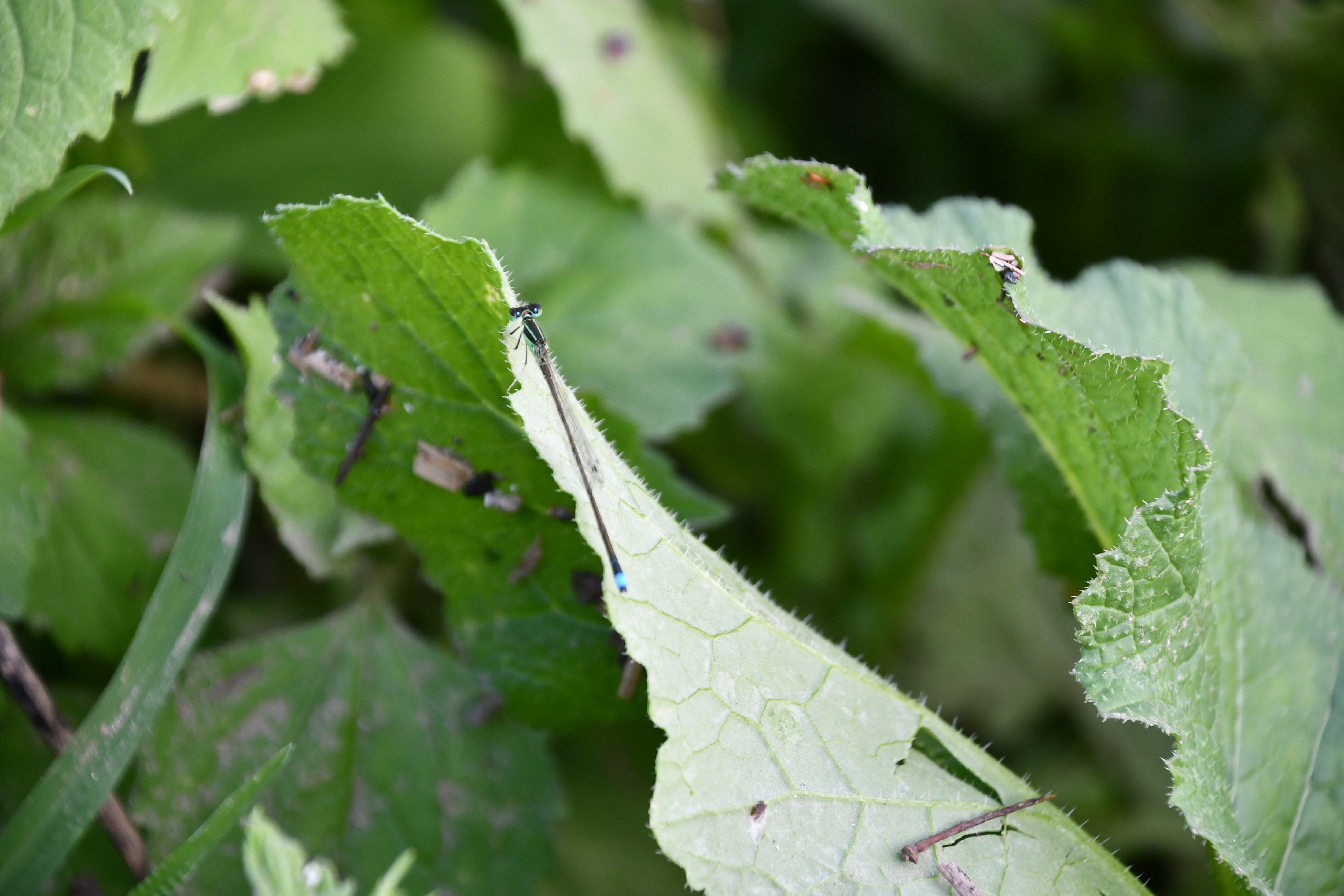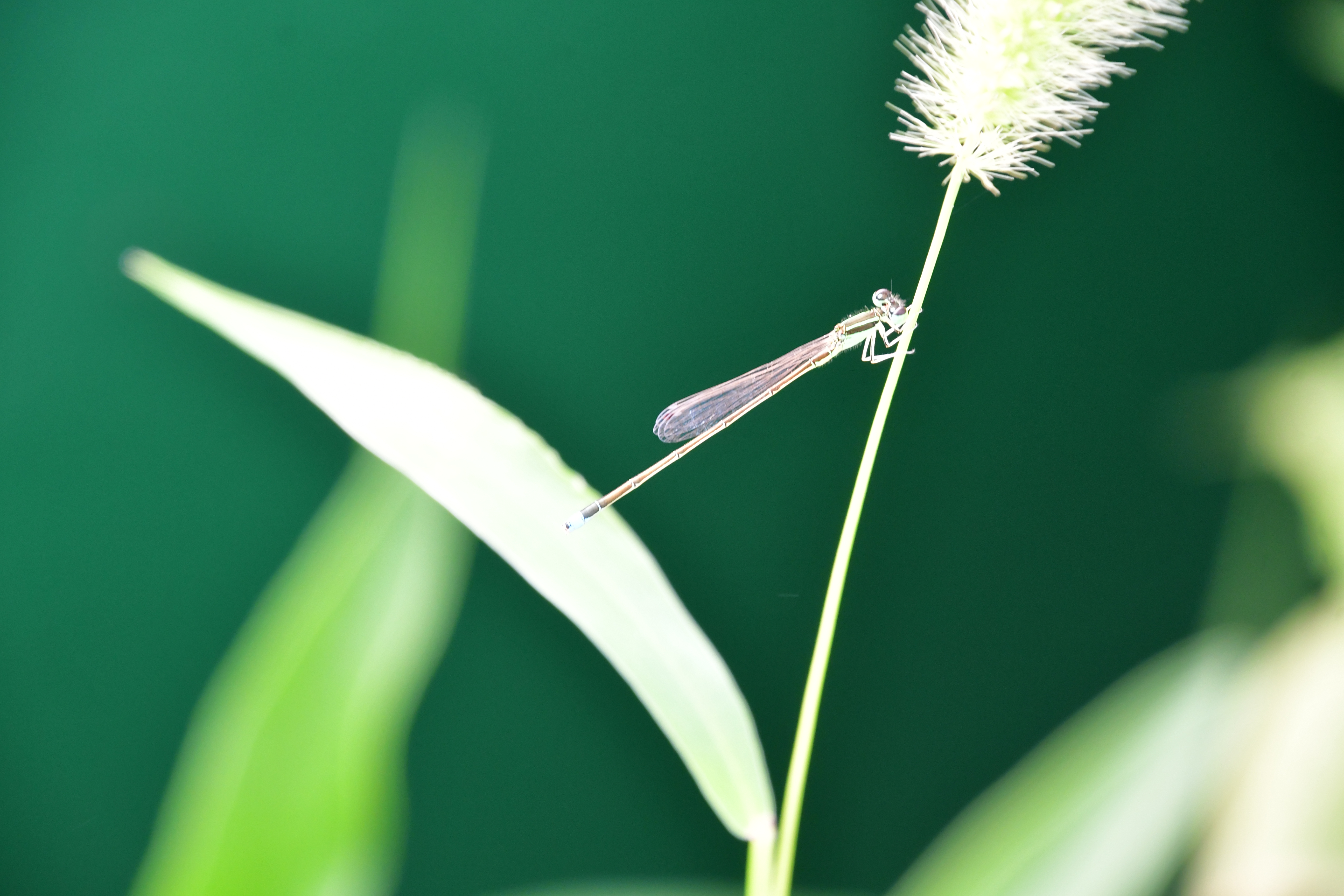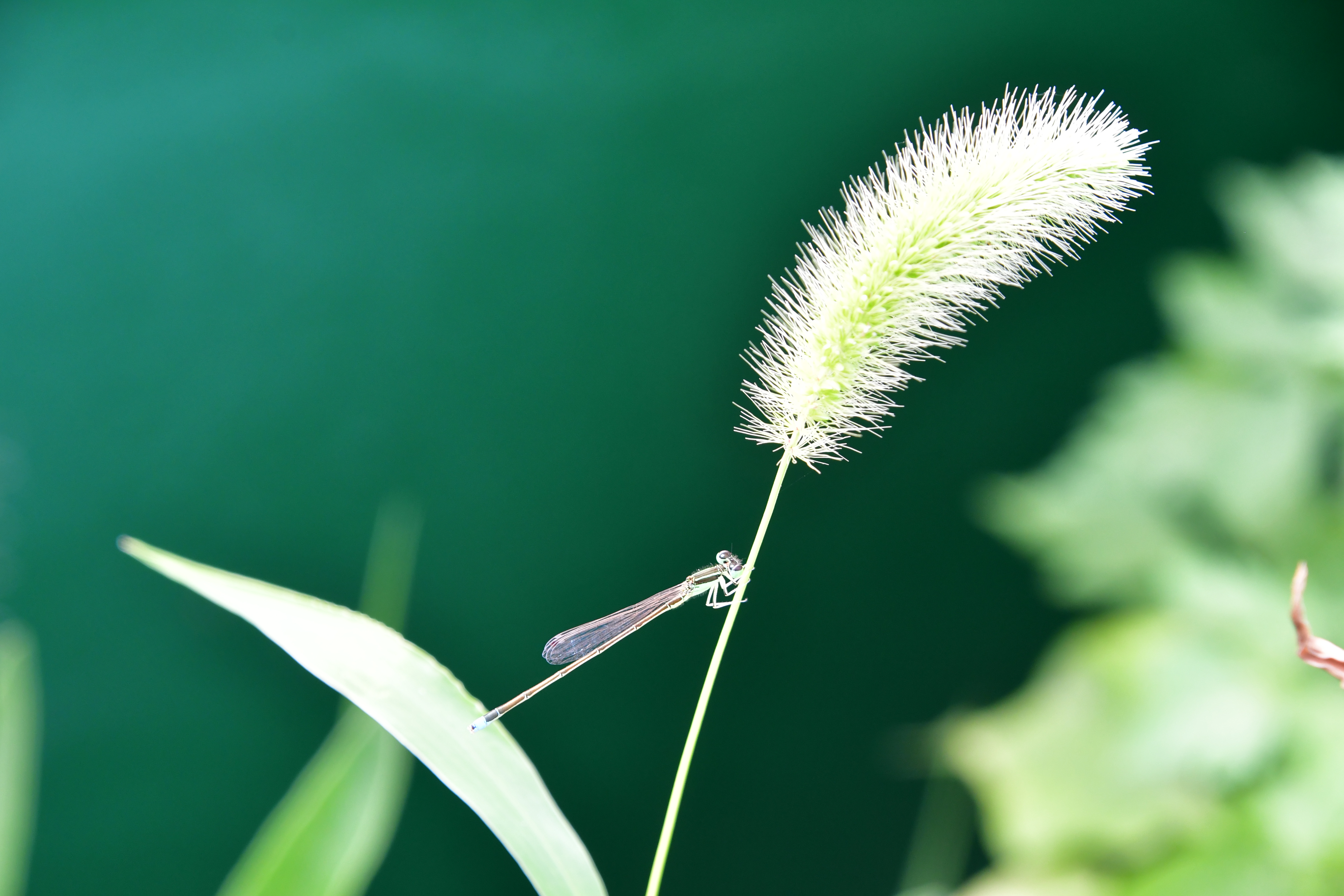 하늘색 꼬리 실잠자리가 꽃잎에 살포시 앉아 있다.