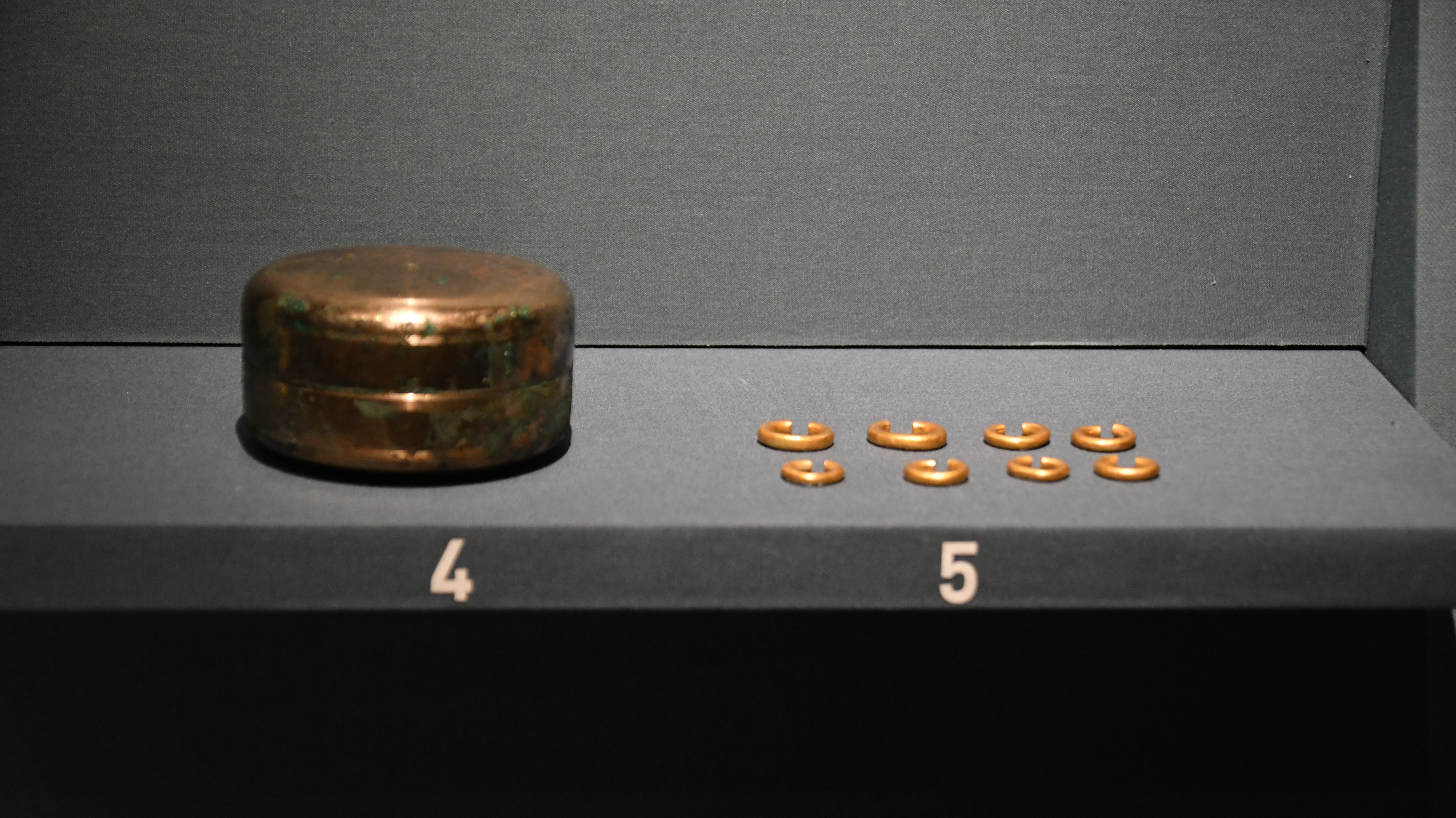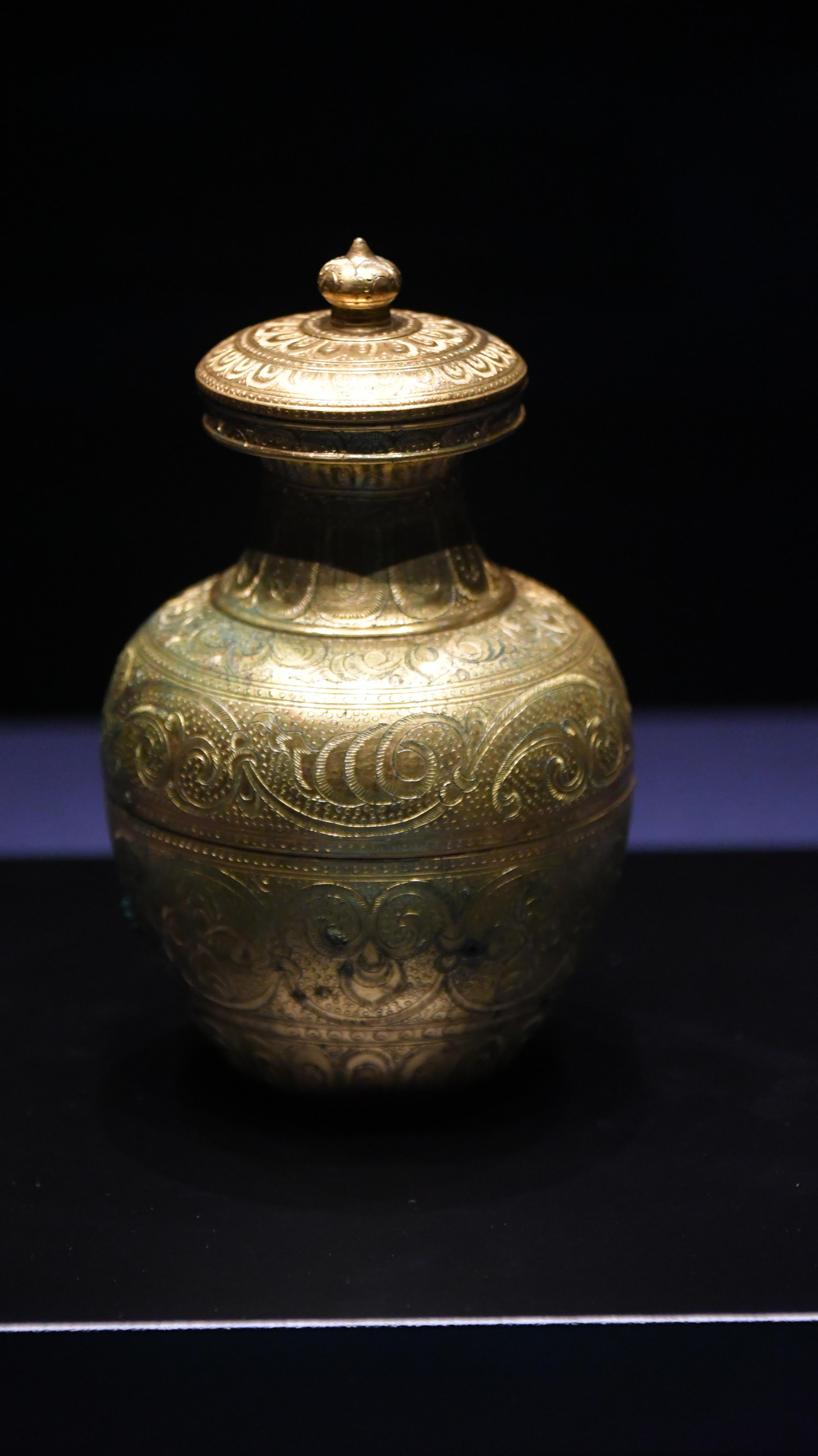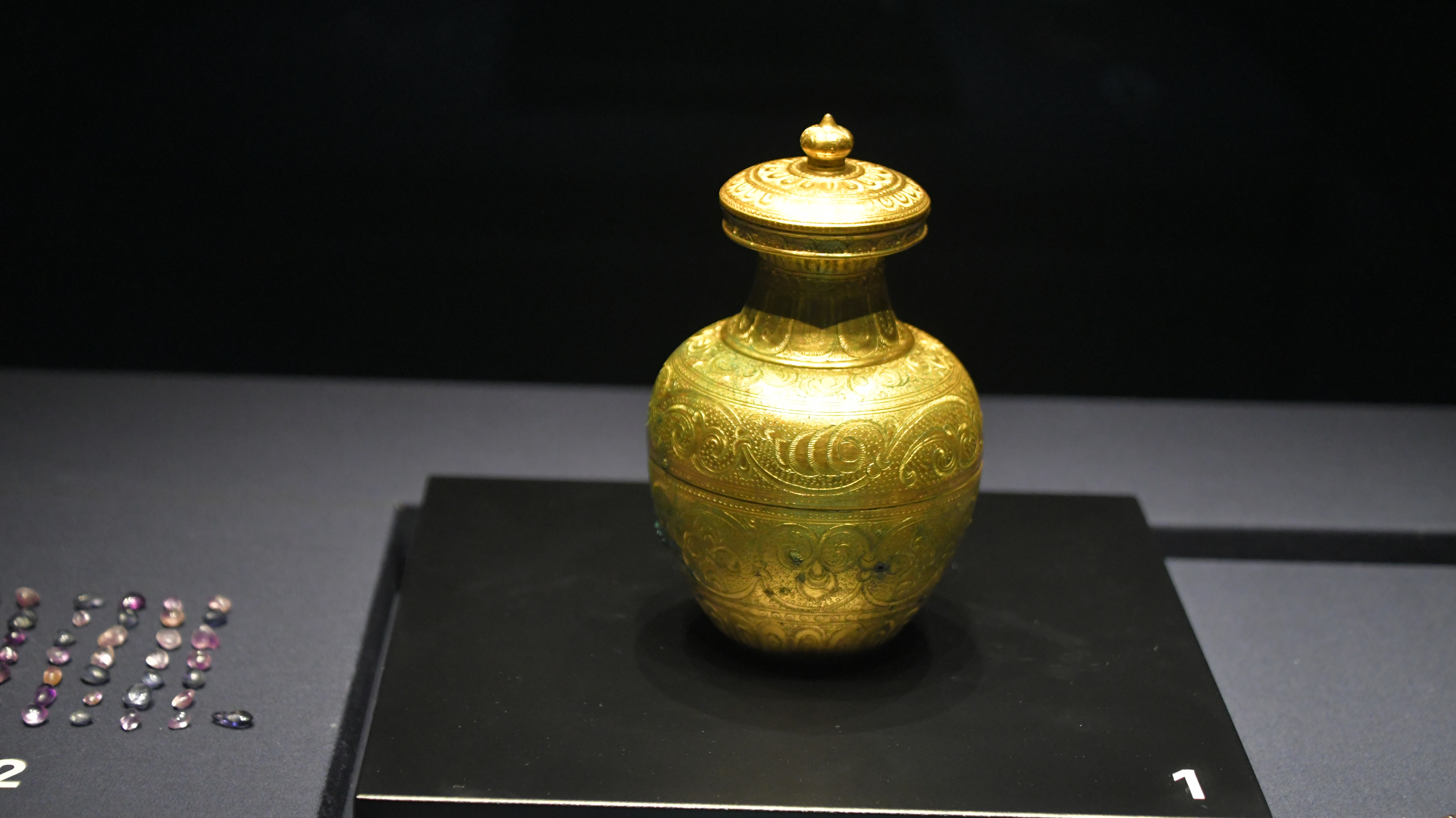 # 금제 내호 안에는 유리 구슬과 금구슬 등과 함께 유리 사리병이 담겨 있었다.