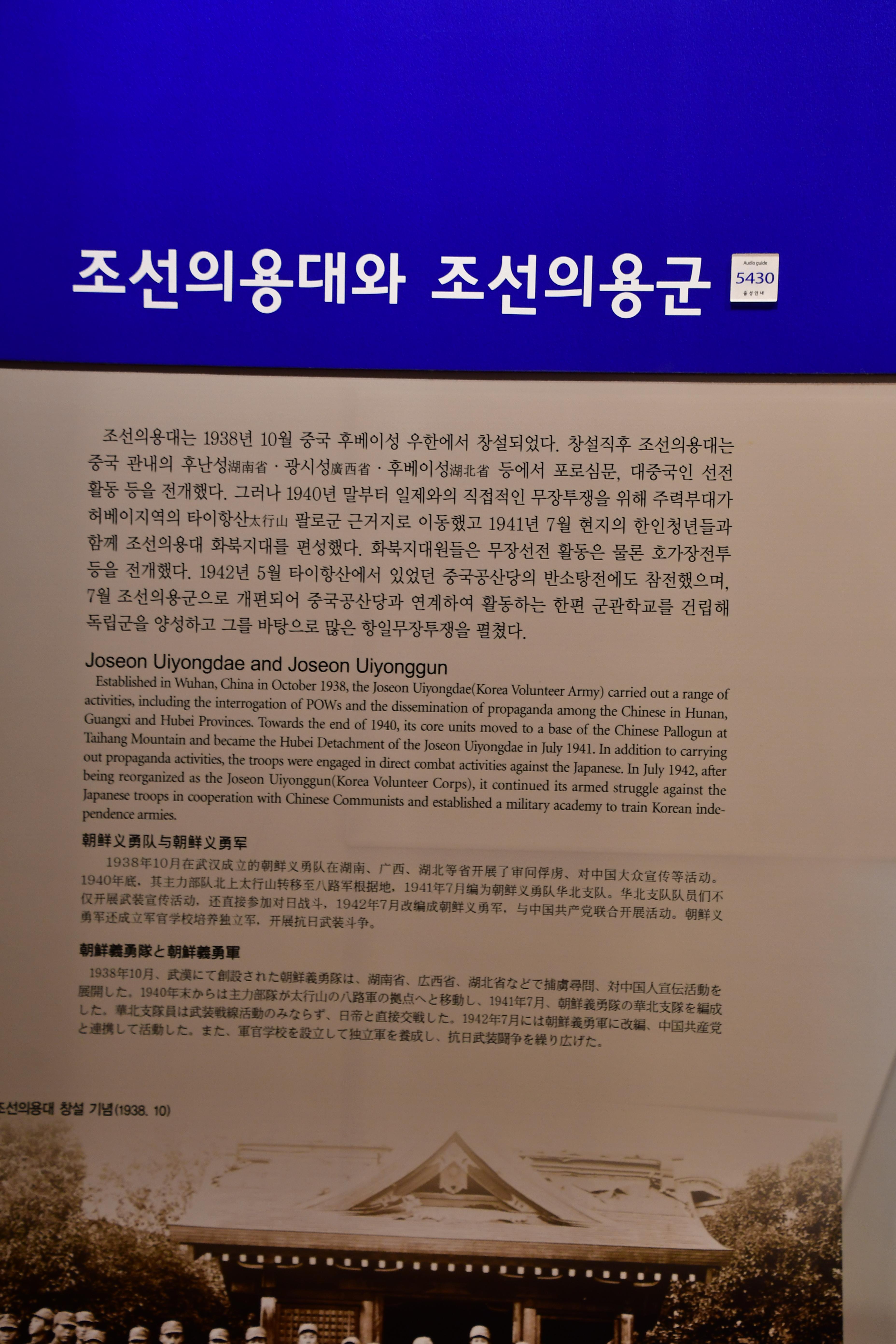 조선의용대는 1938년 10월 중국 후베이성 우한에서 창설되었다. 창설직후 조선의용대는 중국 관내의 후난성·후베이성 등에서 포로심문, 대중국인 선전 활동 등을 전개했다. 그러나 1940년 말부터 일제와의 직접적인 무장투쟁을 위해 주력부대가 허베이지역의 타이항산太行山 팔로군 근거지로 이동했고, 1941년 7월 현지의 한인청년들과 함께 조선의용대 화북지대를 편성했다. 화북지대원들은 무장선전 활동은 물론 호가장관광 등을 전개했다. 1942년 5월 타이항산에서 중국공산당의 반소탕전에도 참전했으며, 7월 조선의용군으로 개편되어 중국공산당과 연계하여 활동하는 한편 군관학교를 건립해 독립군을 양성하고 그를 바탕으로 많은 항일무장투쟁을 펼쳤다.