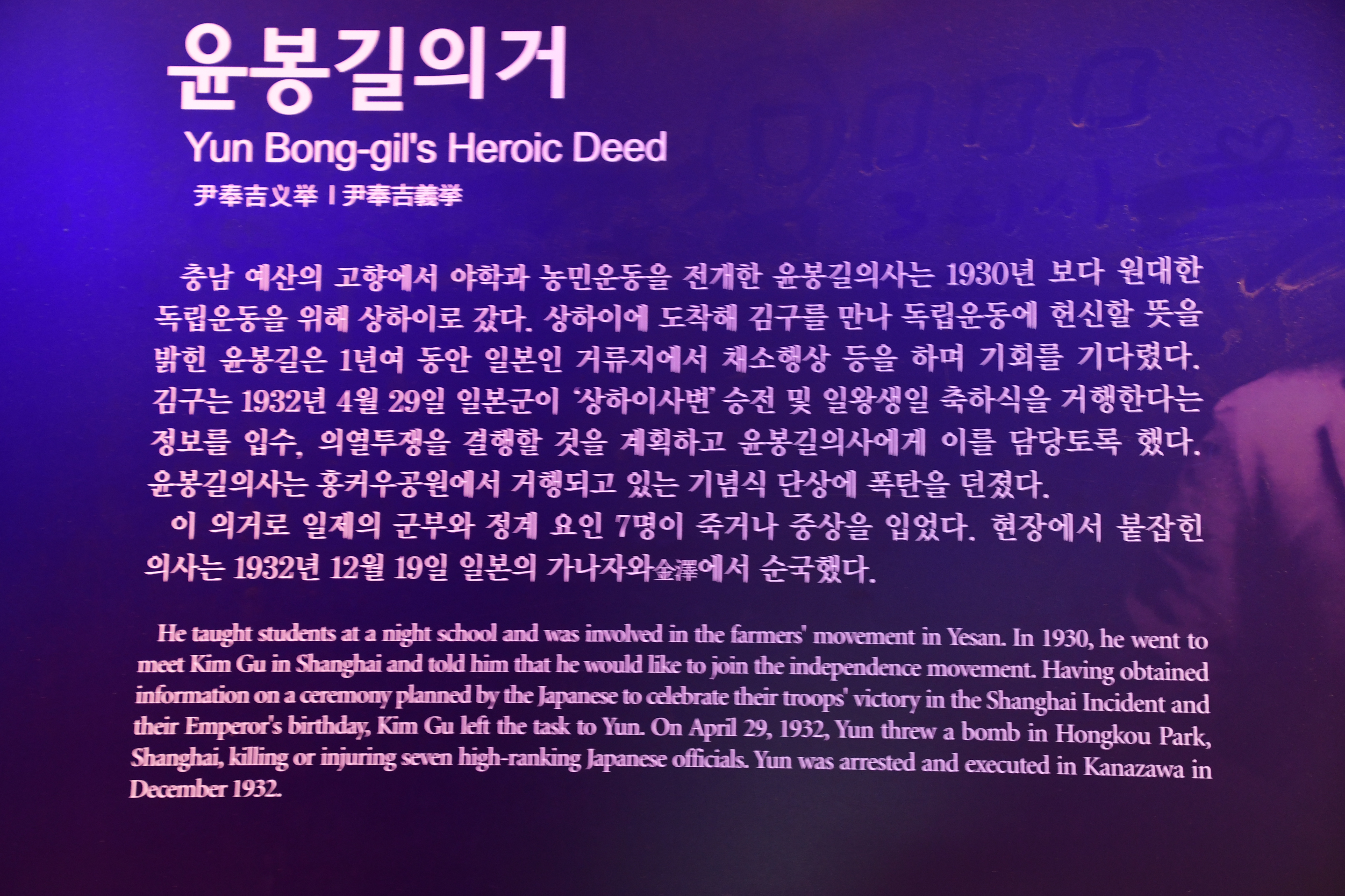 - 충남 예산의 고향에서 야학과 농민운동을 전개한 윤봉길의사는 1930년 보다 원대한 독립운동을 위해 상하이로 갔다. 상하이에 도착해 김구를 만나 독립운동에 헌신할 뜻을 밝힌 윤봉길은 1년여 동안 일본인 거류지에서 채소행상 등을 하며 기회를 기다렸다.