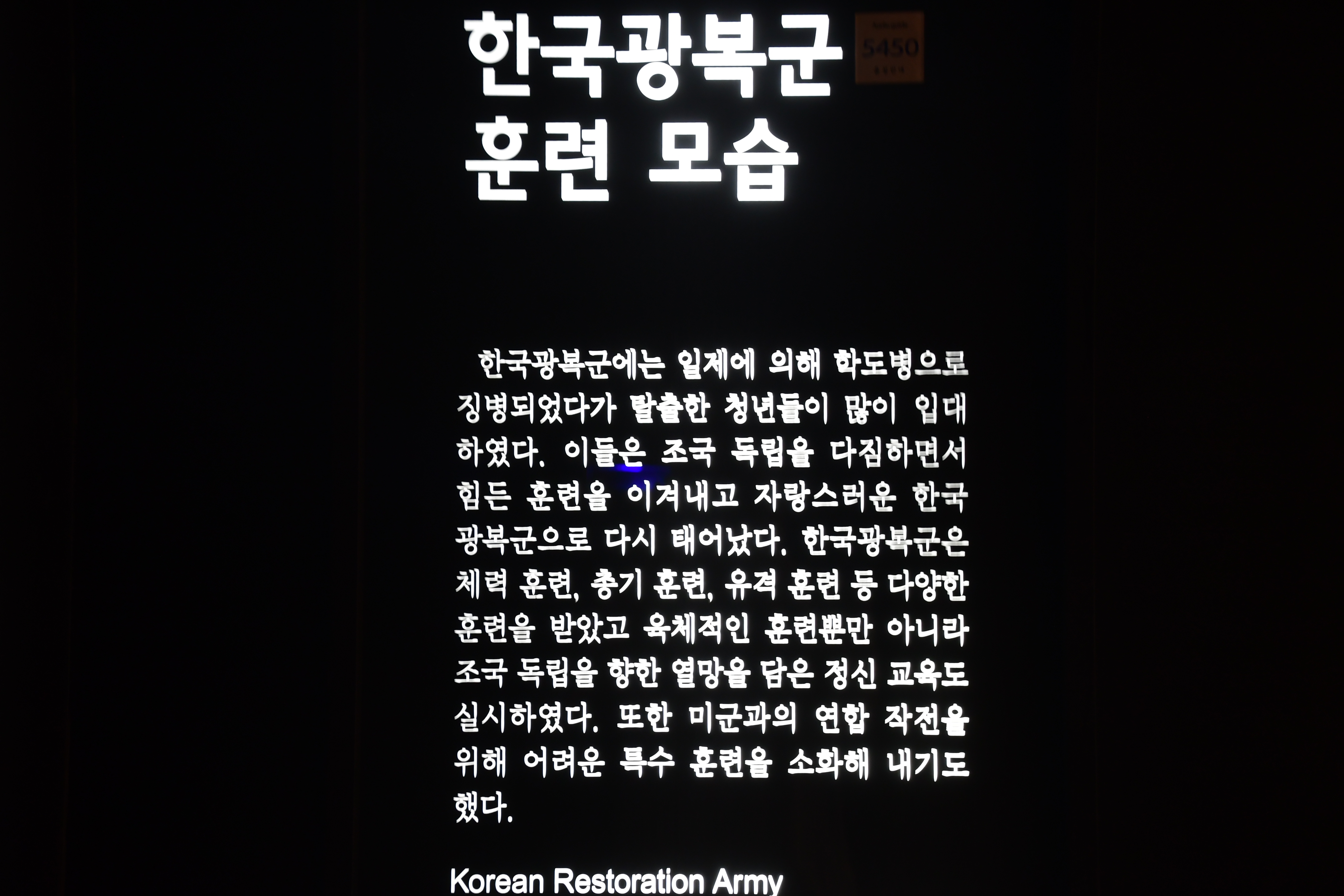 한국광복군에는 일제에 의해 학도병으로 징병되었다가 탈출한 청년들이 많이 입대하였다. 이들은 조국 독립을 다짐하면서 힘든 훈련을 이겨내고 자랑스러운 한국광복군으로 다시 태어났다. 한국광복군은 체력 훈련, 총기 훈련, 유격 훈련 등 다양한 훈련을 받았고, 육체적인 훈련뿐만 아니라 조국 독립을 향한 열망을 담은 정신교육도 실시하였다. 또한 미군과의 연합 작전을 위해 어려운 특수훈련을 소화해 내기도 했다.