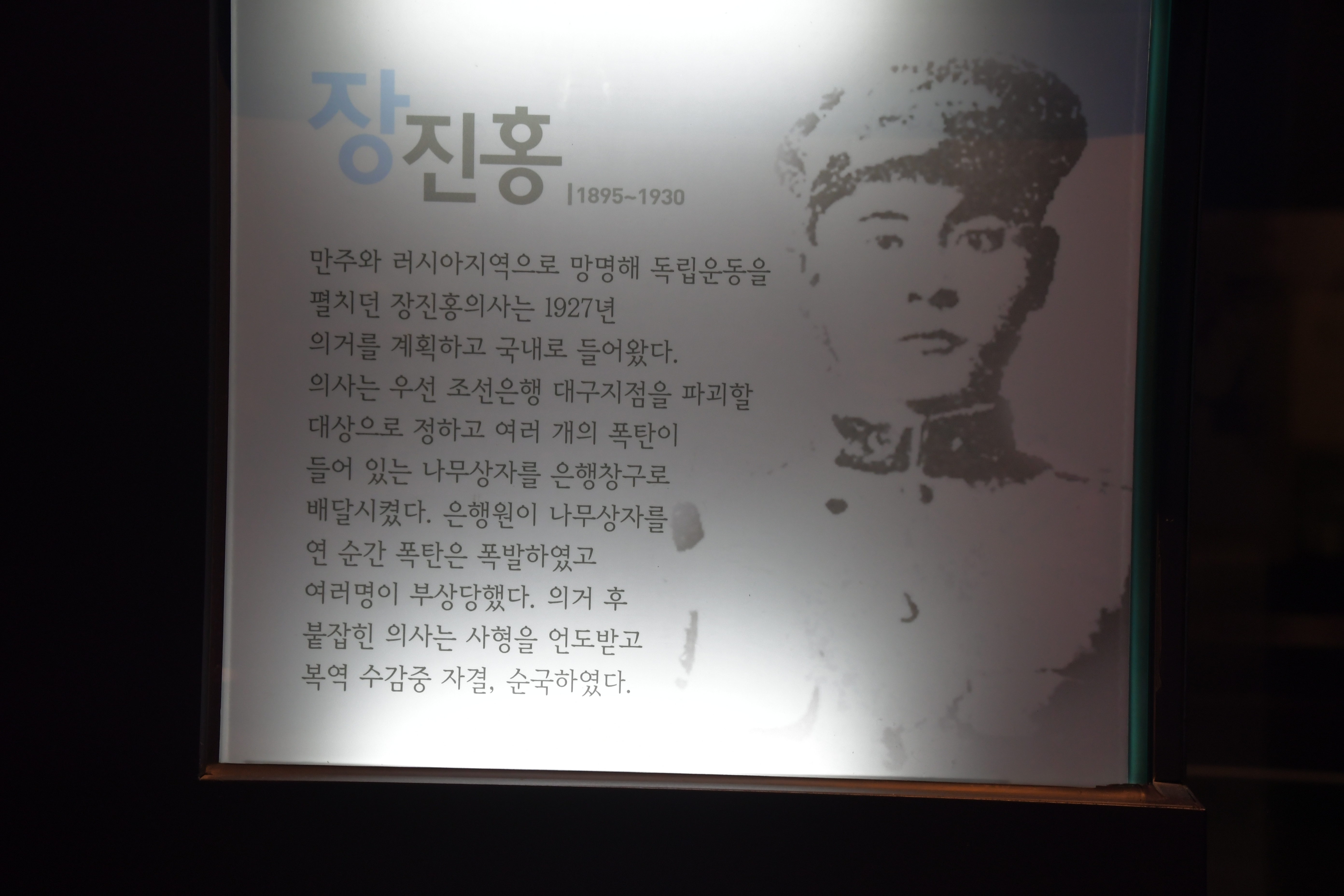 - 만주와 러시아지역으로 망명해 독립운동을 펼치던 1927년의 의거를 계획하고 국내로 들어왔다. 의사는 우선 조선은행 대구지점을 파괴할 대상으로 정하고 여러 개의 폭탄이 들어 있는 나무상자를 은행창구로 배달했다. 은행원이 나무상자를 연 순간 폭탄은 폭발하여 여러명이 부상했다. 의거 후 붙잡힌 의사는 사형을 언도받고 복역 수감 중 자결, 순국했다
