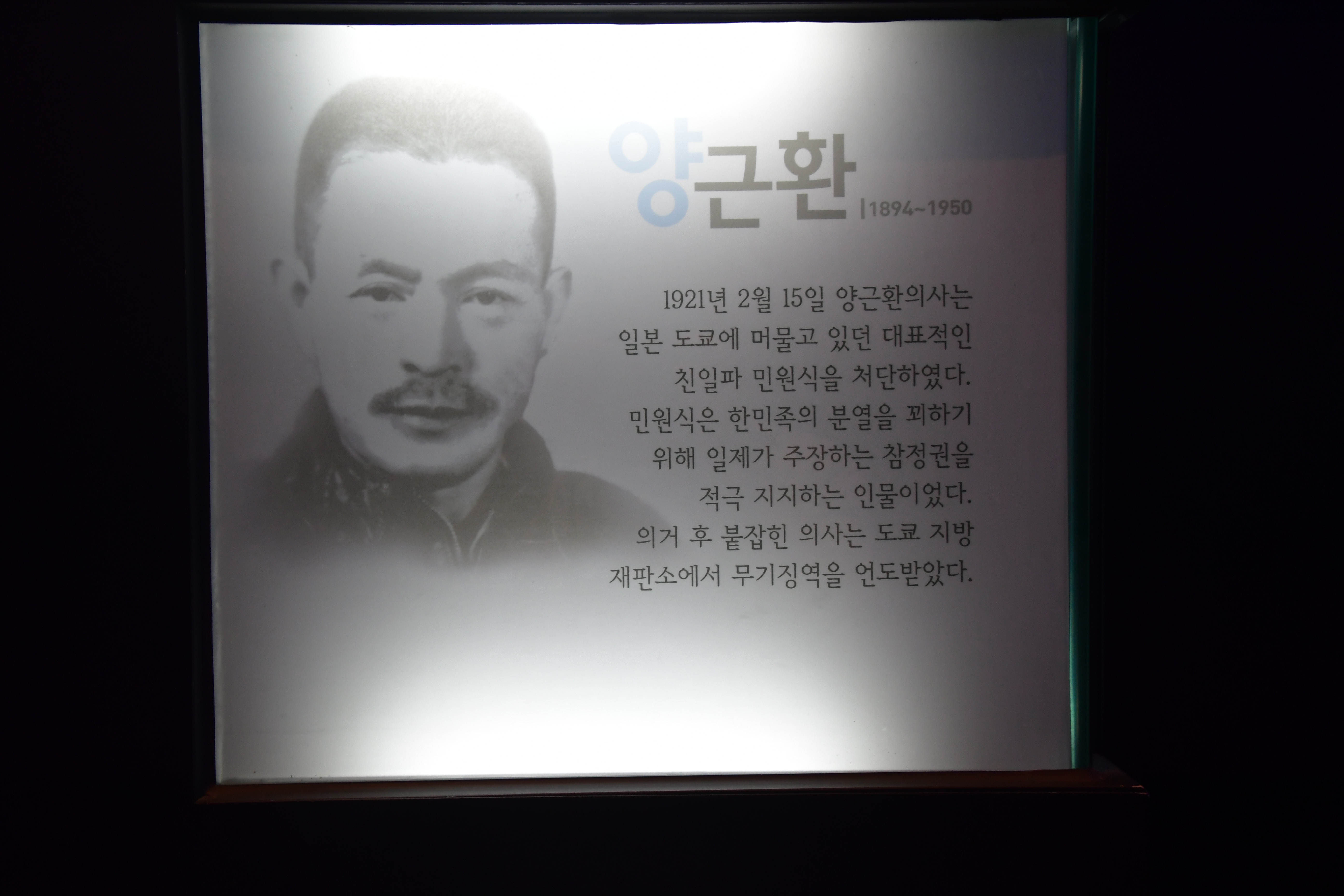 - 1921년 2월 15일 양근환의사는 일본 도쿄에 머물고 있던 대표적인 친일파 민원식을 처단하였다. 민원식은 한민족의 분열을 꾀하기 위해 일제가 주장하는 참정권을 적극 지지하는 인물이었다. 의거 후 붙잡힌 의사는 도쿄 지방 재판소에서 무기징역을 언도받았다.