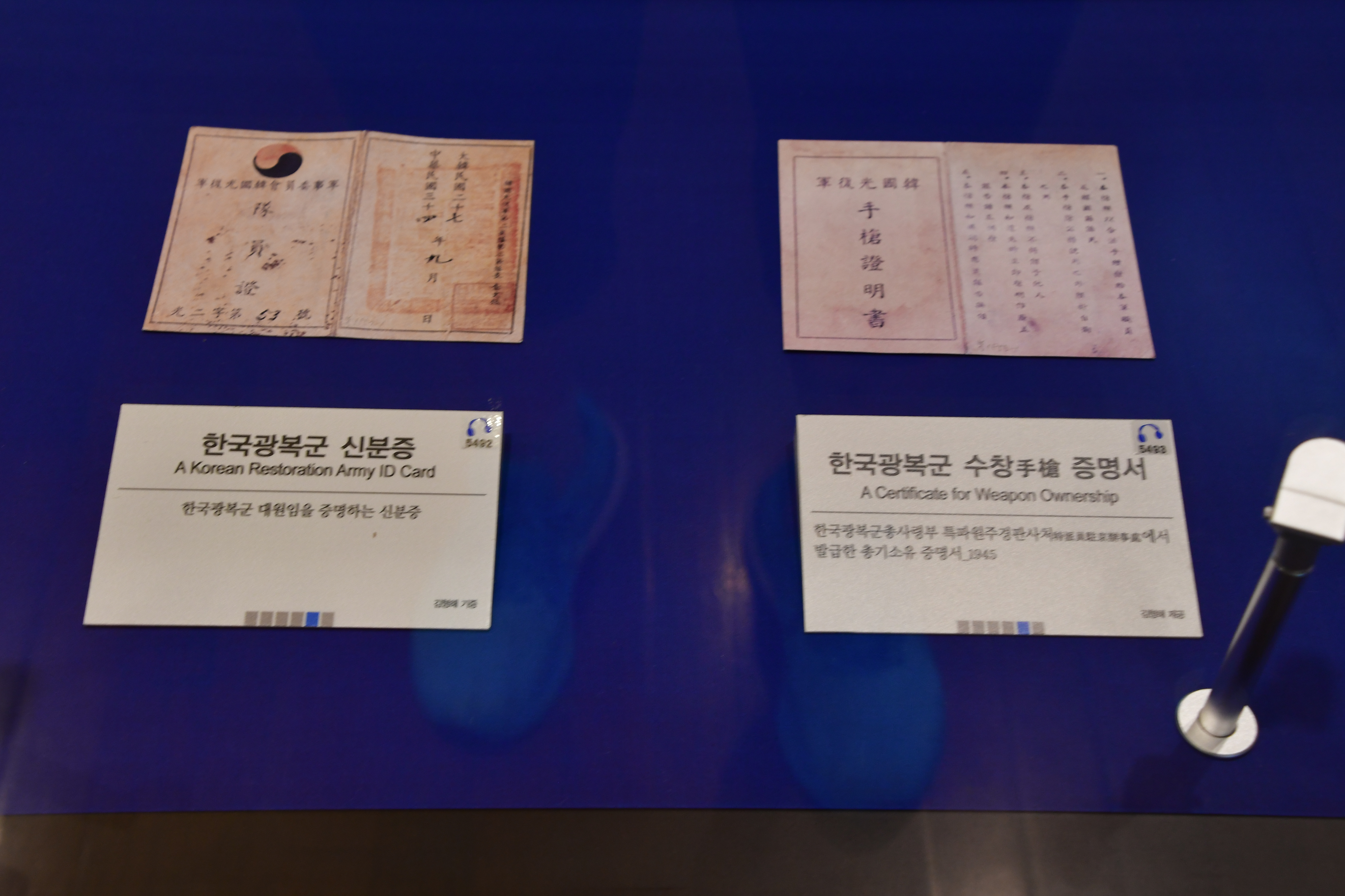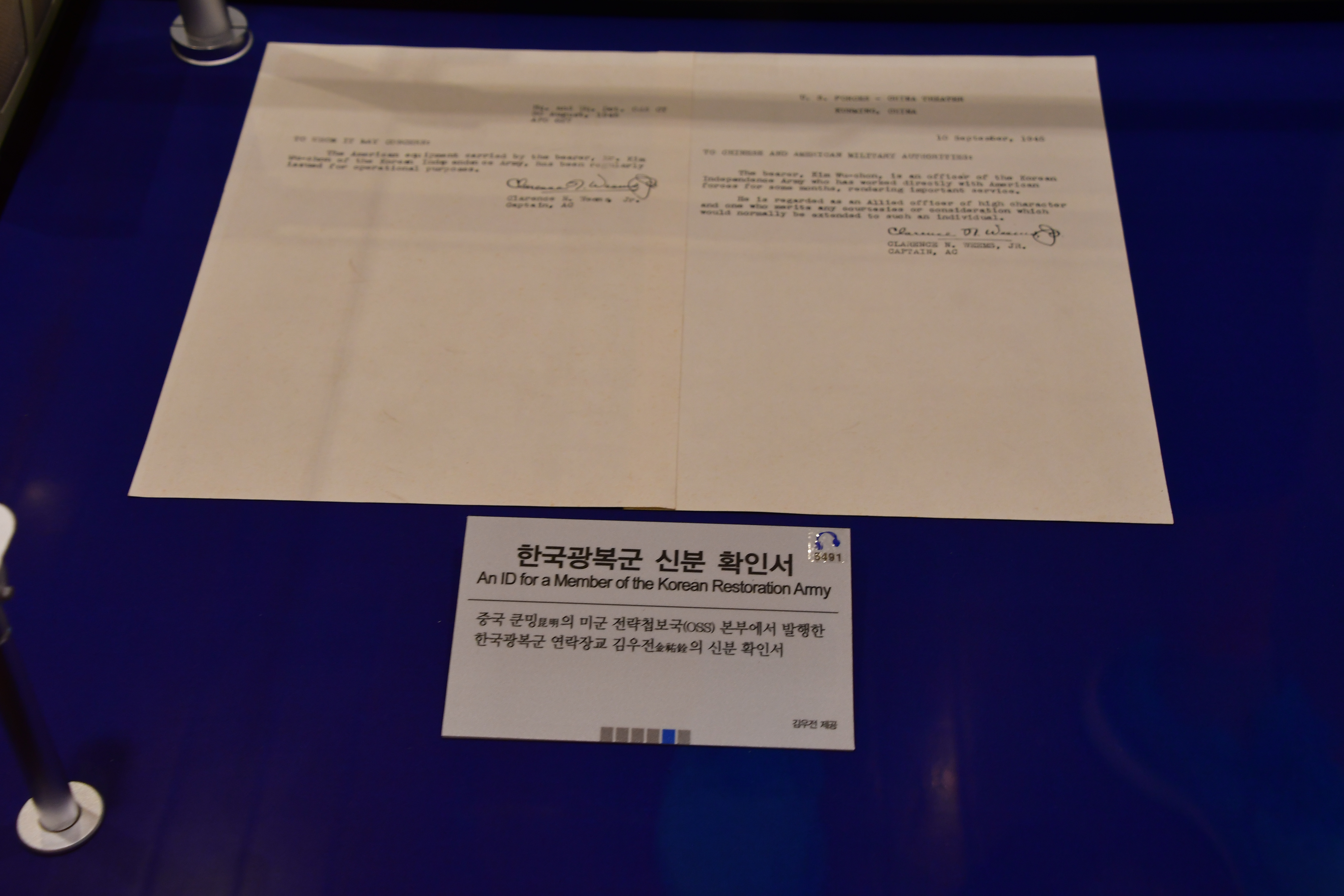 - 중국 쿤민의 미군 전략첩보국 본부에서 발행한 한국광복군 연락장교 김우전金祐銓 신분 확인서.