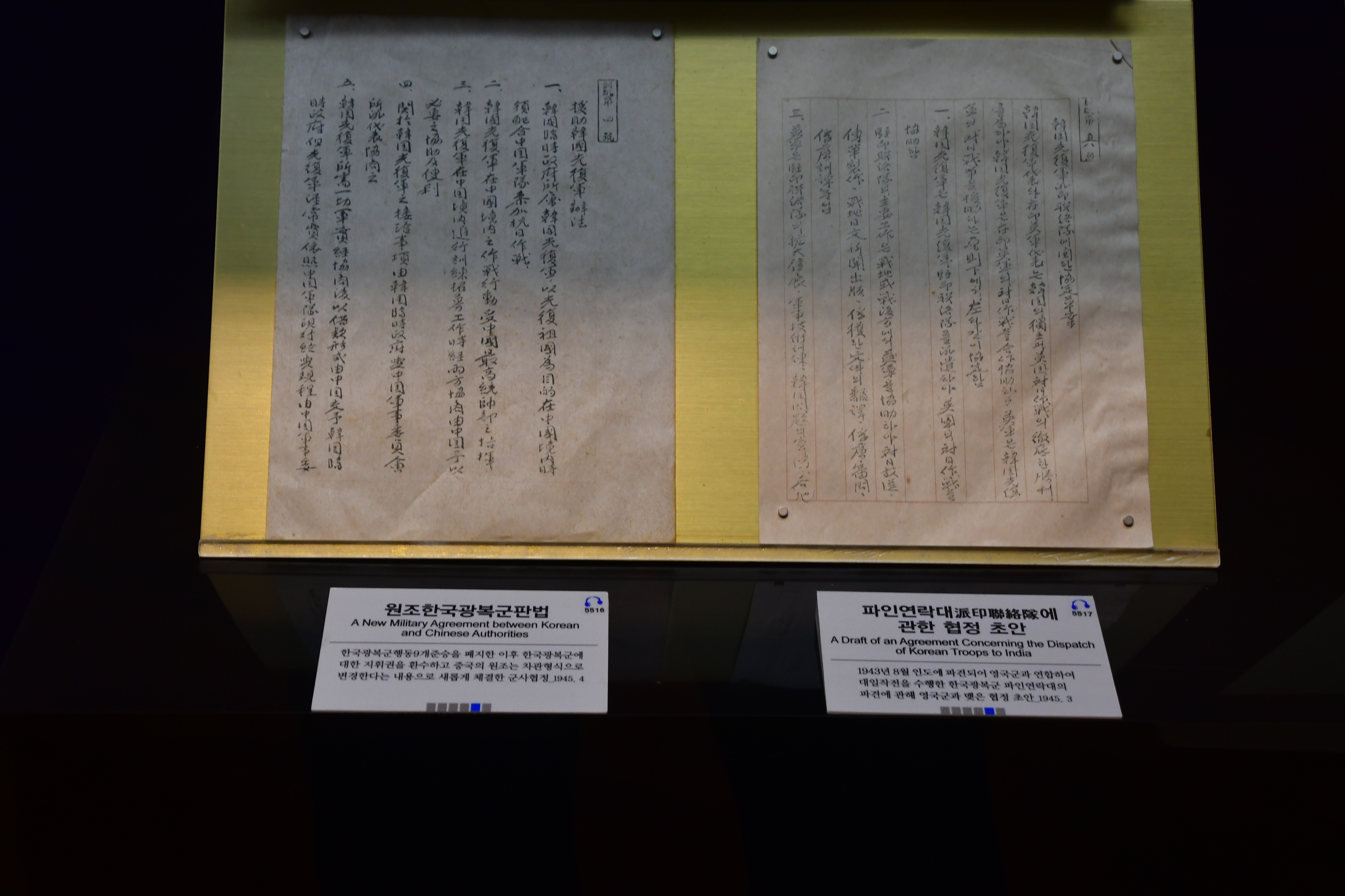- 1943년 8월 인도에 파견되어 영국군과 연합하여 대일작전을 수행한 한국광복군 파인연락대의 파견에 관해 영국군과 맺은 형정 초안. <1945.3.>