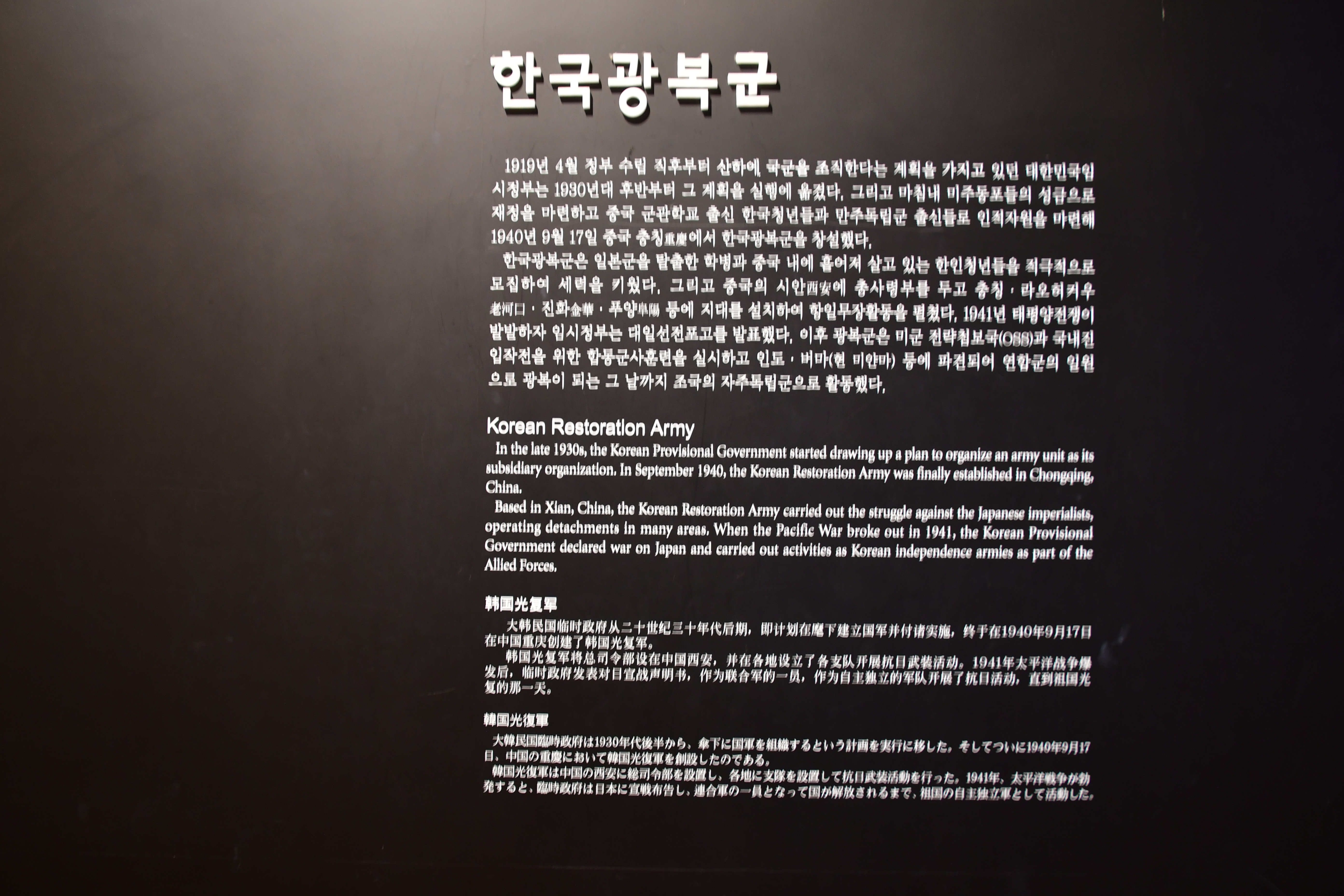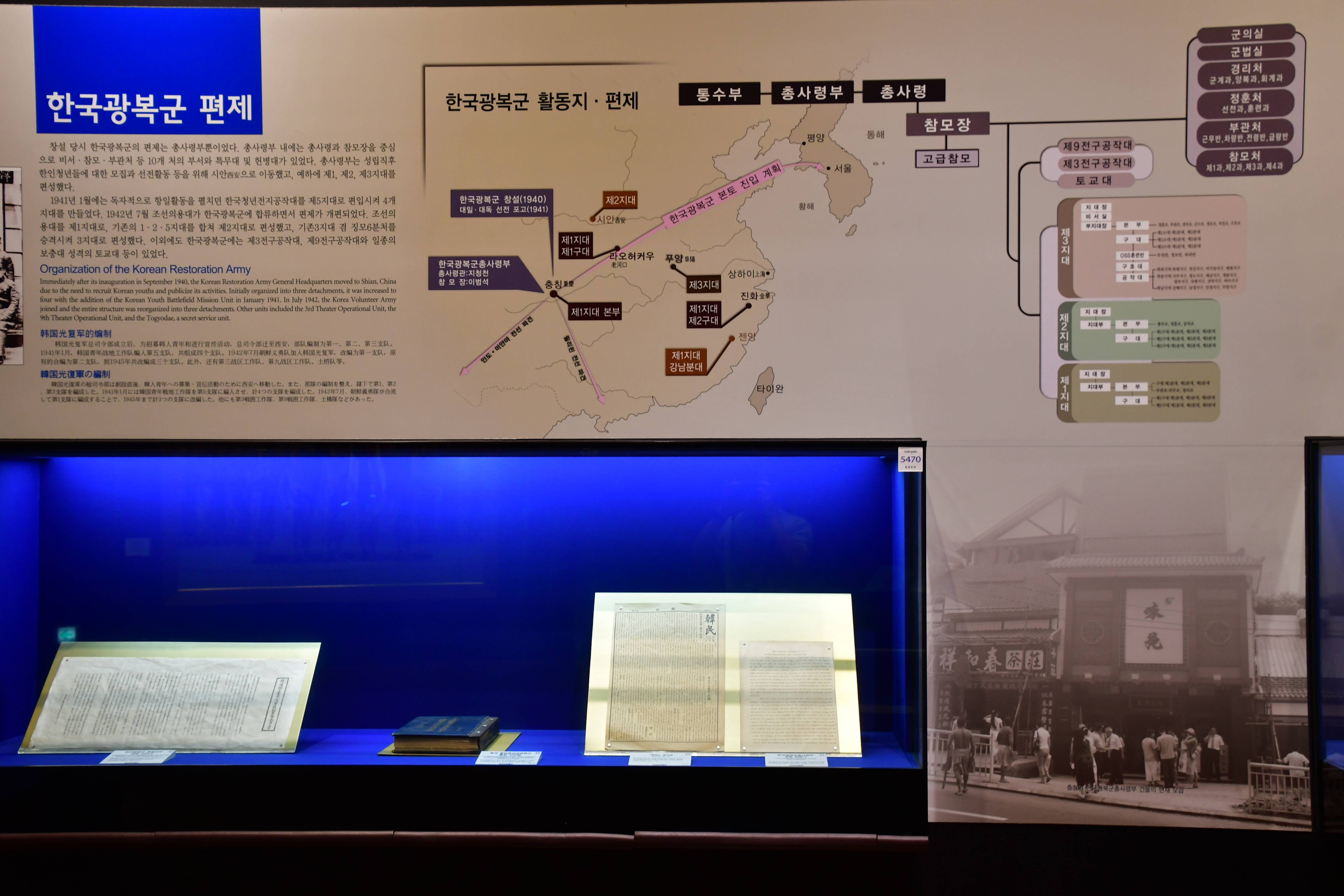한국광복군은 일본군을 탈출한 학병과 중국 내에 흩어져 살고 있는 한인청년들을 적극적으로 모집하여 새력을 키웠다. 그리고 중국 시안西安에 총사령부를 두고 충칭·라오허커우·진화·푸양 등에 지대를 설치하여 항일무장활동을 펼쳤다. 1941년 태평양전쟁이 발발하자 임시정부는 대일선전포고를 발표했다. 이후 광복군은 미군 전력첩보관(OSS)과 국내진입작전을 위한 합동군사훈련을 실시하고, 인도·버마(현미얀마) 등에 파견되어 연합군의 일원으로 광복이 그 날까지 조국의 자주독립군으로 활동했다.