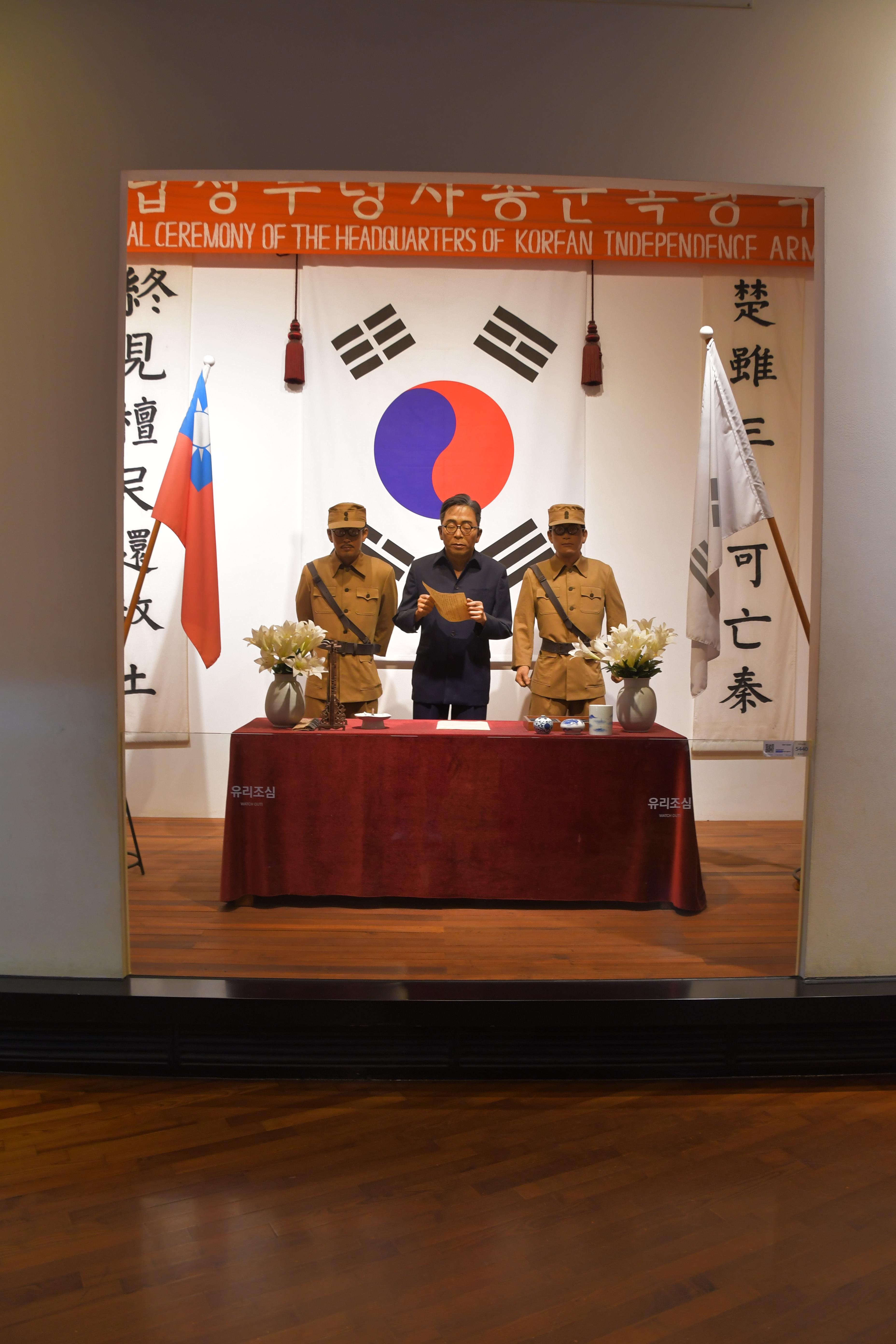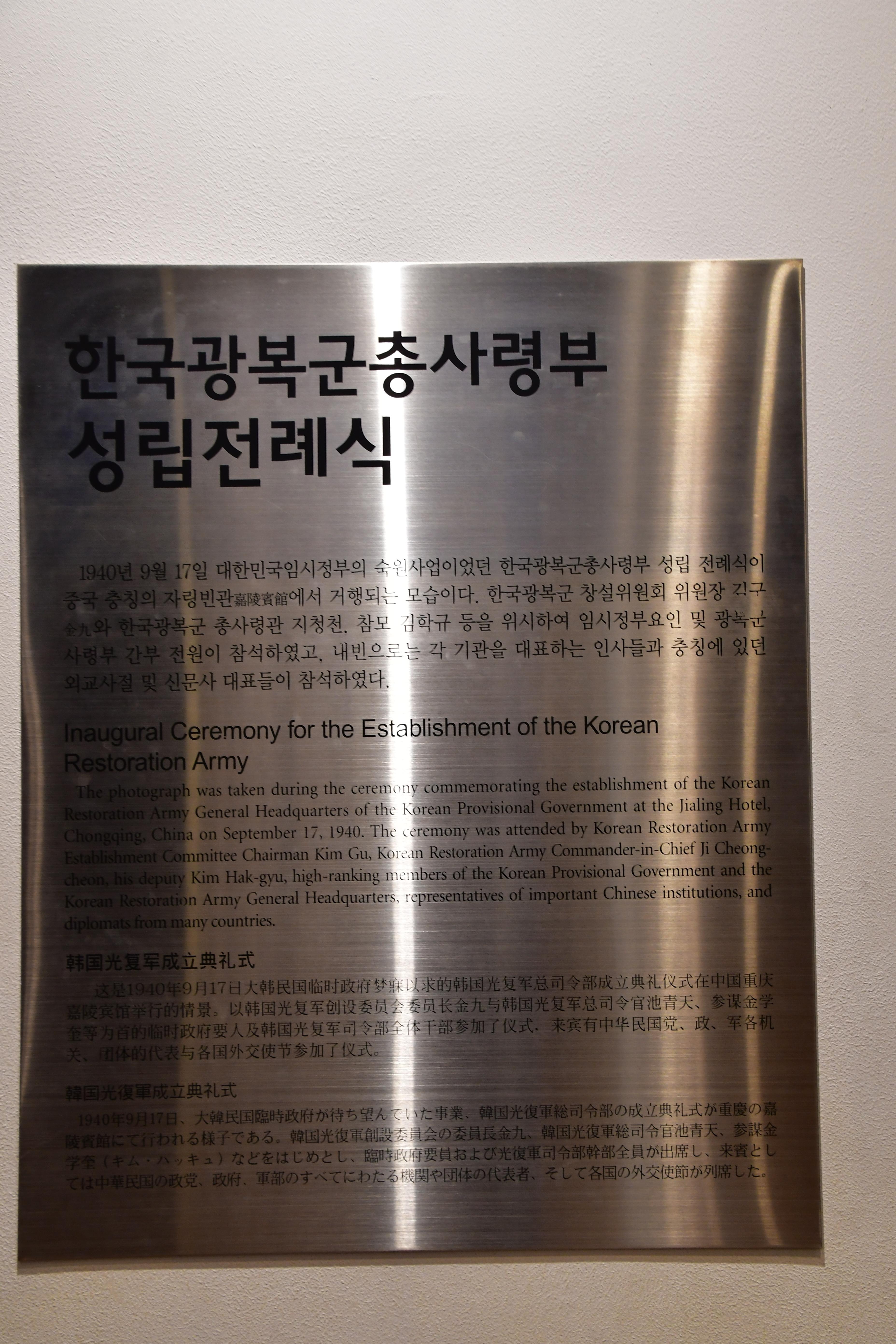 1940년 9월 17일 대한민국임시정부의 숙원사업이었던 한국광복군총사령부 성립 전례식이 중국 충칭의 자링빈관嘉陵賓館에서 거행되는 모습이다. 한국광복군 창설위원회 위원장 김구金九와 한국광복군 총사령관 지청천, 참모 김학규 등을 위시하여 임시정부요인 및 광복군 사령부 간부 전원이 참석하였고, 내빈으로는 각 기관을 대표하는 인사들과 충칭에 있던 외교사절 및 신문사 대표들이 참석하였다.